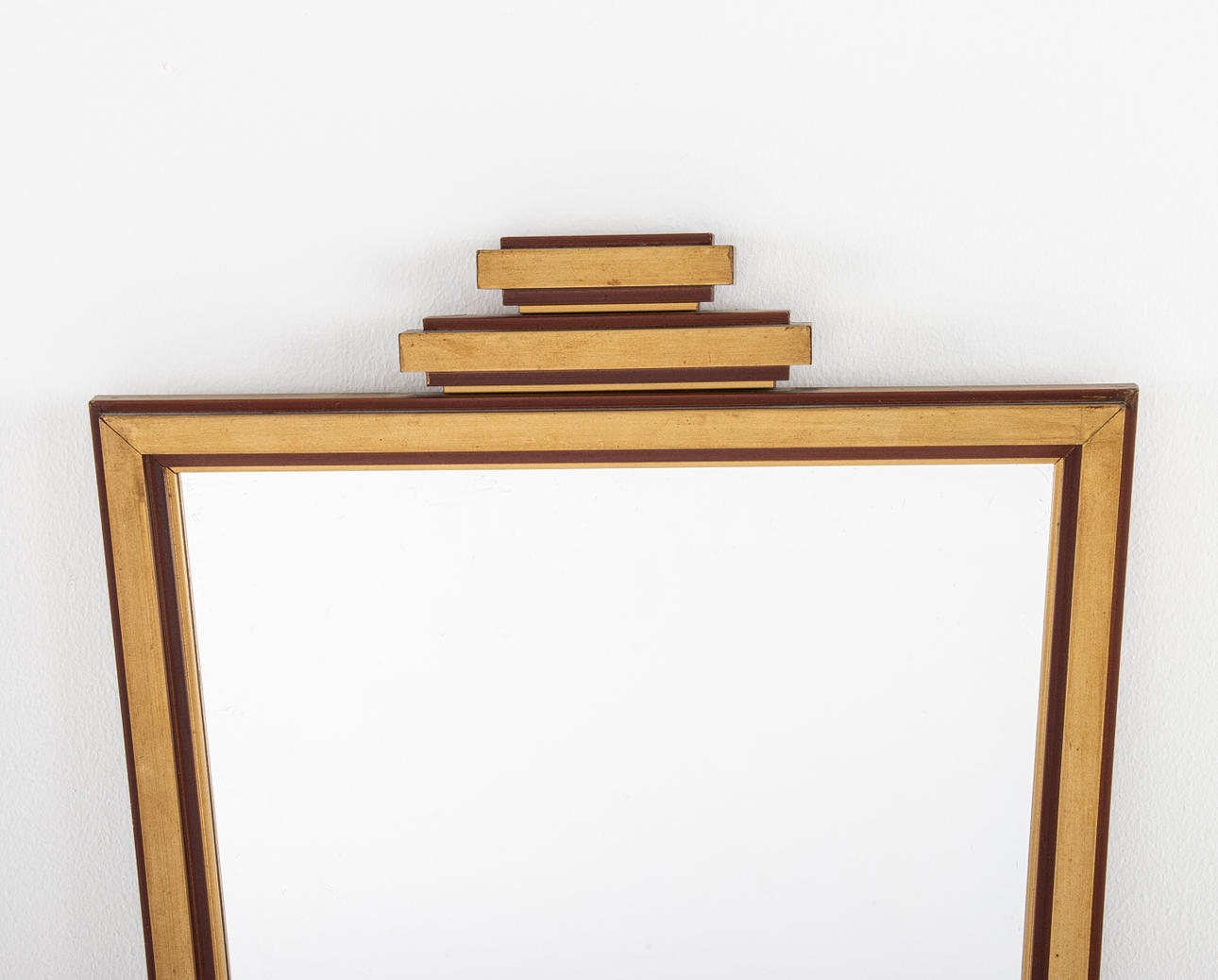 Mirror, painted frame in dark red and bronzed tone. Sweden 1930s. Height 85 cm Width 41 cm.