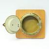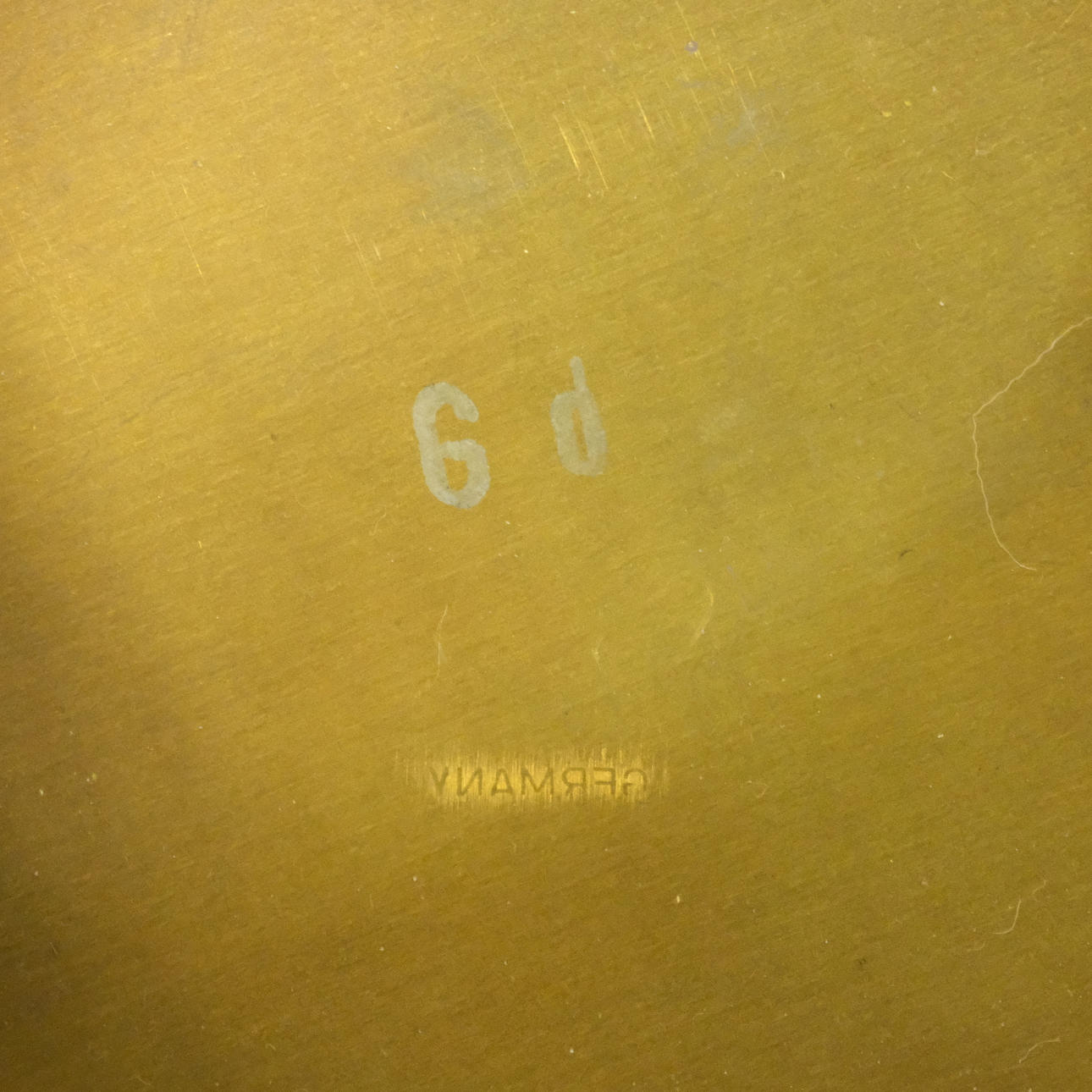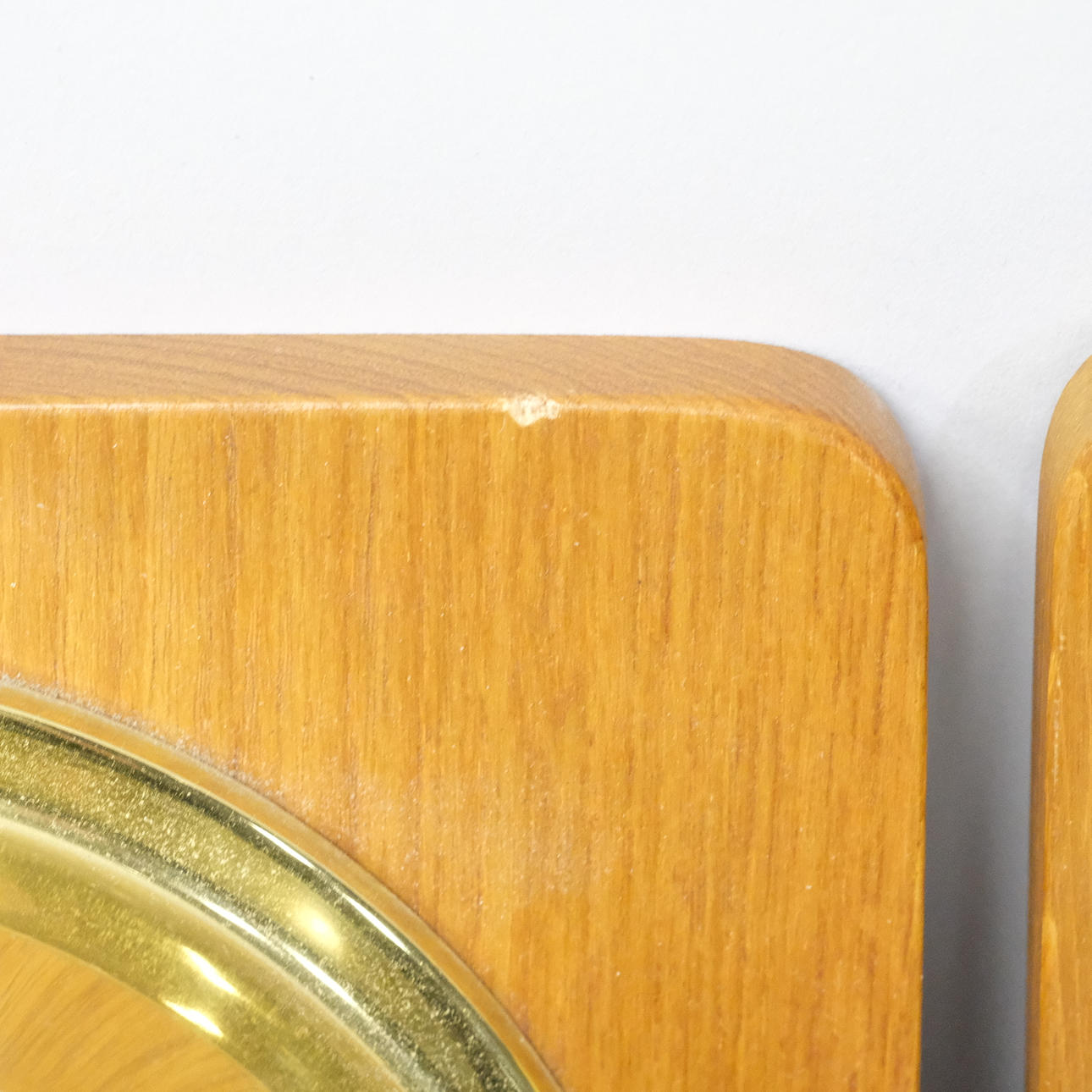 In brass on wooden plates, diameter 13cm.
