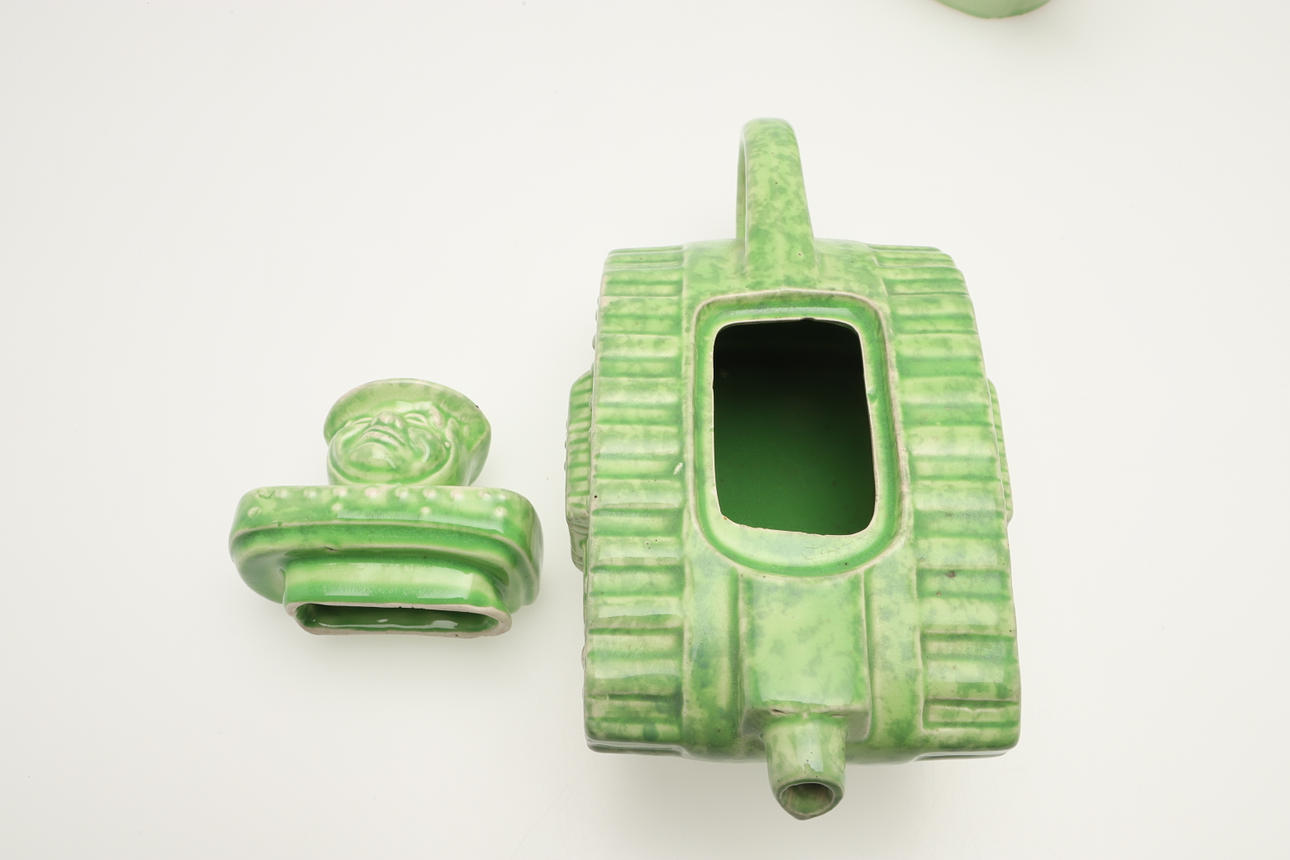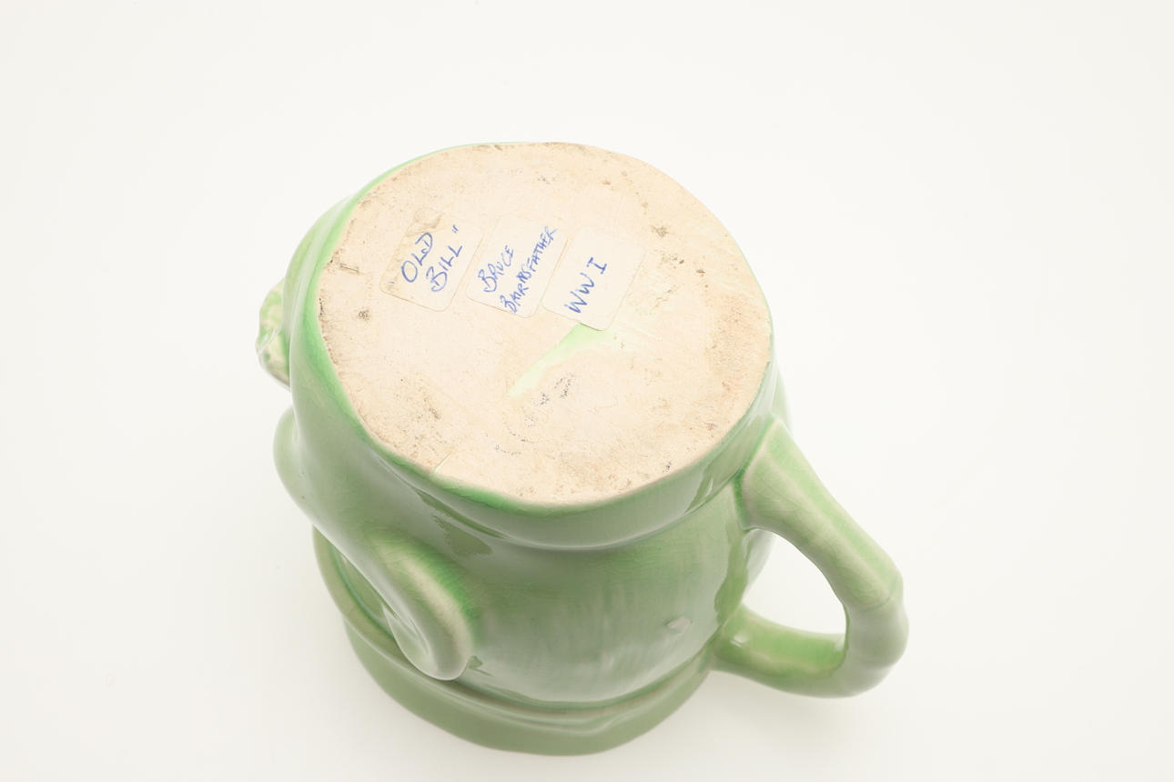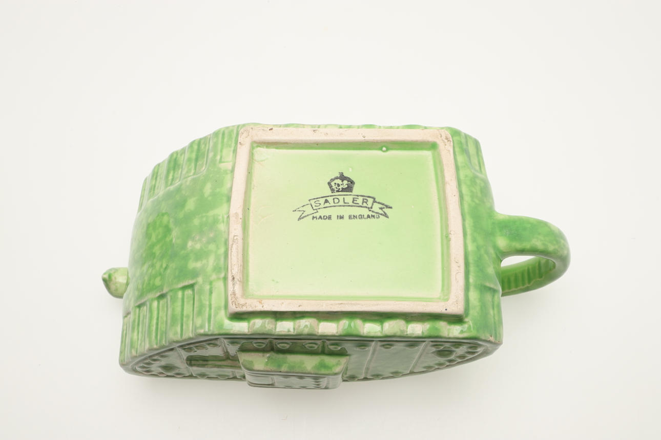 Including a Sadler tank teapot with a green glaze (21.5cms long), and an Old Bill toby jug (11.5cms high). (2).
