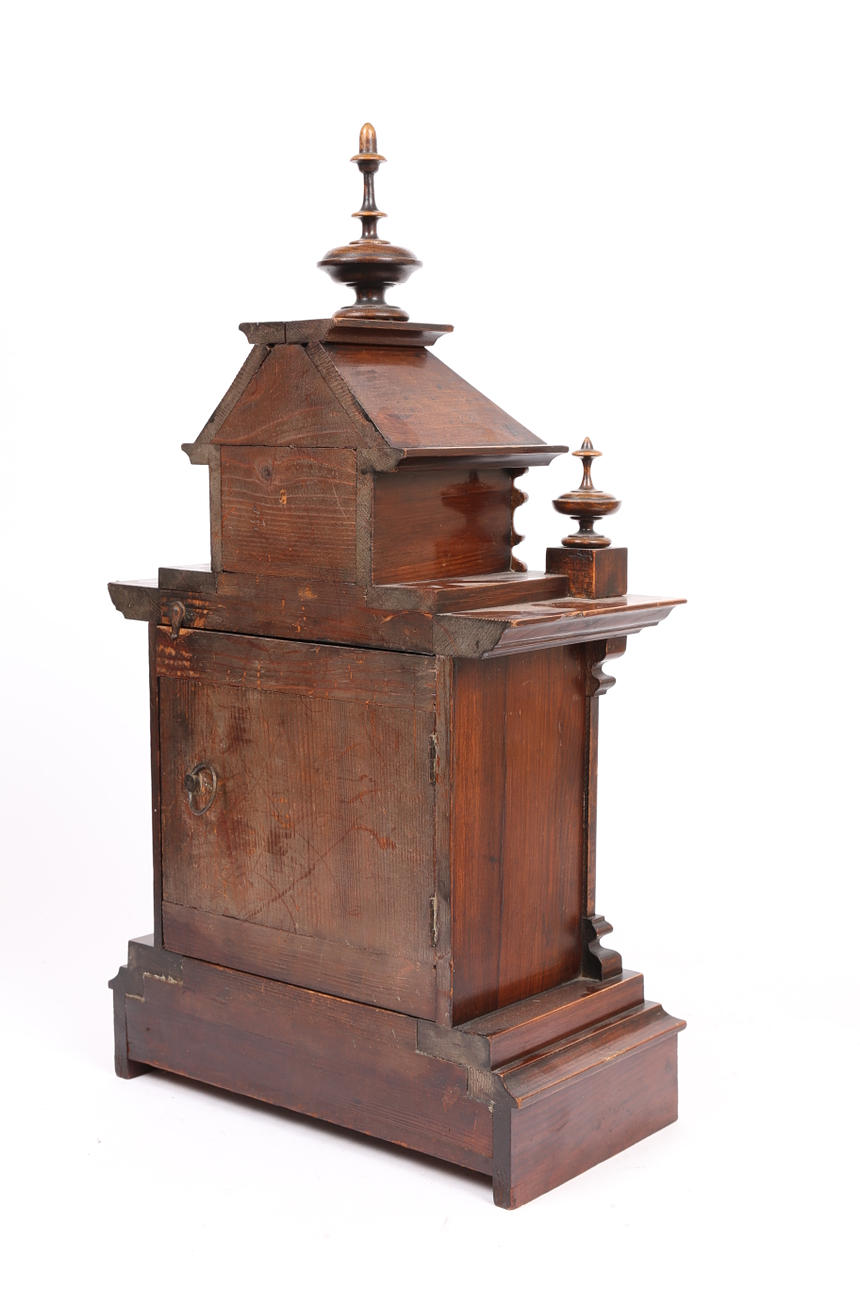 the 4.5 inch circular enamel dial with Roman hours, with half-hourly strike on a gong, in a square section pillared case, together with pendulum, 54cm high, 29cm wide.