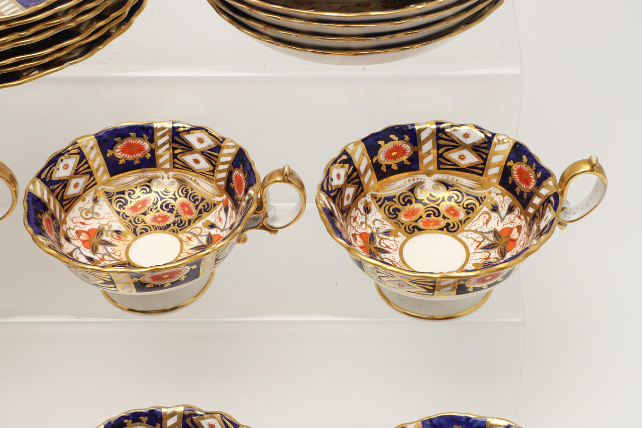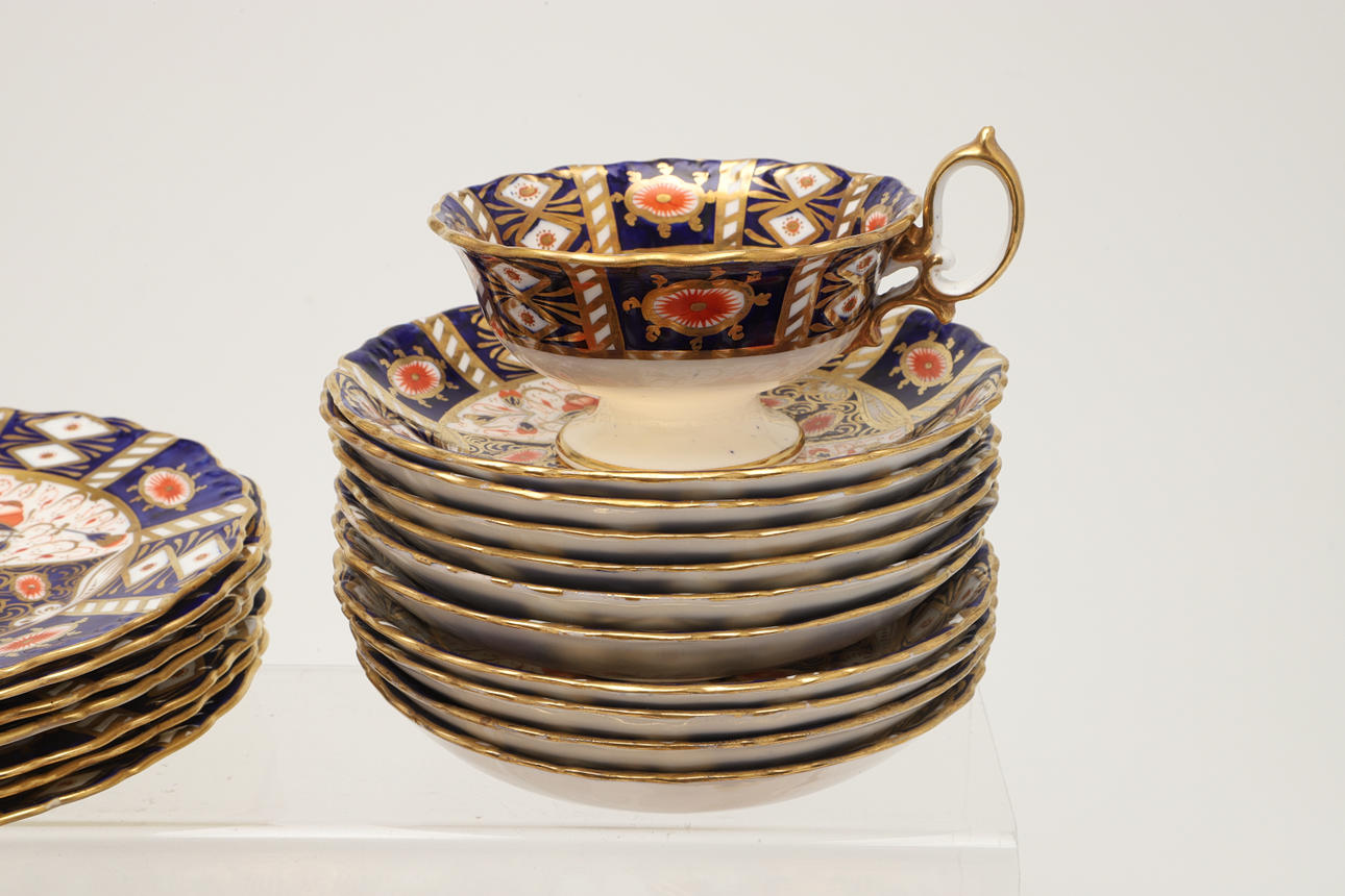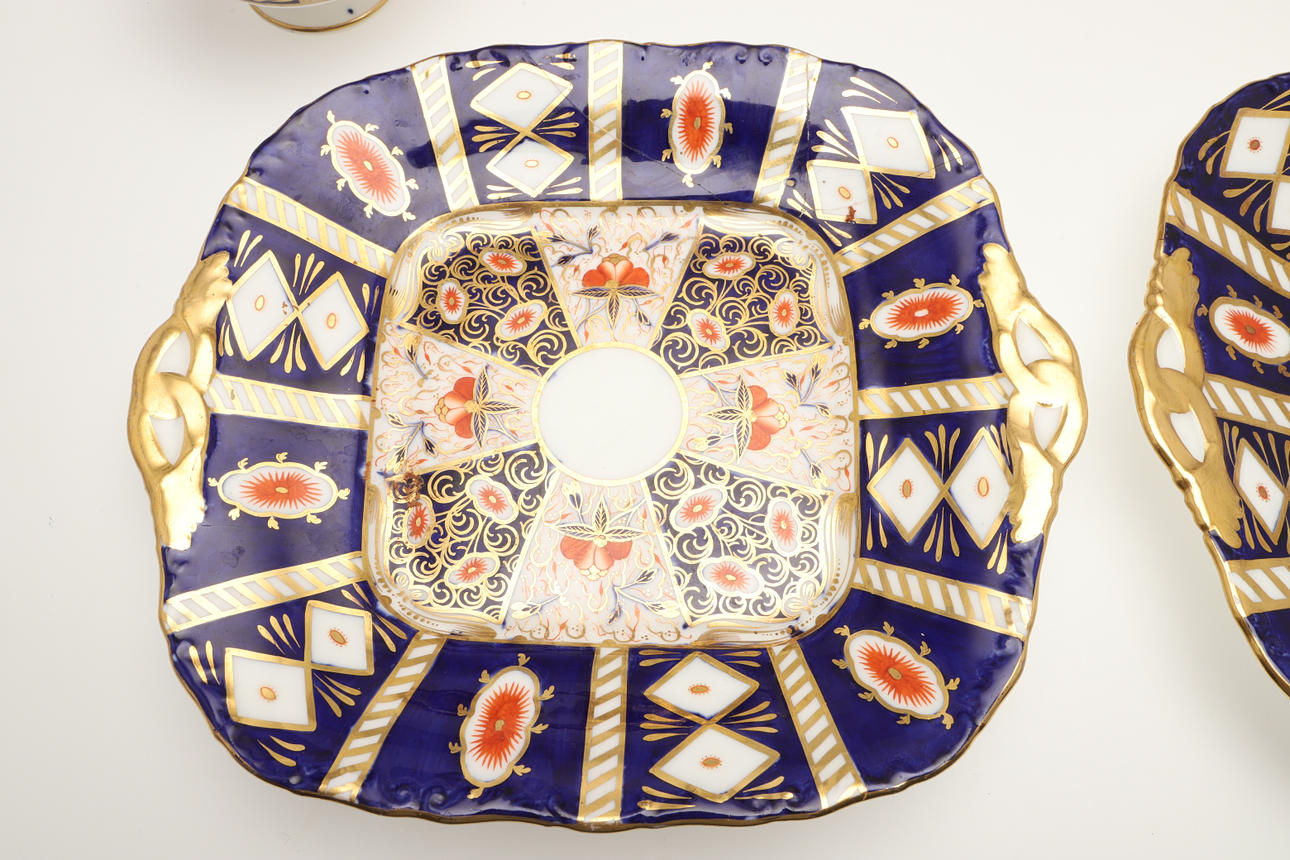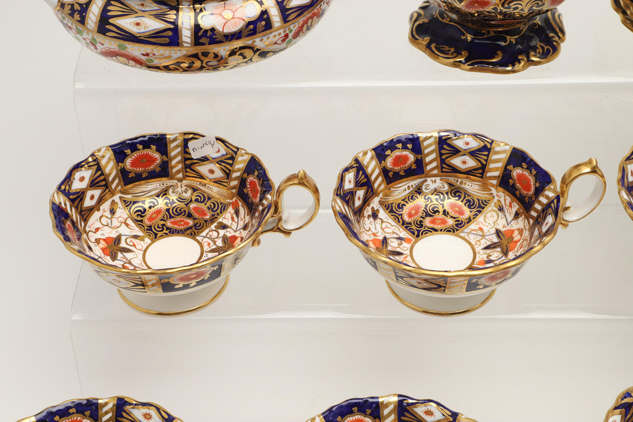An Imari part service, comprising 12 cups, 10 saucers, 7 side plates, sugar bowl, two side plates and a sugar bowl. Also with an unmarked lidded sugar bowl in an Imari pattern, various damages and repairs.
