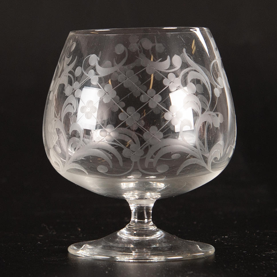 COGNAC CUPS. 6 pcs, etched decor.