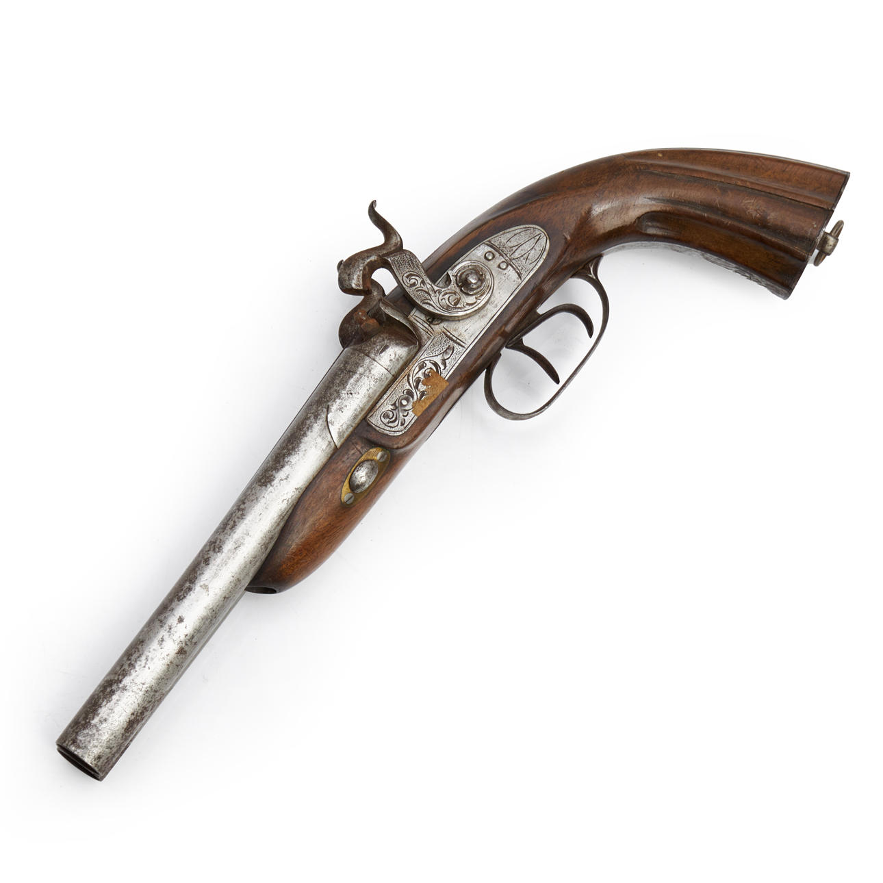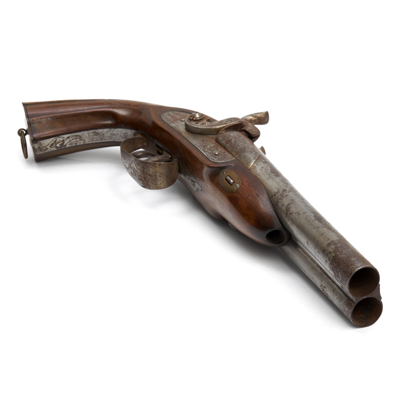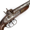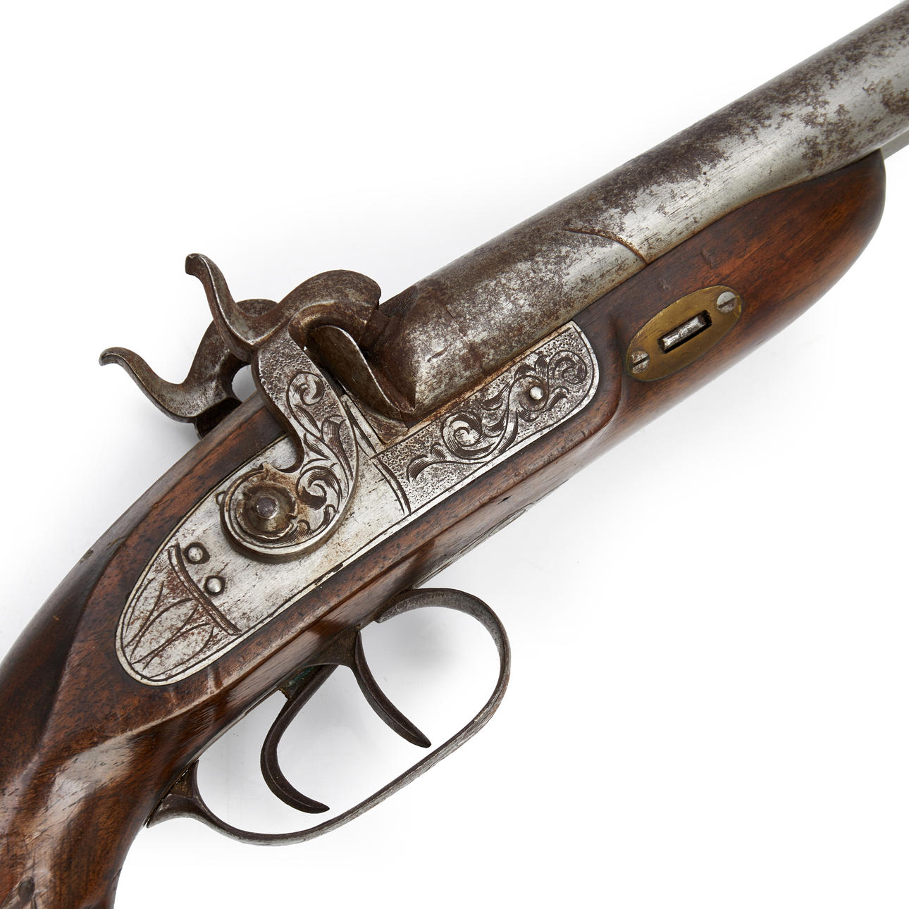 Fittings with engraving, cut walnut stock, Pipe length 19cm, total 36cm. Caliber 12mm. Spans in two and 1 position, respectively.