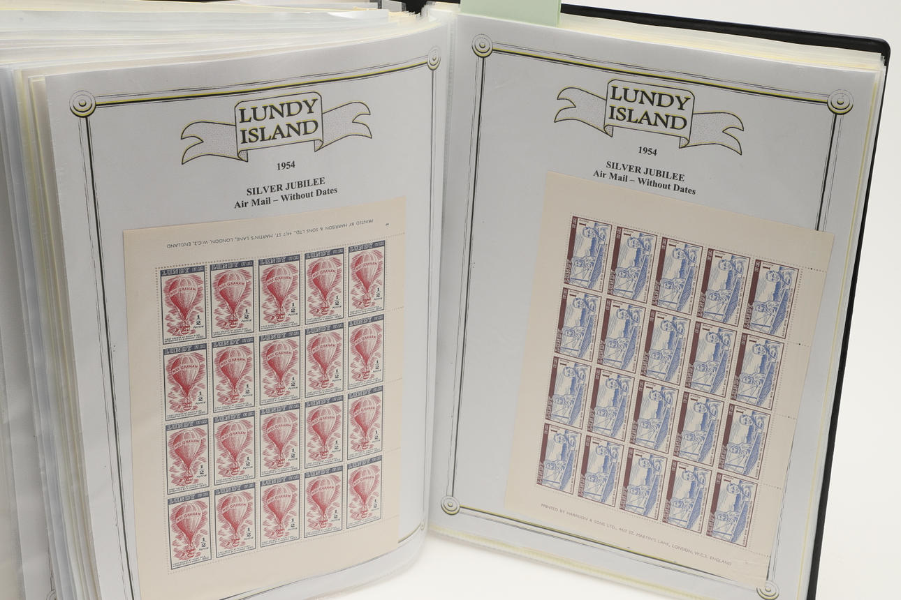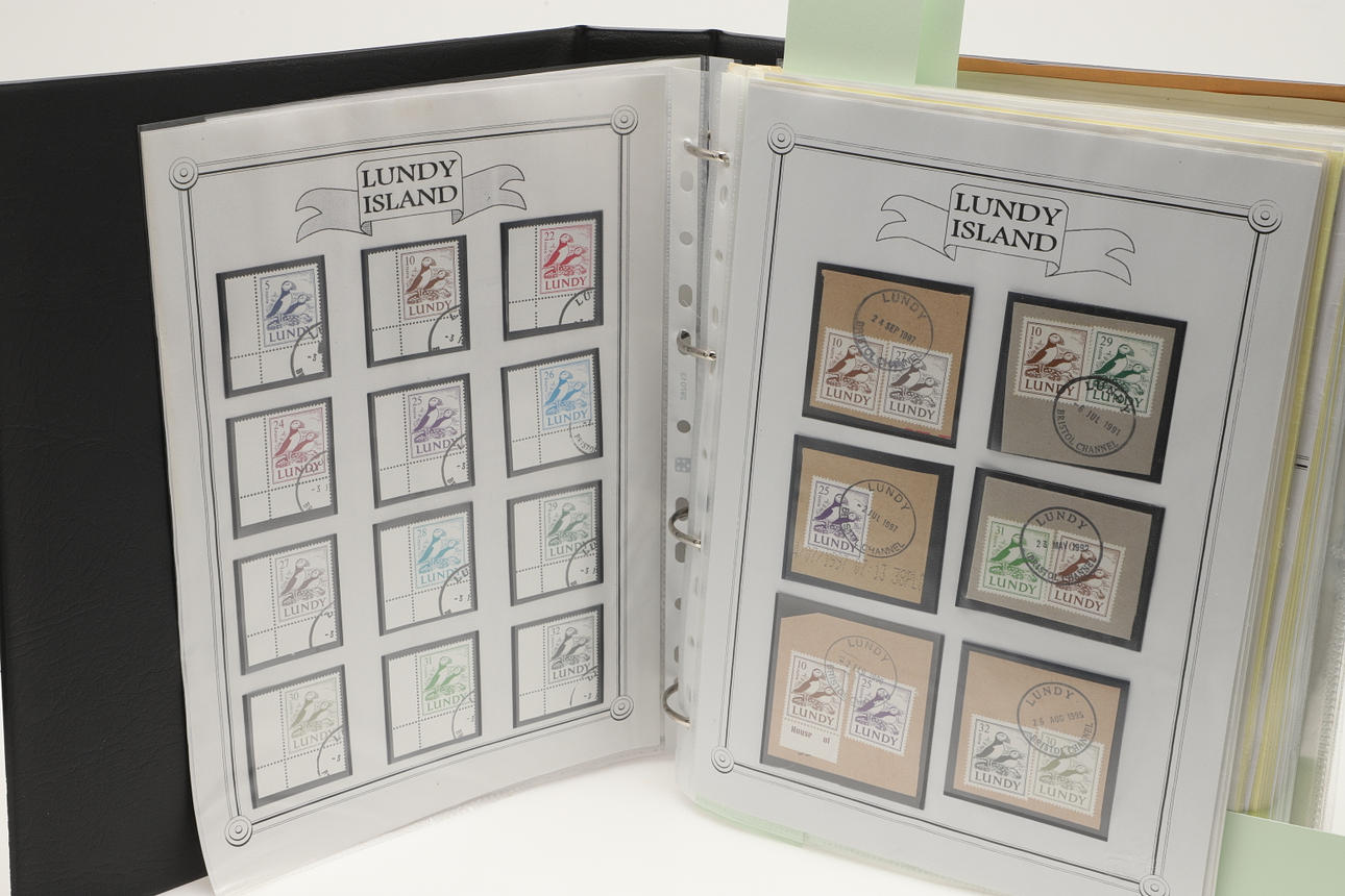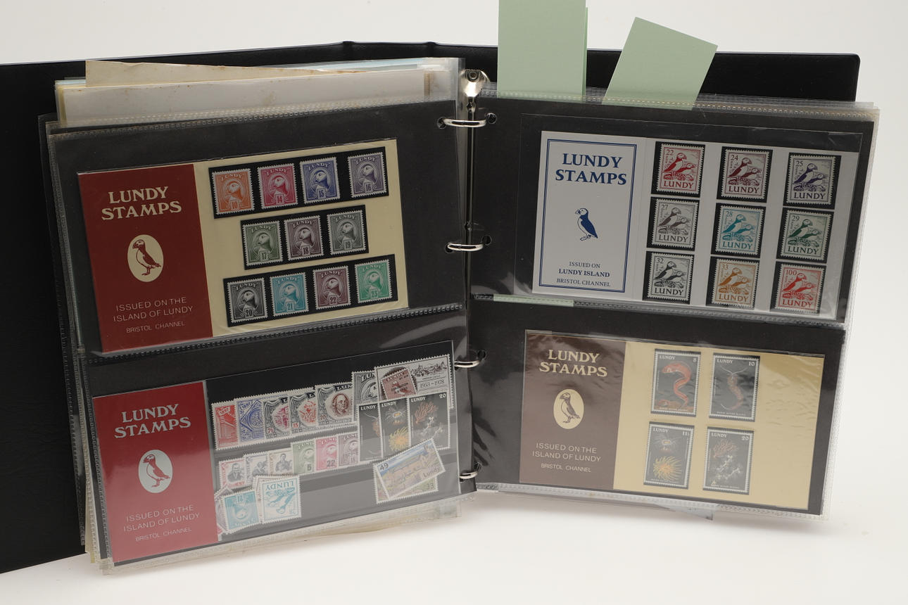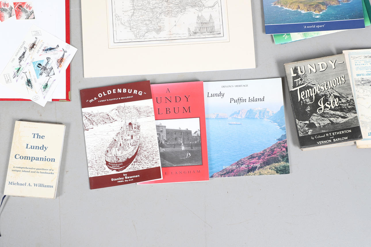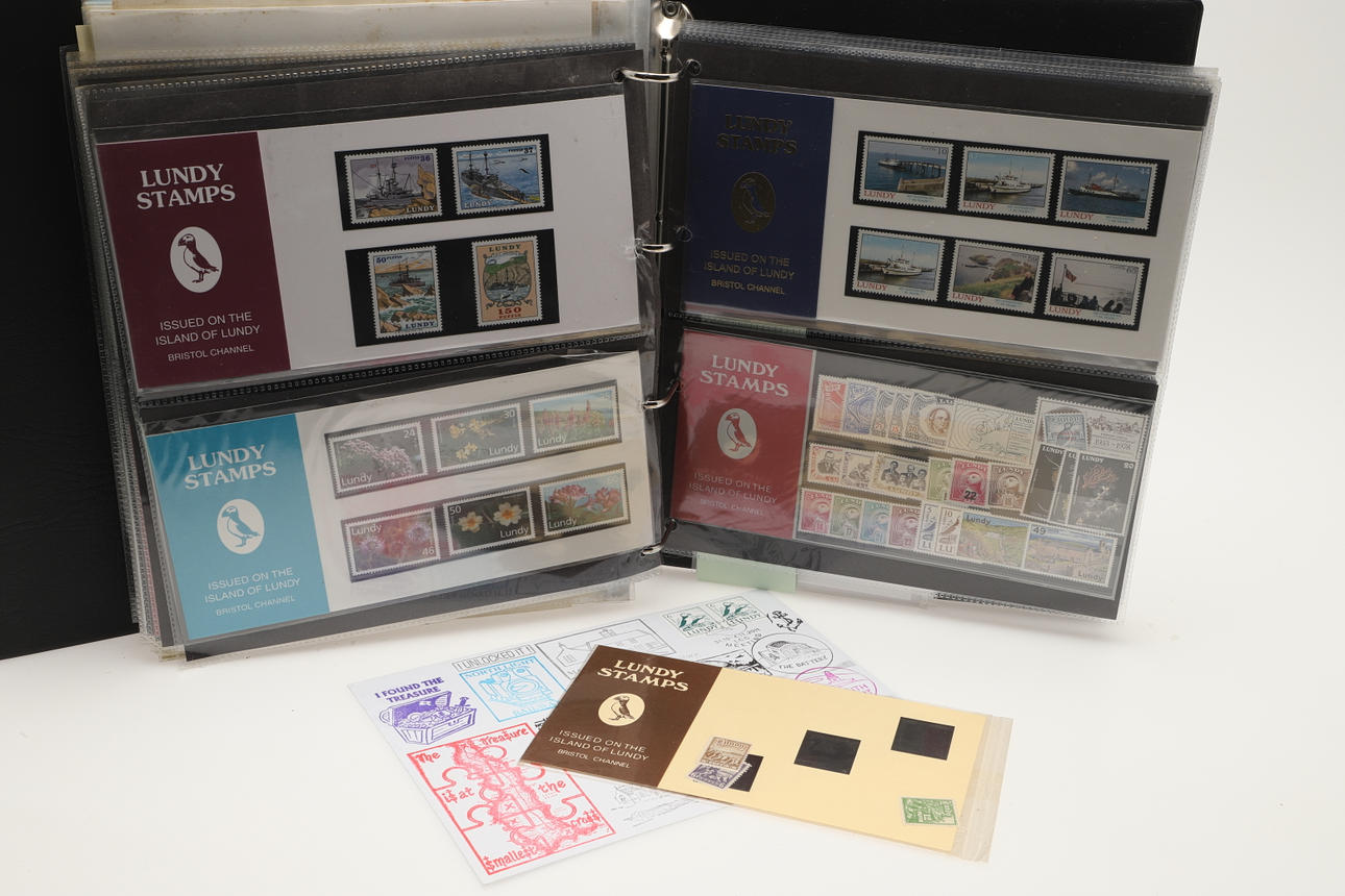 A collection of Lundy related items, including stamp albums with Lundy stamps from 1920's onwards, including Puffin Bust Definitives, RNLI, 1977 Silver Wedding, Overprints, sheets of stamps, First Day Covers covers, 1929 First Definitives, Tram Tickets, Air Services, sheets of stamps, Coronation Overprints, album of Postcards including ships, mint stamp packs, Bogus Issues, Train Tickets, and other items. Also with maps on Lundy, books and other related items.