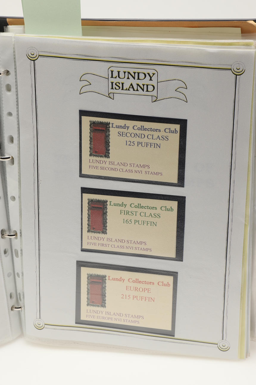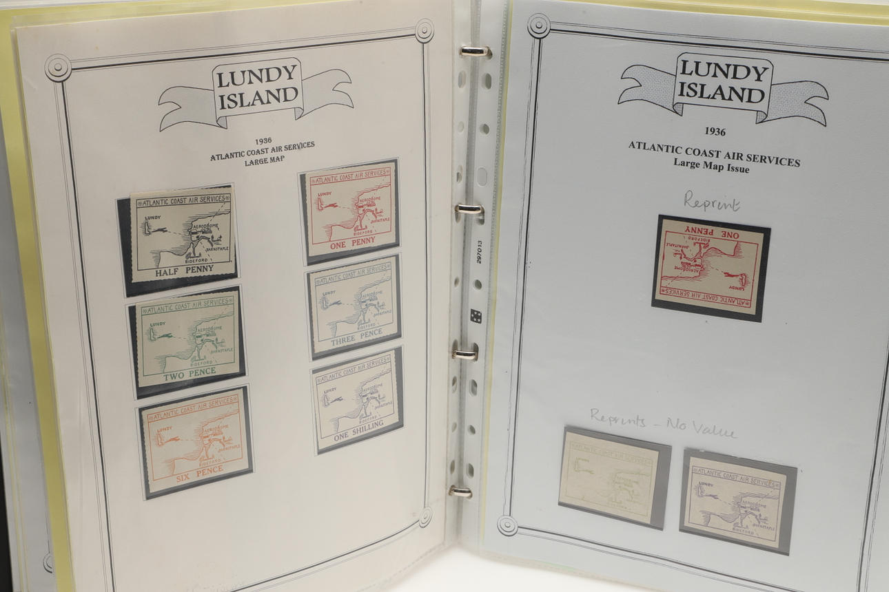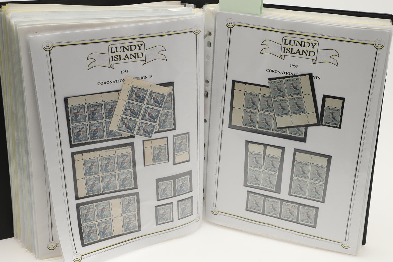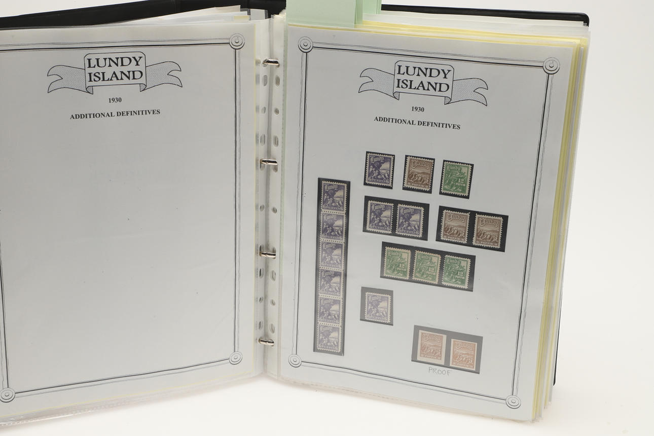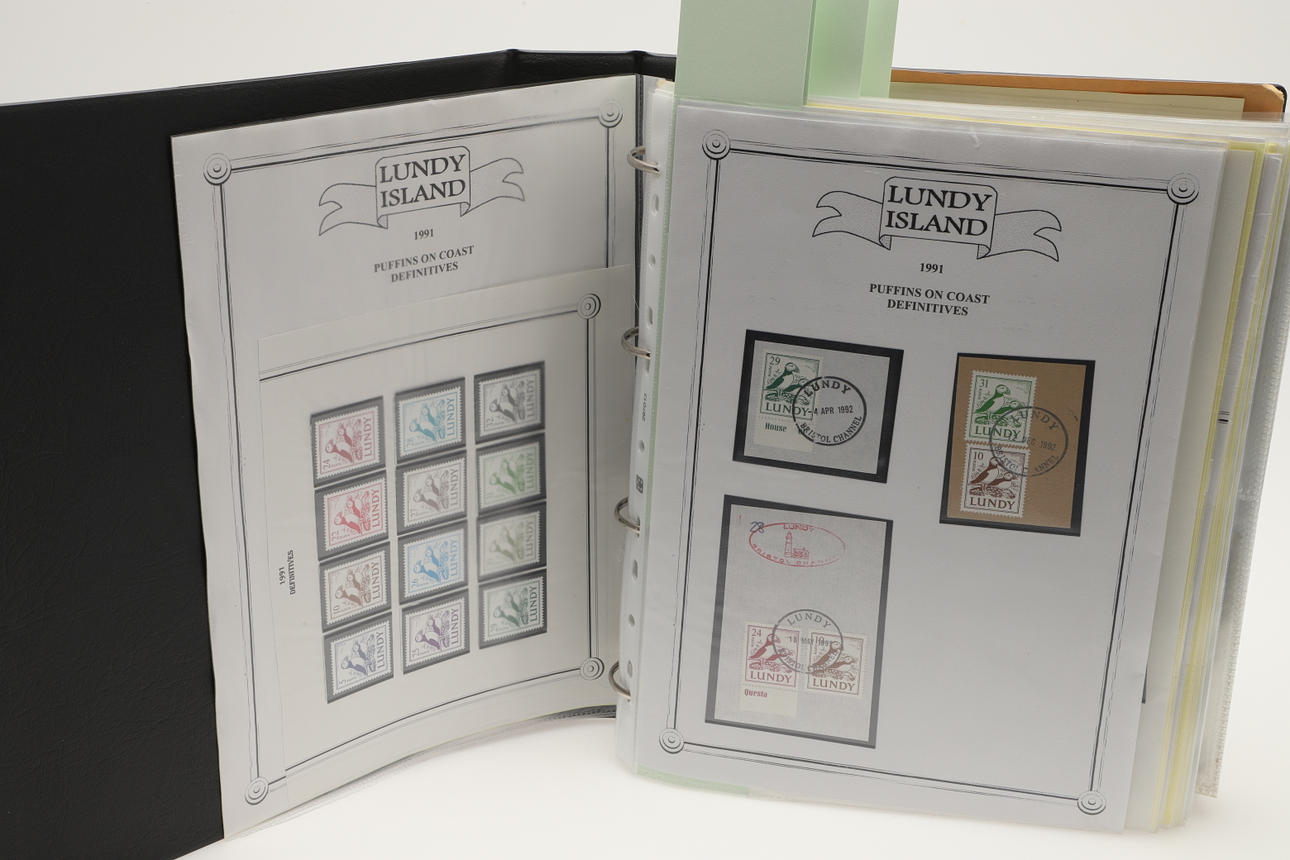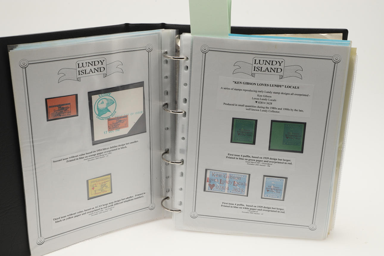 A collection of Lundy related items, including stamp albums with Lundy stamps from 1920's onwards, including Puffin Bust Definitives, RNLI, 1977 Silver Wedding, Overprints, sheets of stamps, First Day Covers covers, 1929 First Definitives, Tram Tickets, Air Services, sheets of stamps, Coronation Overprints, album of Postcards including ships, mint stamp packs, Bogus Issues, Train Tickets, and other items. Also with maps on Lundy, books and other related items.
