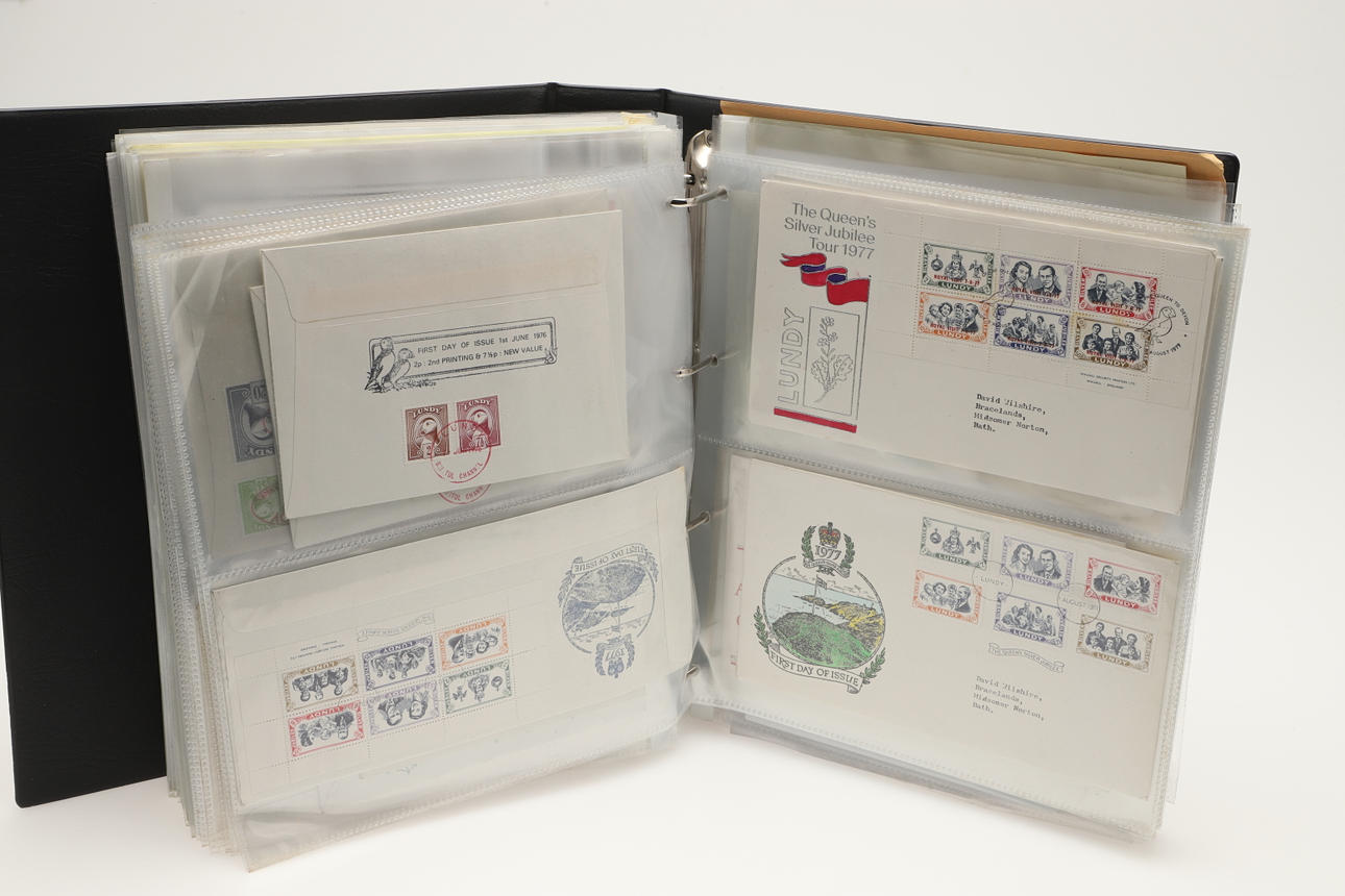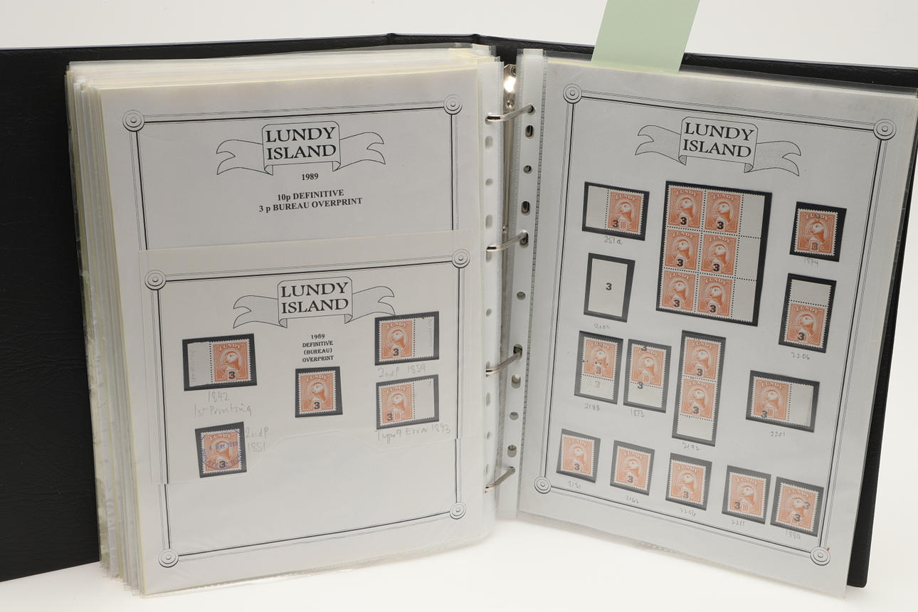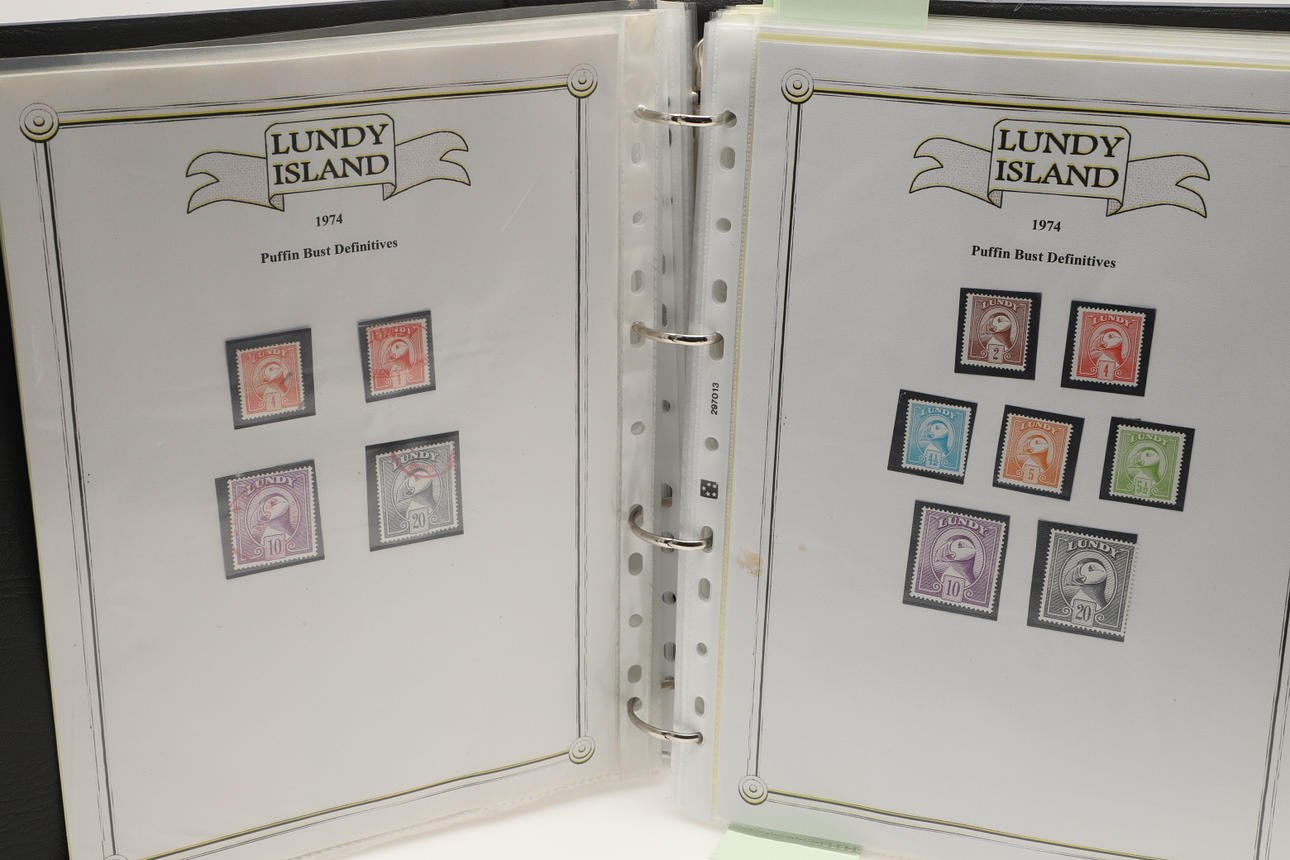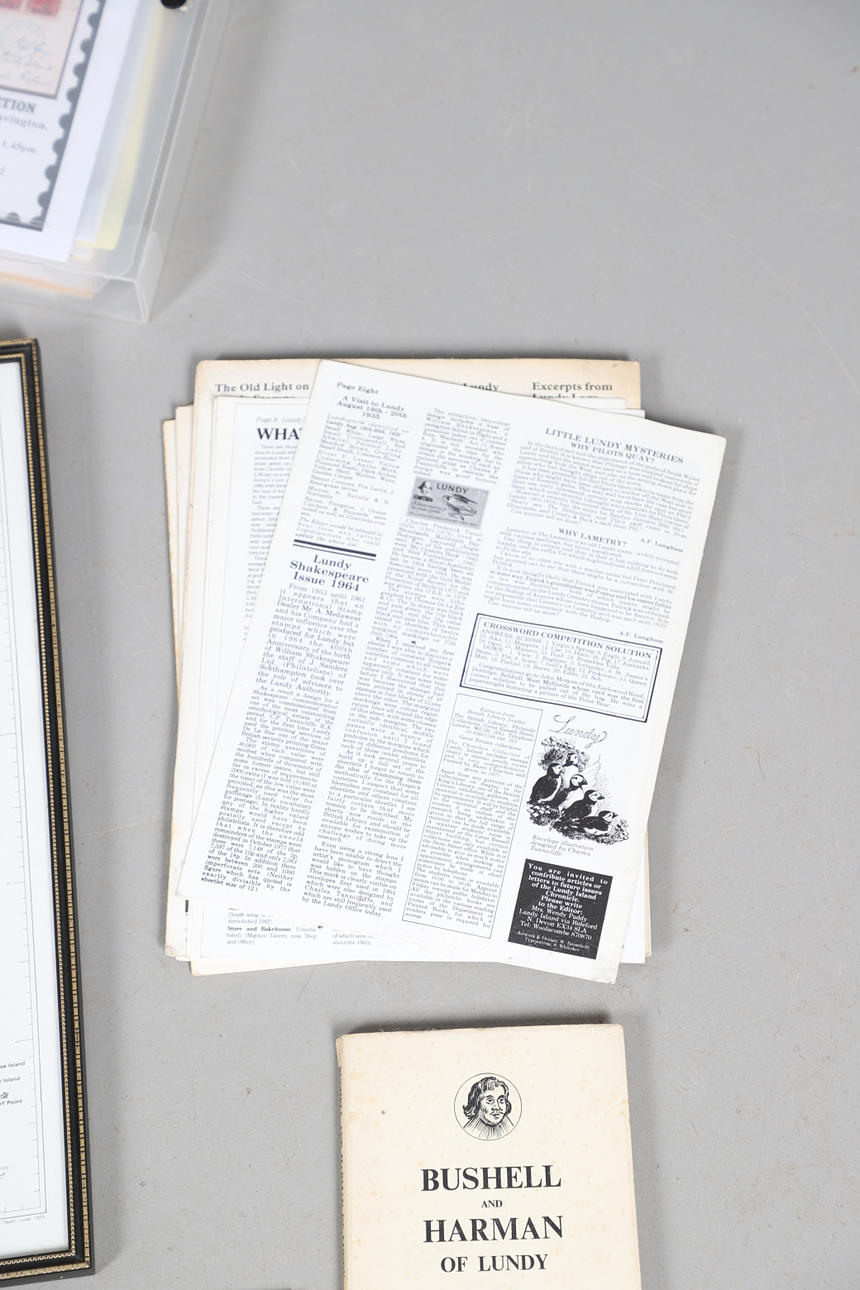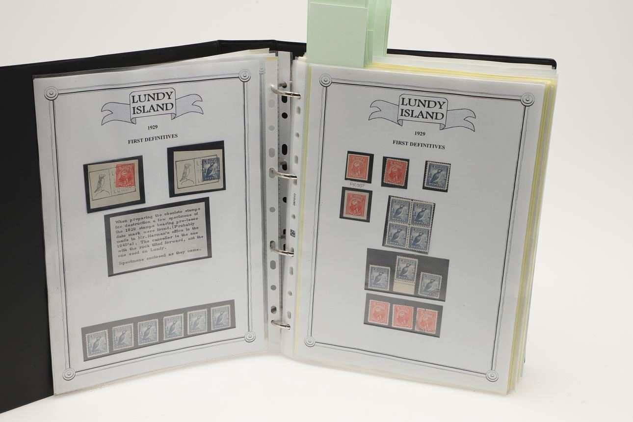 A collection of Lundy related items, including stamp albums with Lundy stamps from 1920's onwards, including Puffin Bust Definitives, RNLI, 1977 Silver Wedding, Overprints, sheets of stamps, First Day Covers covers, 1929 First Definitives, Tram Tickets, Air Services, sheets of stamps, Coronation Overprints, album of Postcards including ships, mint stamp packs, Bogus Issues, Train Tickets, and other items. Also with maps on Lundy, books and other related items.