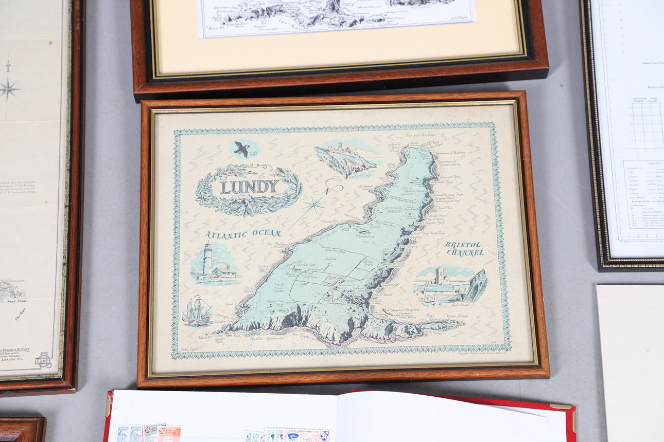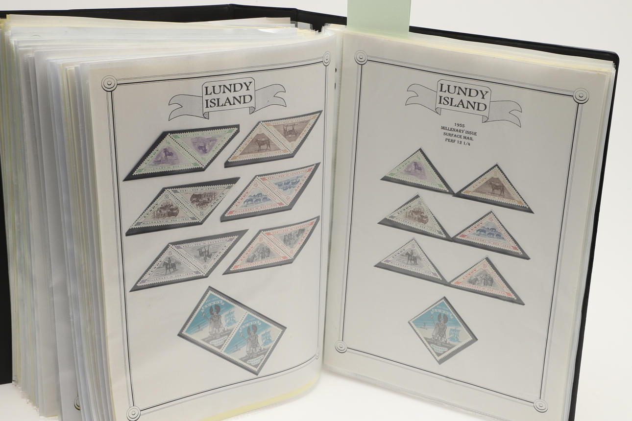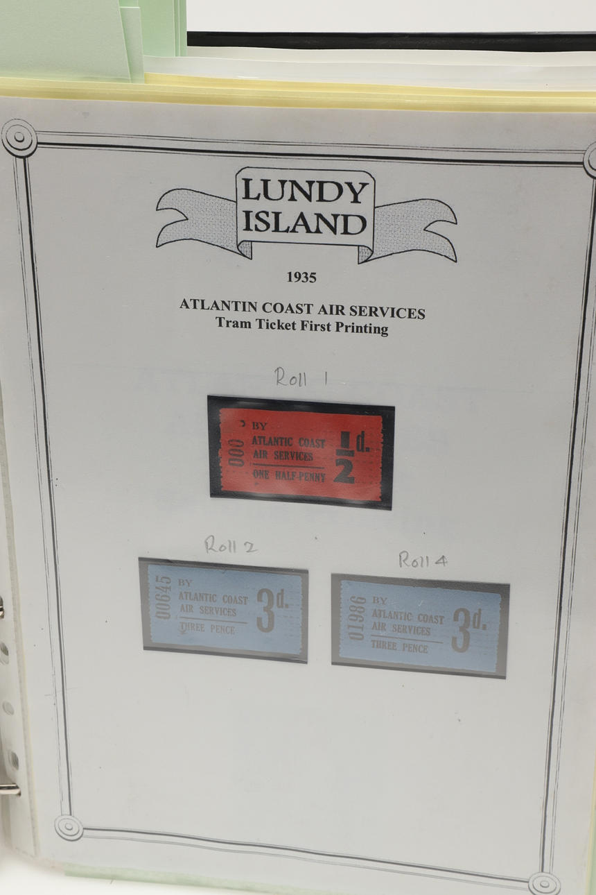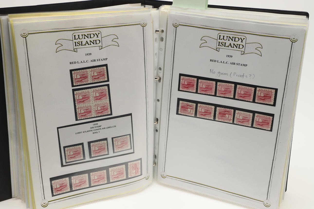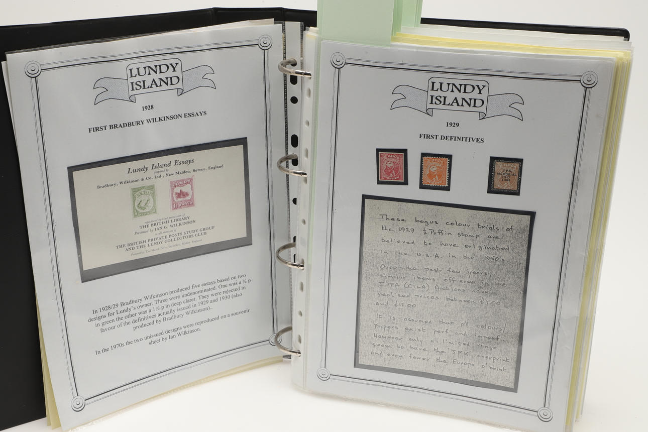 A collection of Lundy related items, including stamp albums with Lundy stamps from 1920's onwards, including Puffin Bust Definitives, RNLI, 1977 Silver Wedding, Overprints, sheets of stamps, First Day Covers covers, 1929 First Definitives, Tram Tickets, Air Services, sheets of stamps, Coronation Overprints, album of Postcards including ships, mint stamp packs, Bogus Issues, Train Tickets, and other items. Also with maps on Lundy, books and other related items.