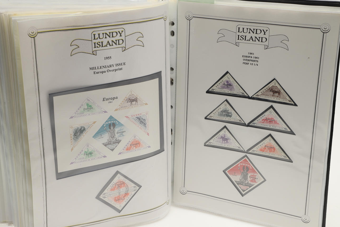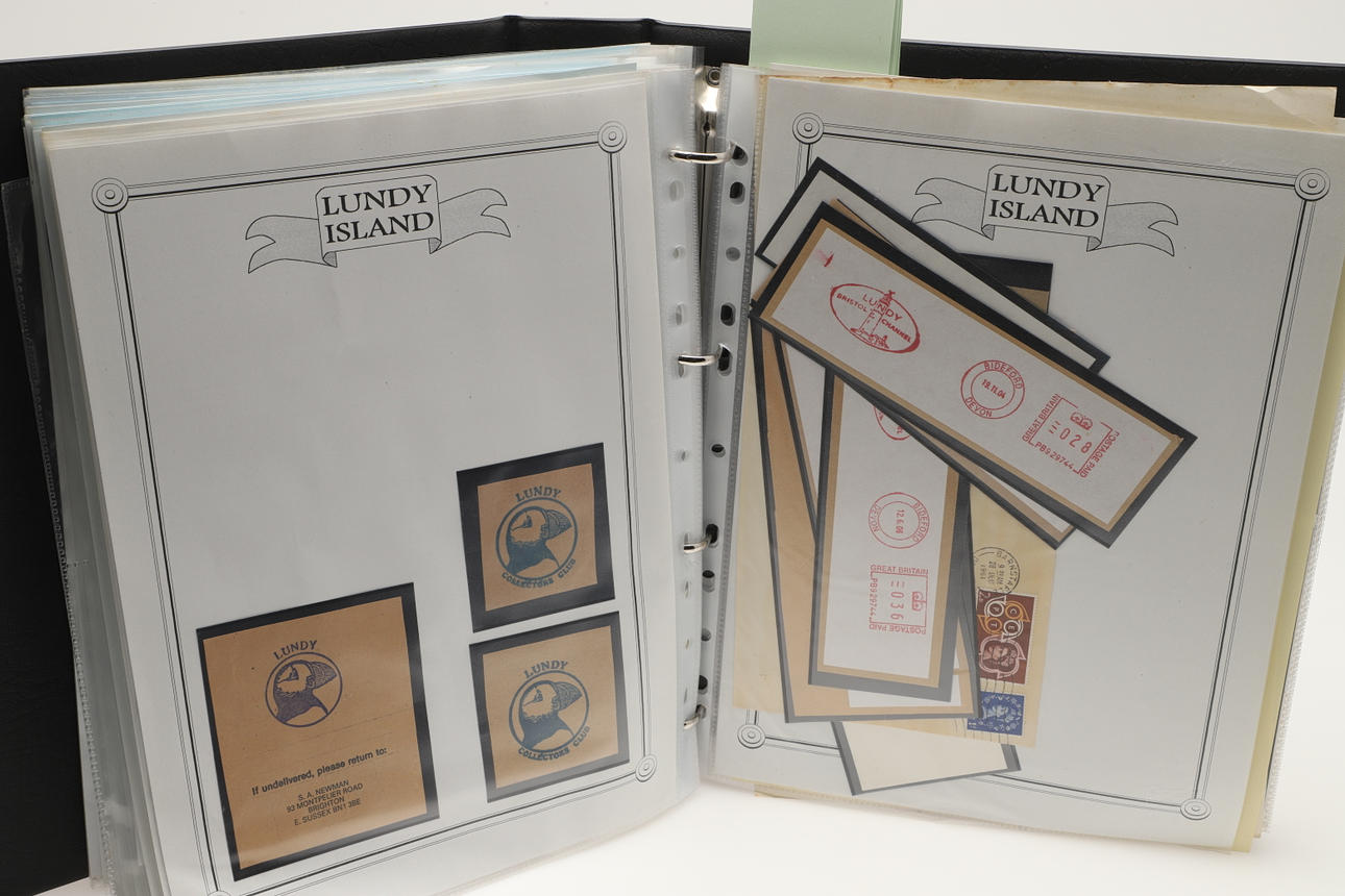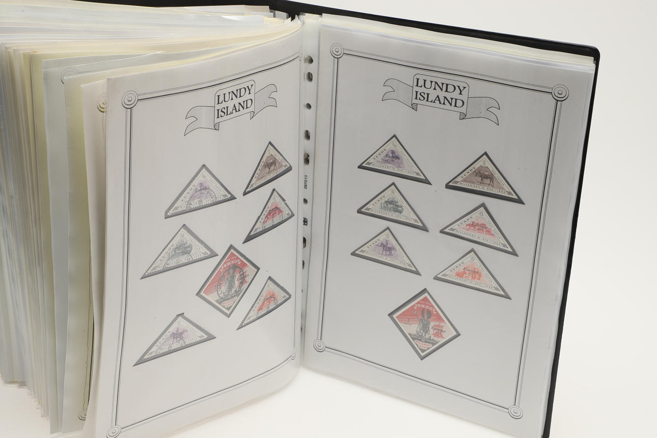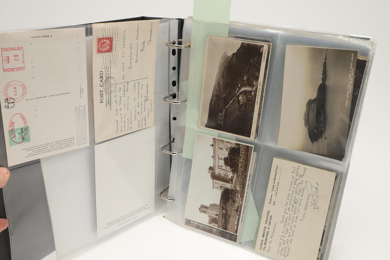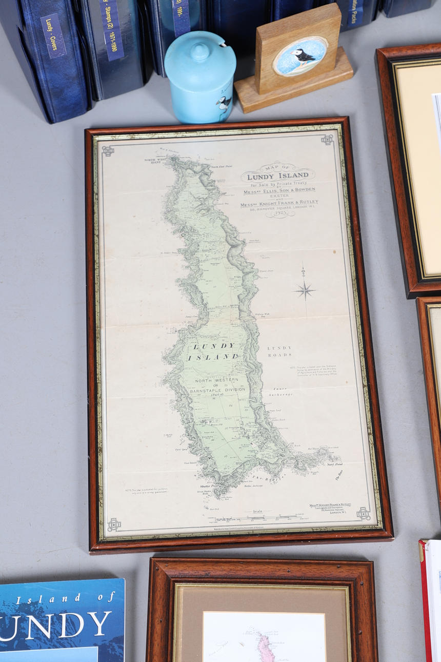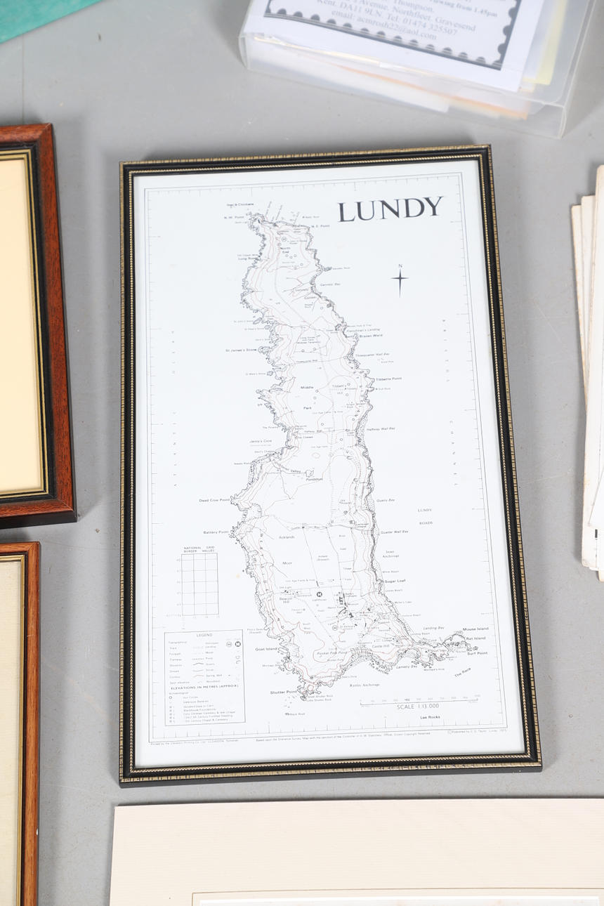 A collection of Lundy related items, including stamp albums with Lundy stamps from 1920's onwards, including Puffin Bust Definitives, RNLI, 1977 Silver Wedding, Overprints, sheets of stamps, First Day Covers covers, 1929 First Definitives, Tram Tickets, Air Services, sheets of stamps, Coronation Overprints, album of Postcards including ships, mint stamp packs, Bogus Issues, Train Tickets, and other items. Also with maps on Lundy, books and other related items.