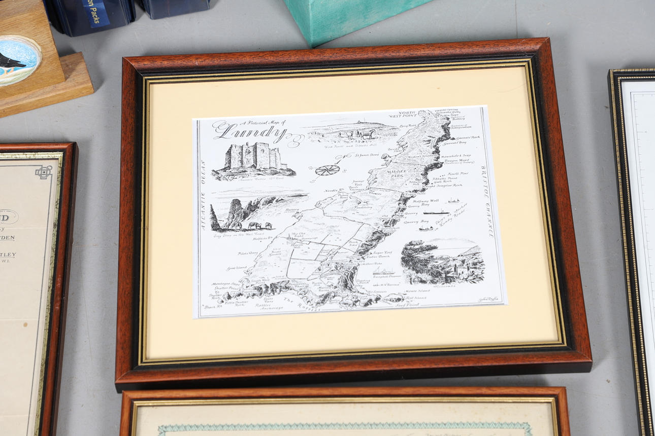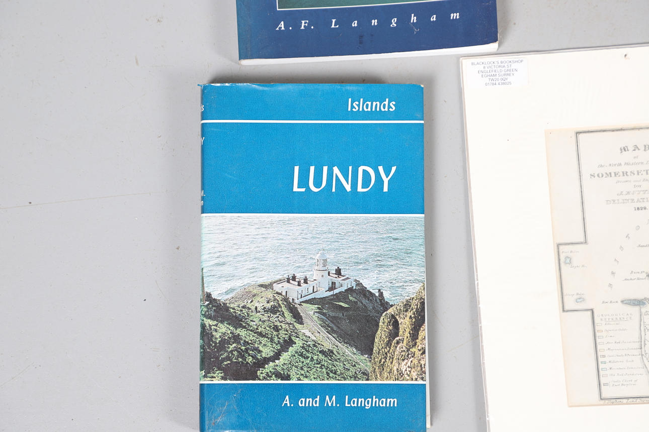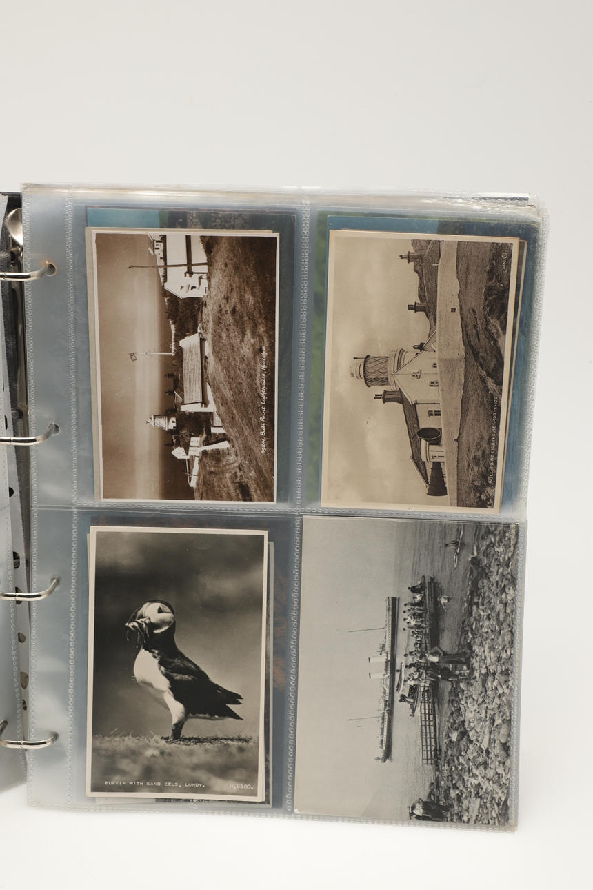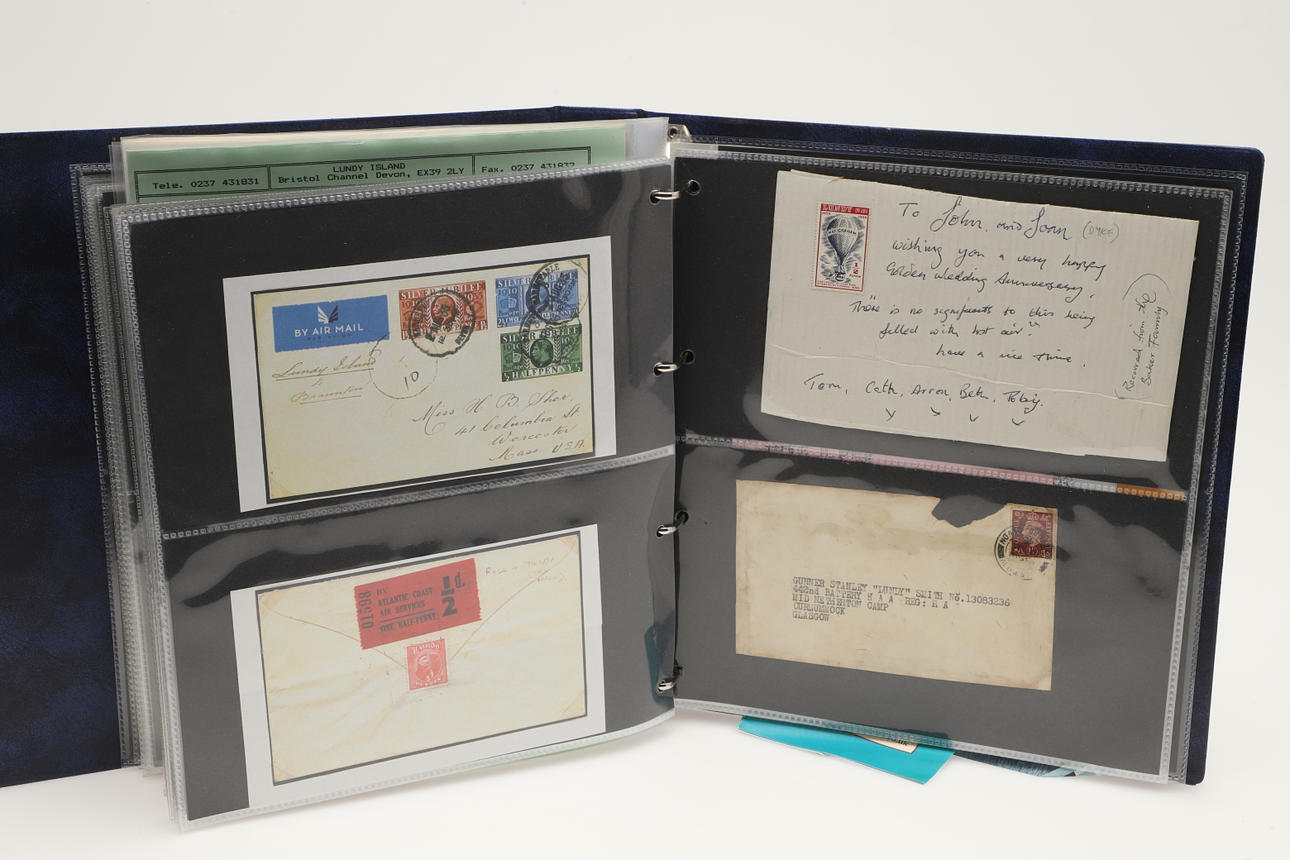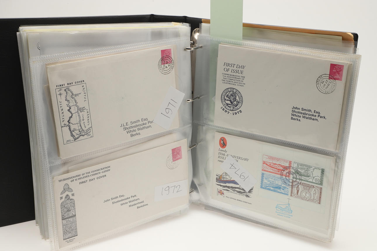 A collection of Lundy related items, including stamp albums with Lundy stamps from 1920's onwards, including Puffin Bust Definitives, RNLI, 1977 Silver Wedding, Overprints, sheets of stamps, First Day Covers covers, 1929 First Definitives, Tram Tickets, Air Services, sheets of stamps, Coronation Overprints, album of Postcards including ships, mint stamp packs, Bogus Issues, Train Tickets, and other items. Also with maps on Lundy, books and other related items.