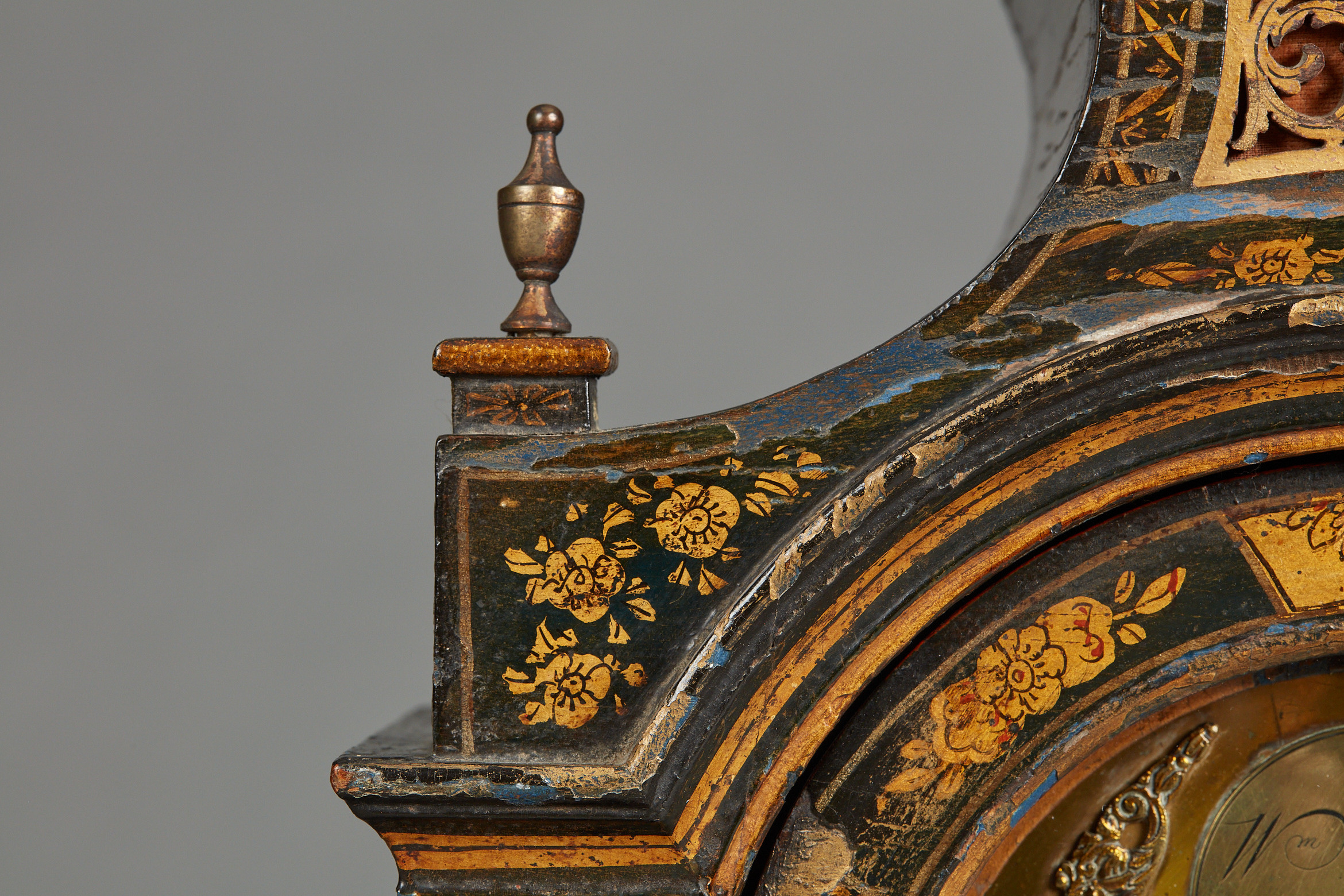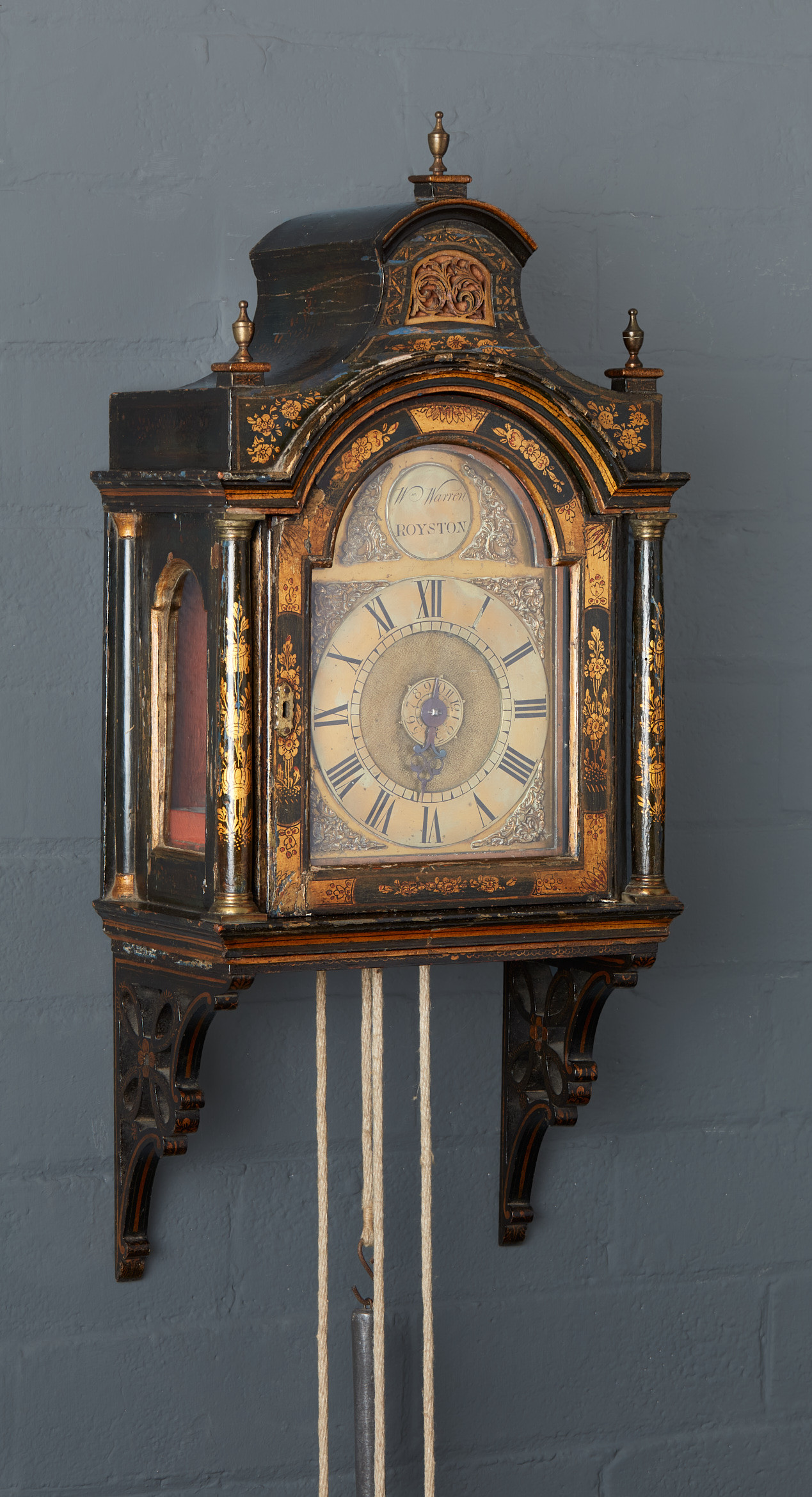 7. 3897865. A GEORGE III LACQUERED WALL/ALARM CLOCK BY WILLIAM WARREN OF ROYSTON, CIRCA 1760.