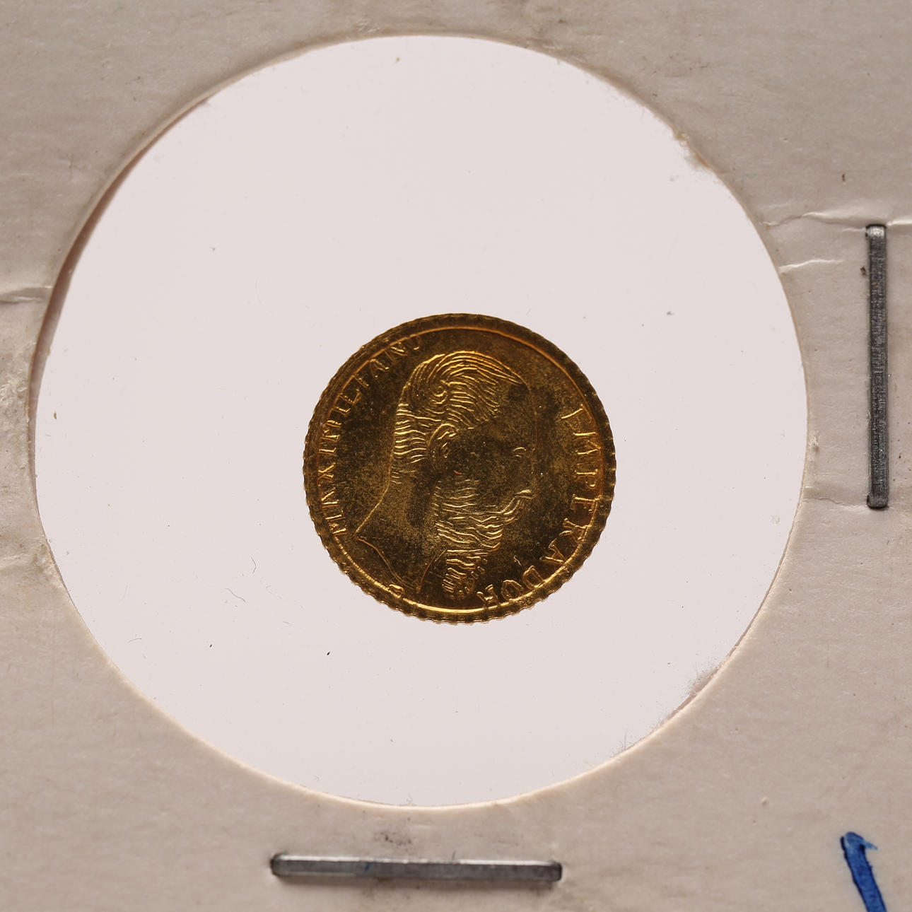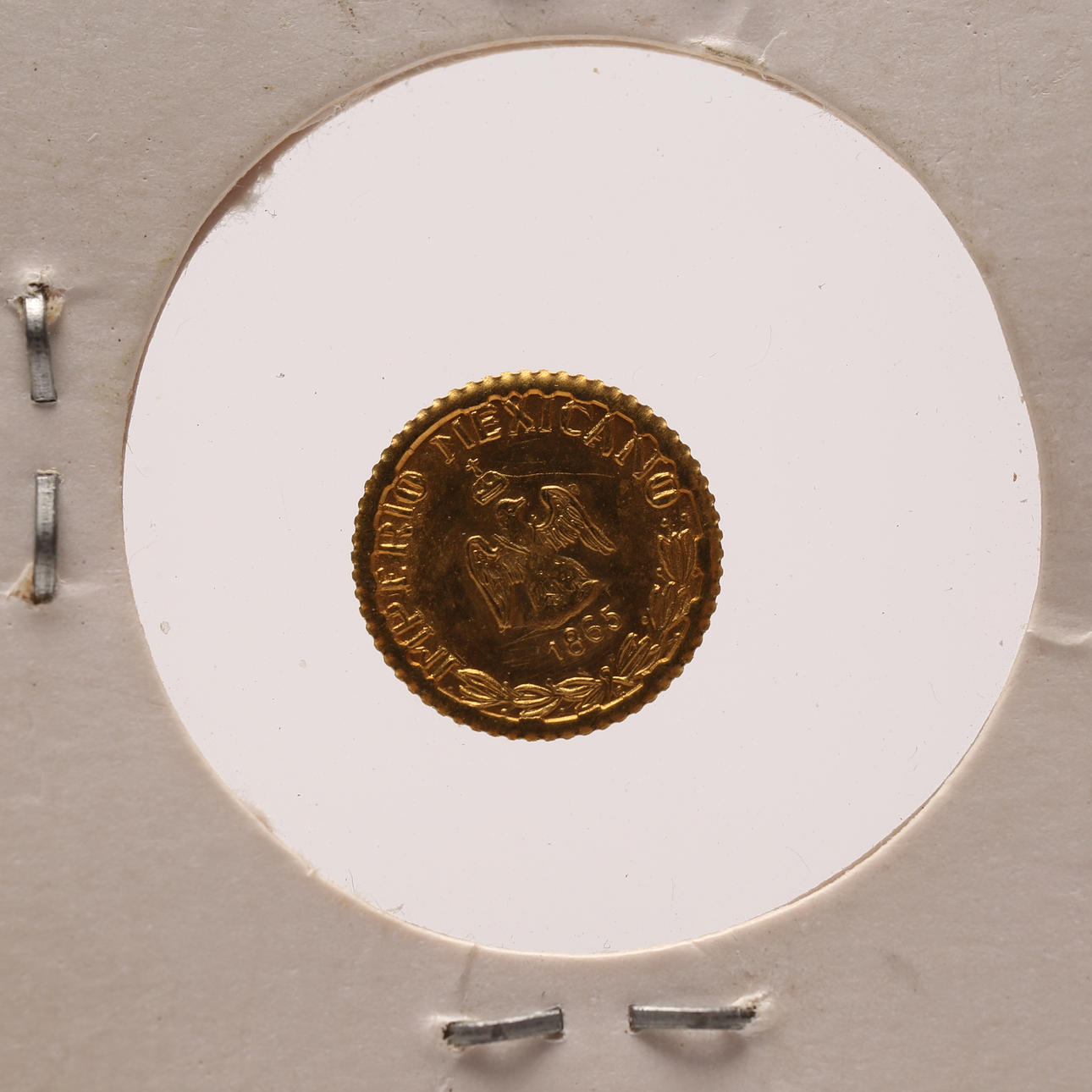 A Mexican peso coin, 1865, gold.