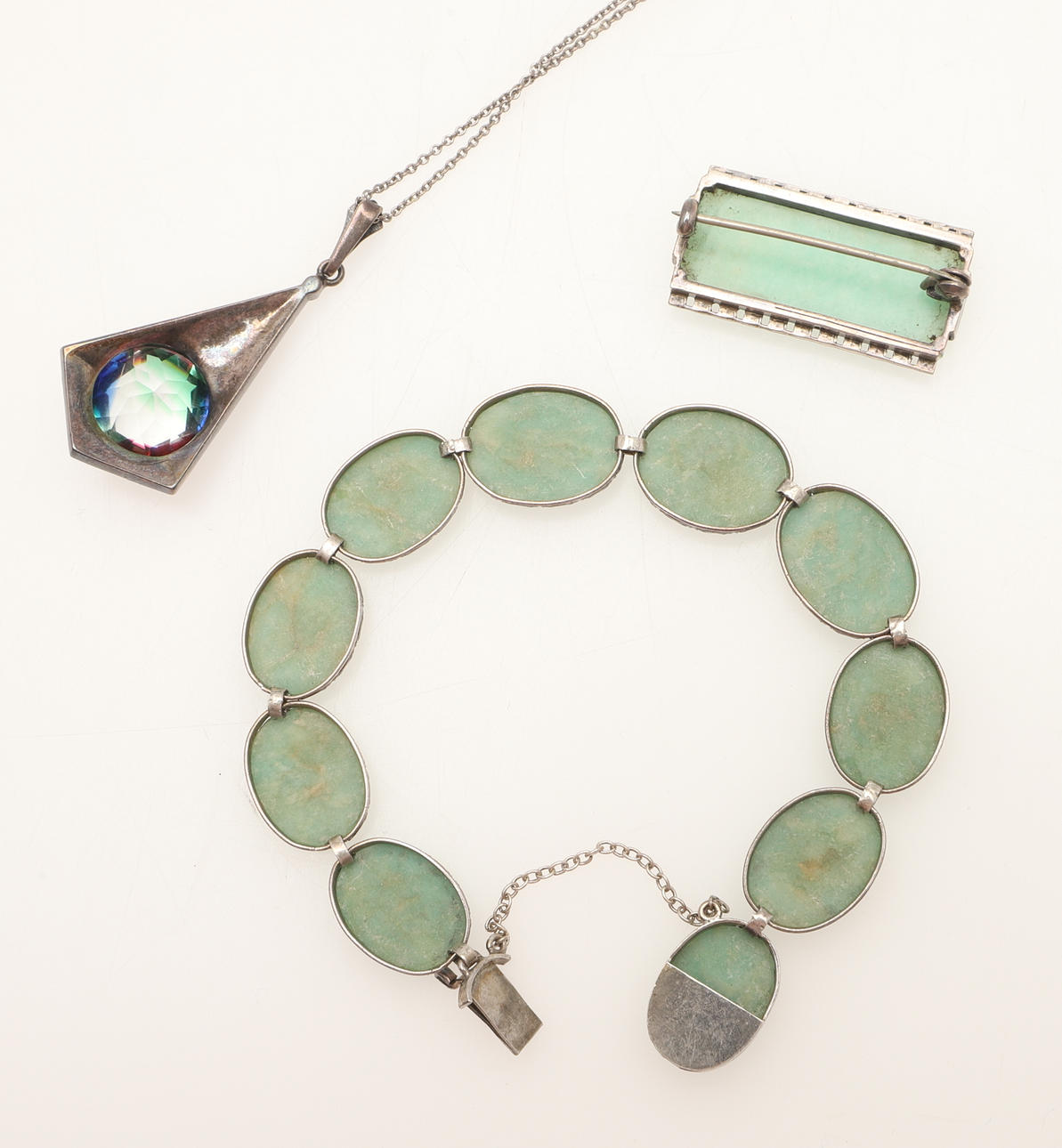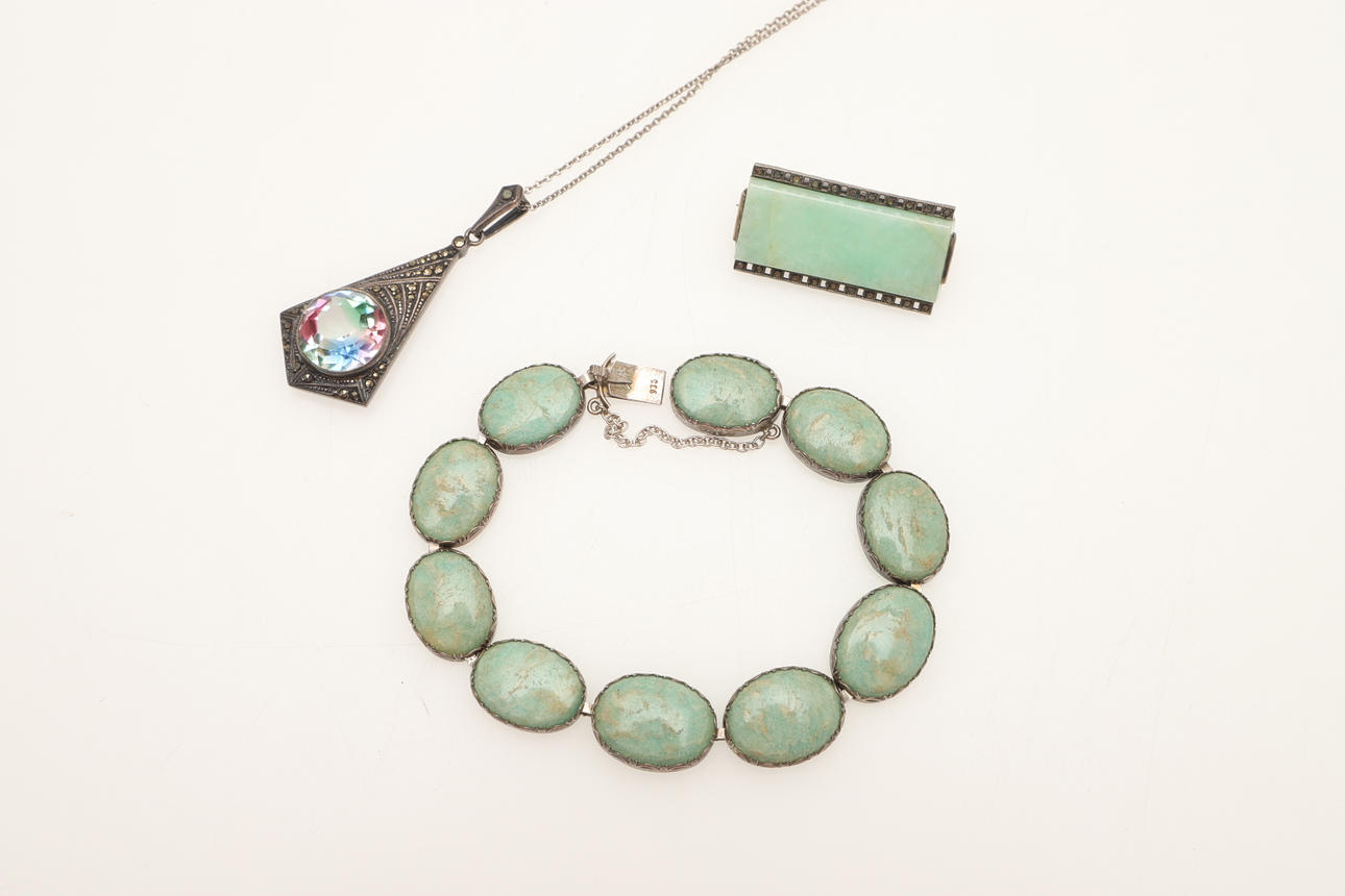 The engine turned adjustable bangle hallmarked Chester 1945 with makers mark CH together with a silver and marcasite necklace and other silver items.