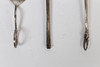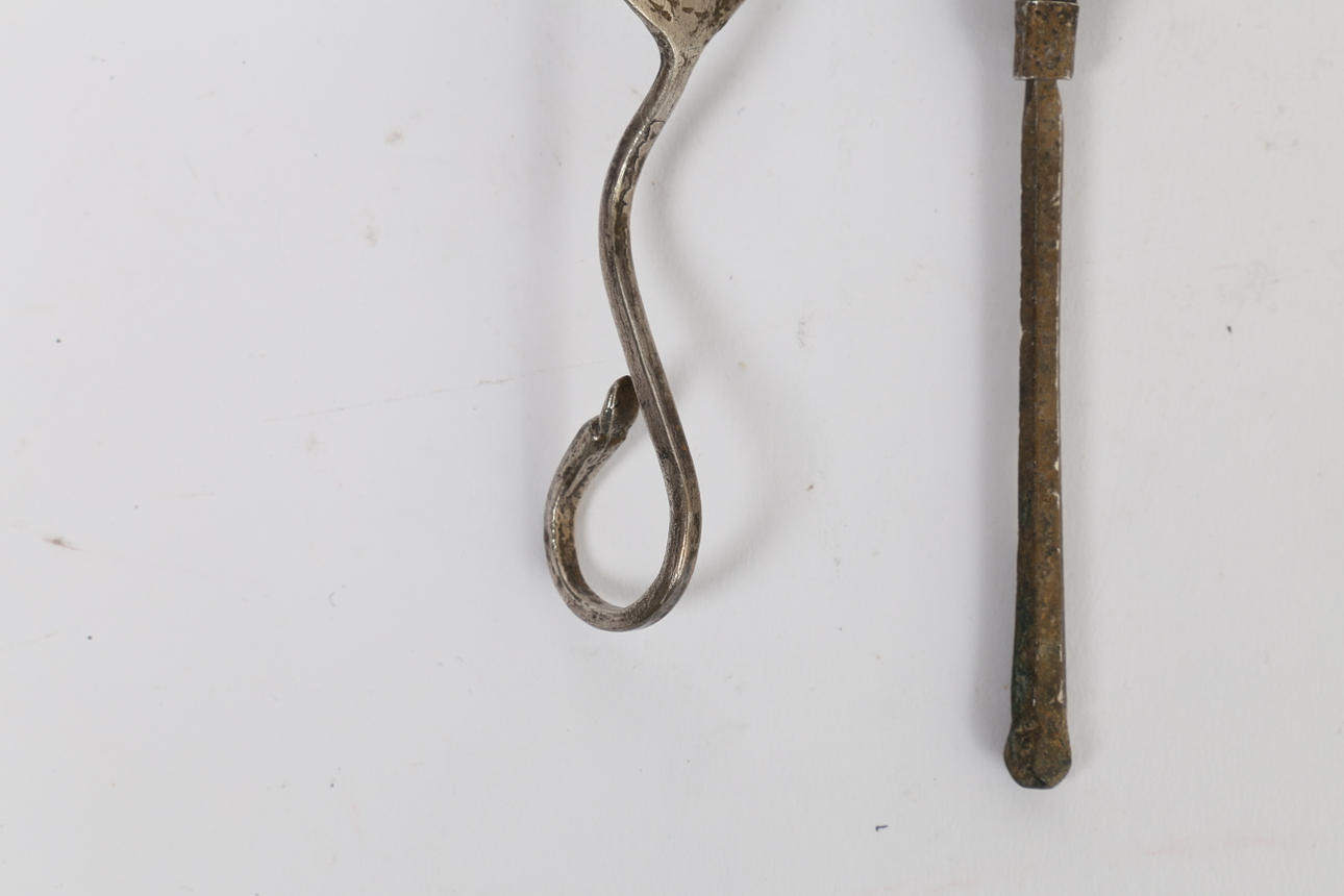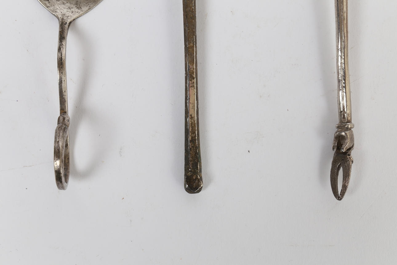 The first with a hinged stem and collar with a wide bowl, 13.5cm long, another with a swan neck handle, 9.5cm long and thew third with a hoof terminal and feather etched stem, 16cm long.