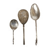 Two spoons with patina, possible finds, the third in a bright tarnish.