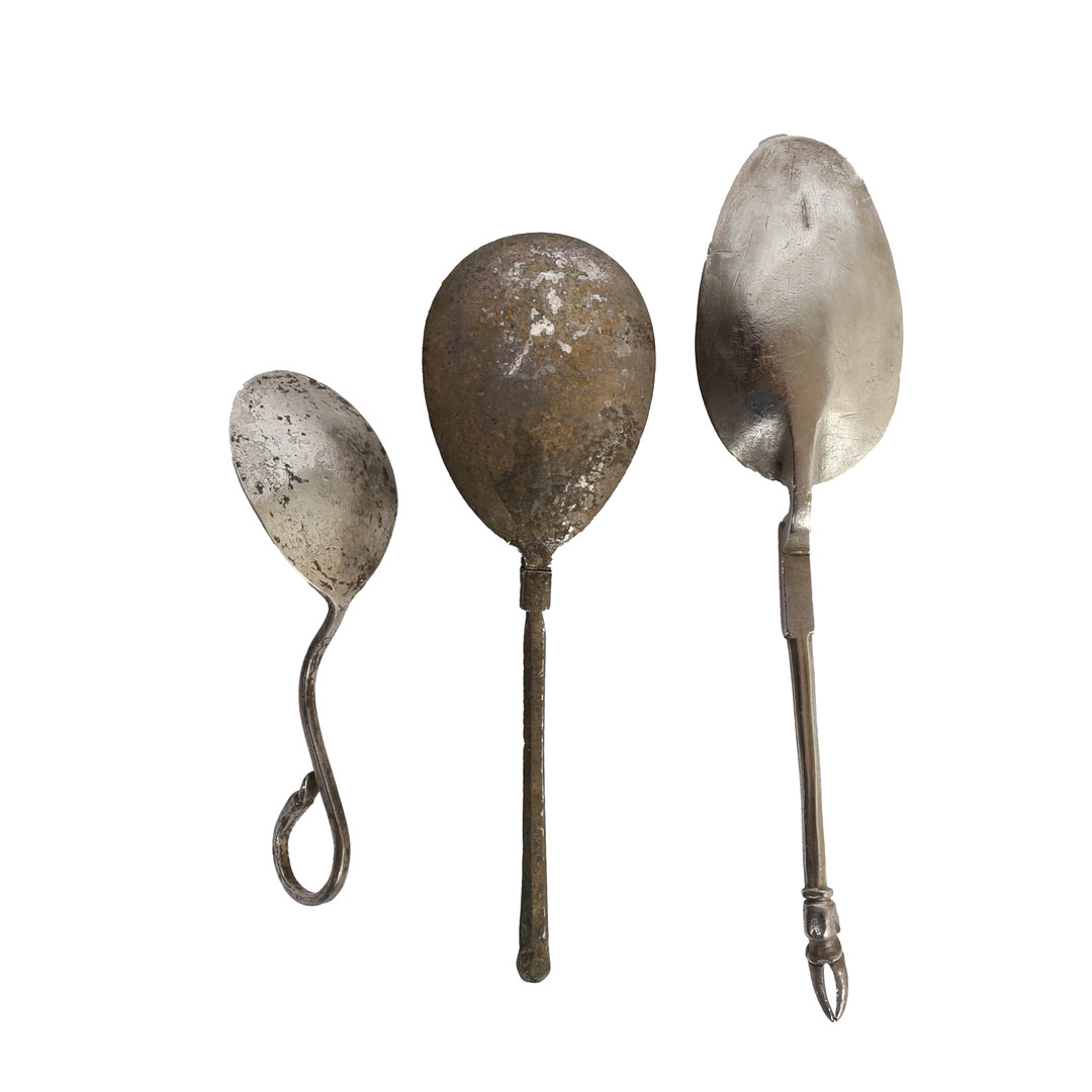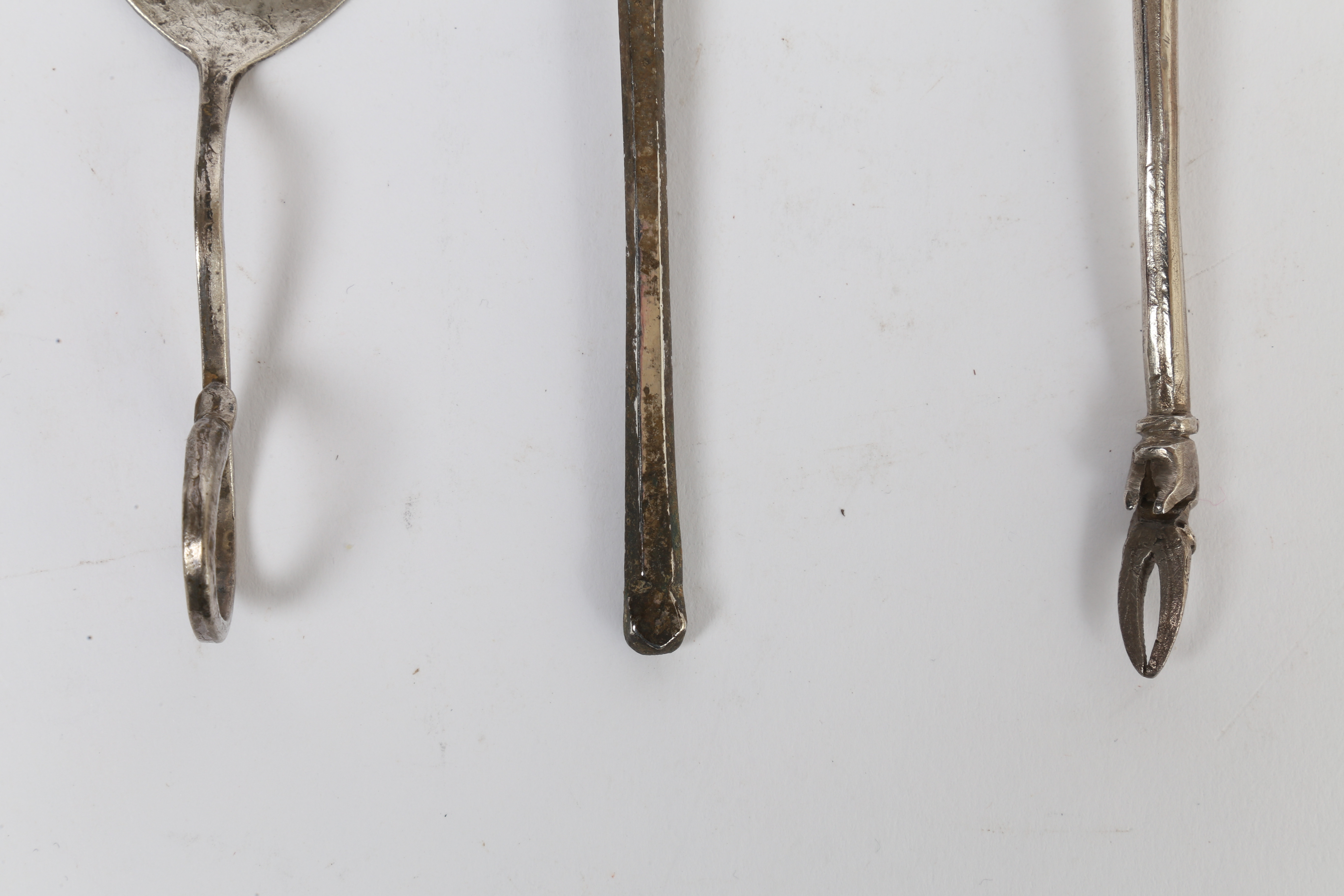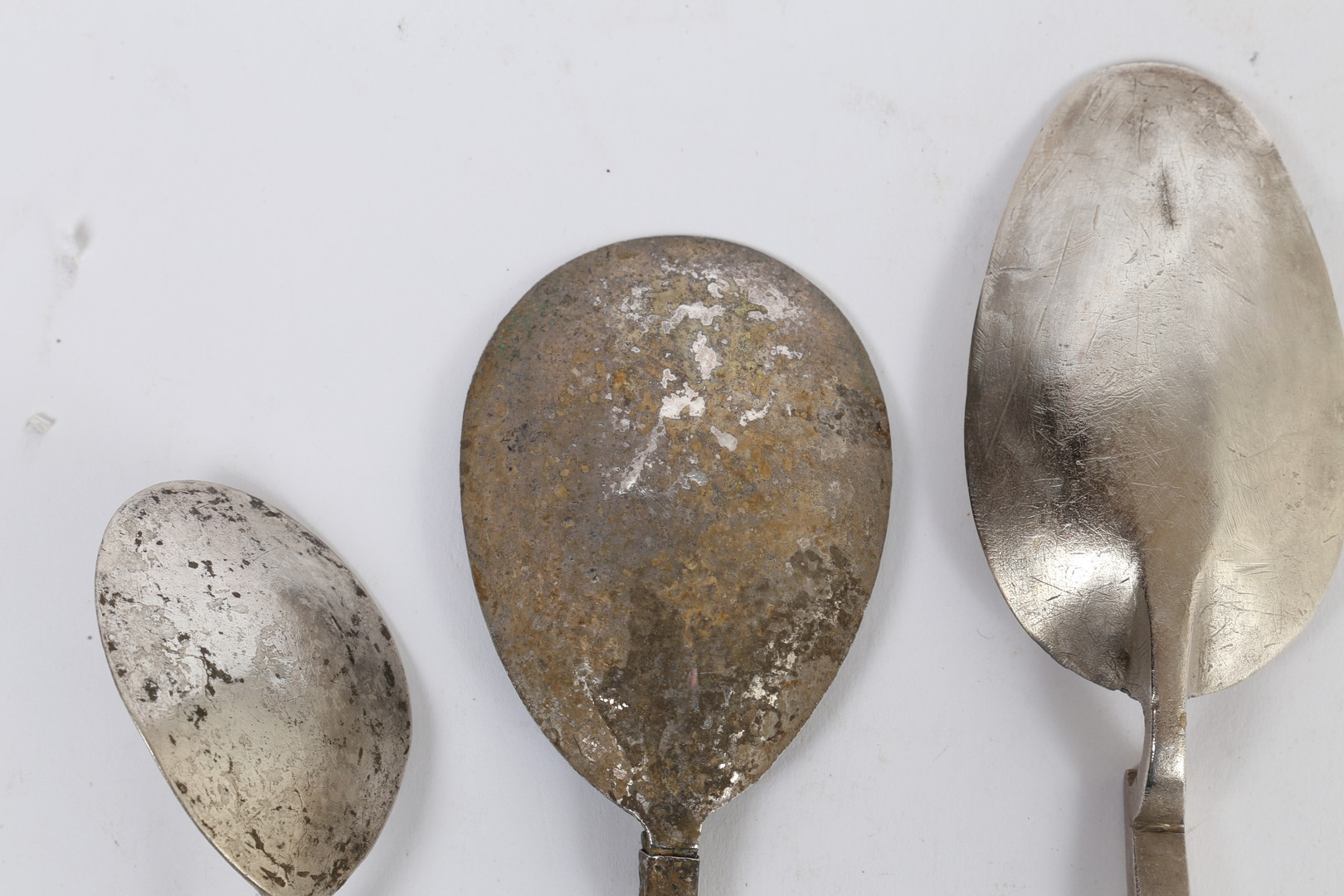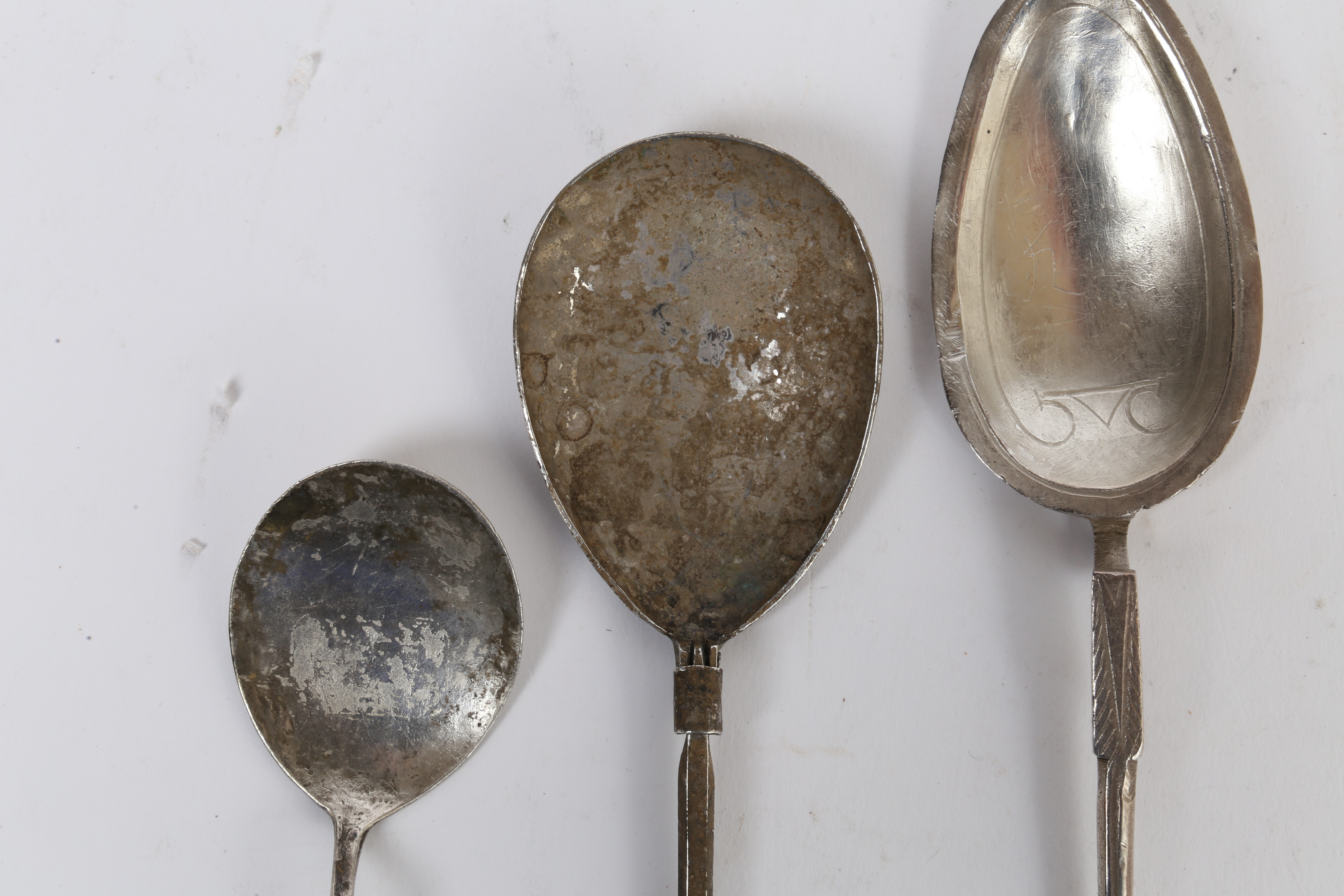 3912926. THREE INTERESTING WHITE METAL SPOONS (3).
