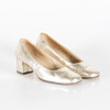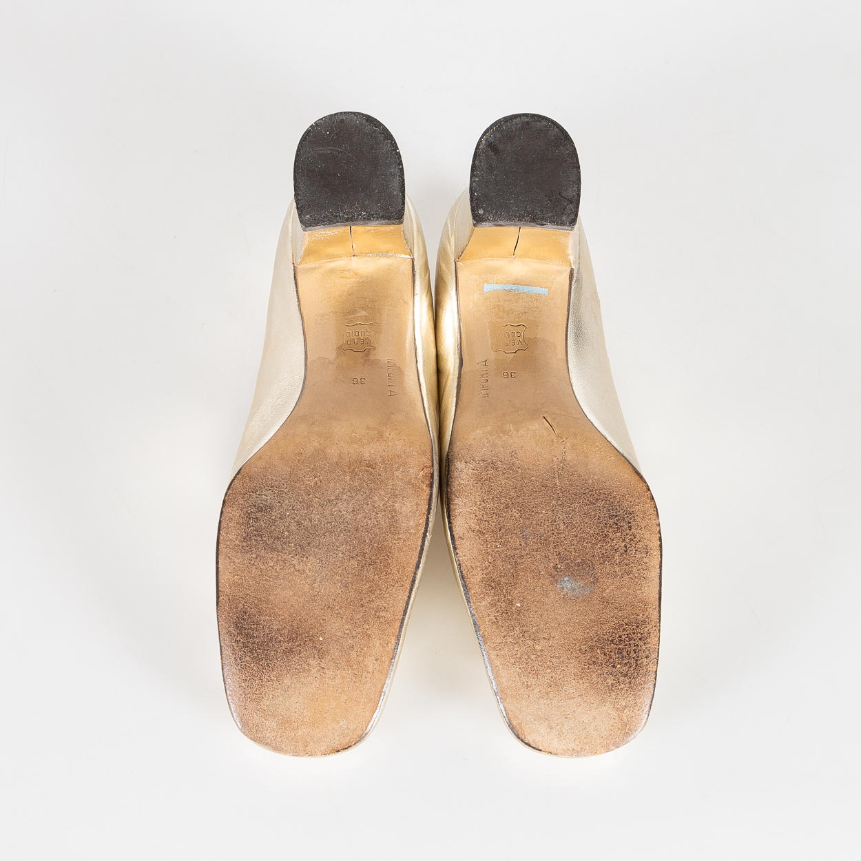 in gold-colored leather with angular toe and round heel. Inside marked Bruno MaglibBologna, Made in Italy. Size 36, inner dimensions approx. 23,5 cm. Cack height about 5 cm. Shoe bags included.