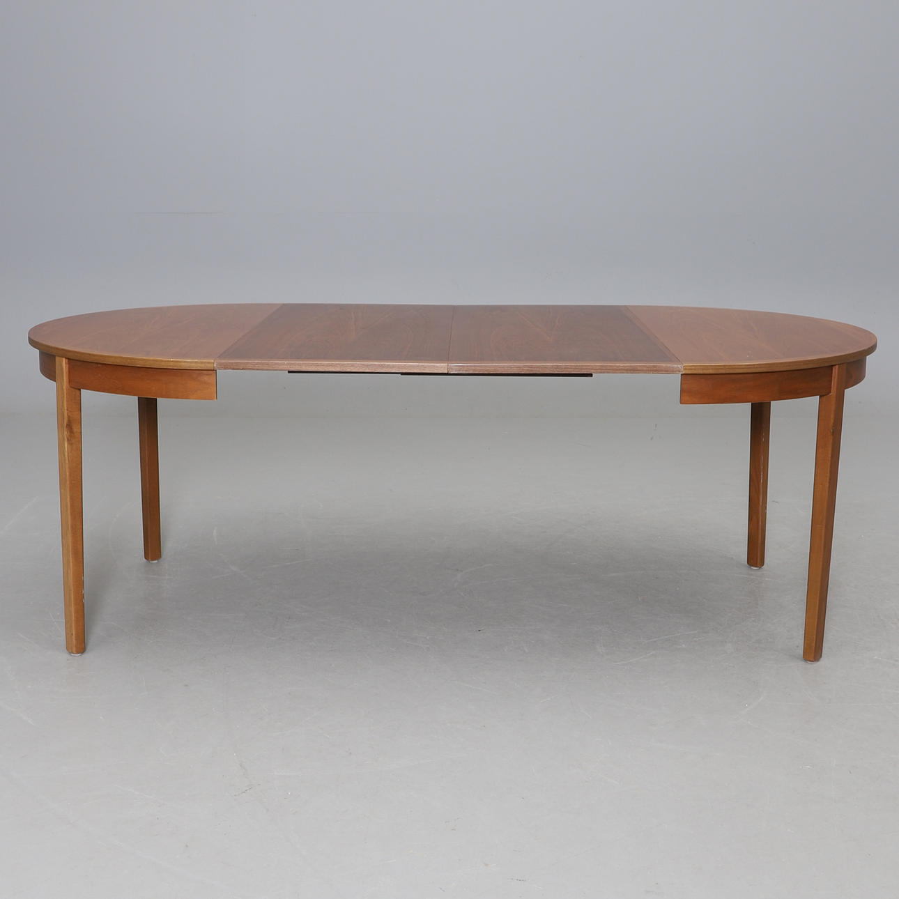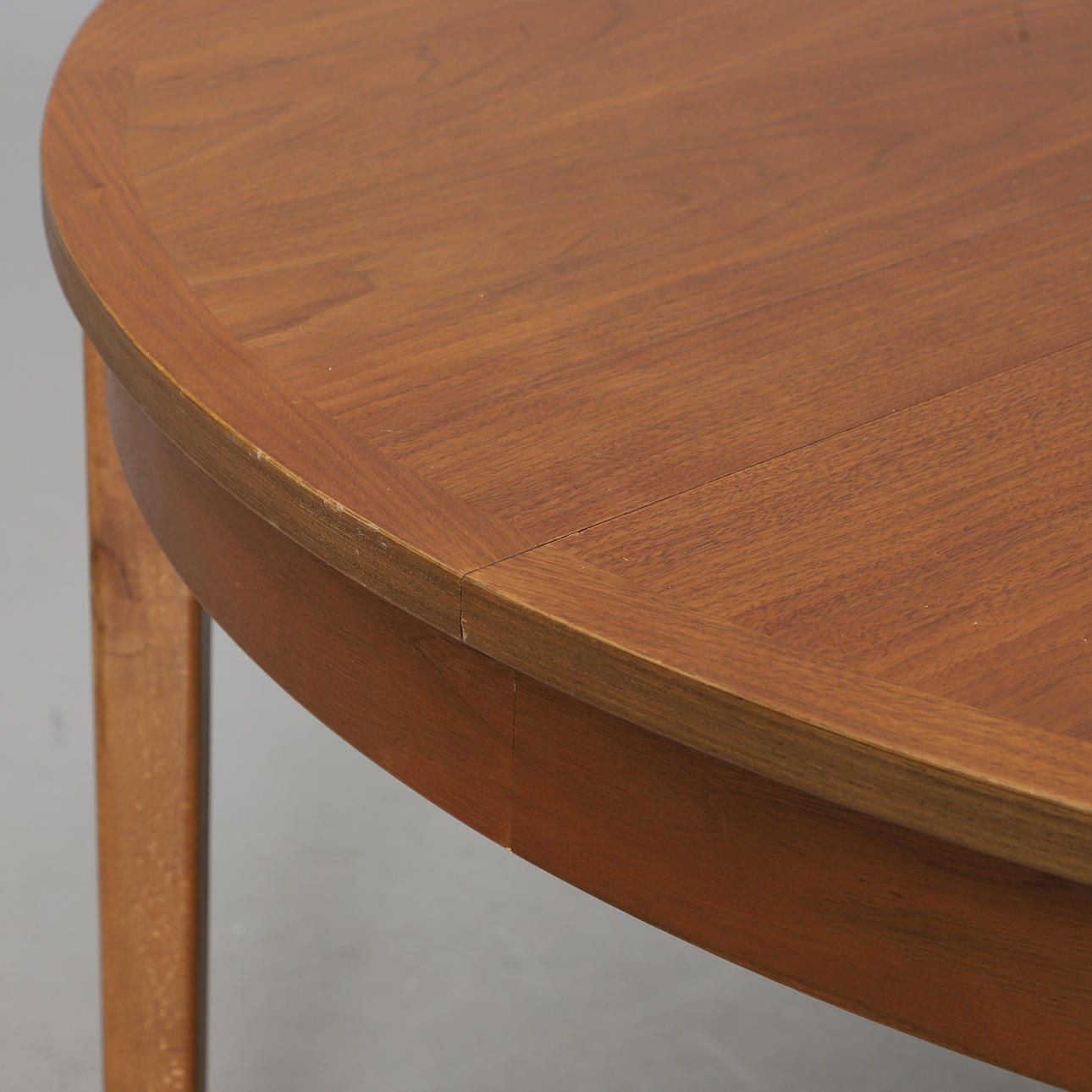 Walnut veneered. Round disc. Diam 110 cm, two loading plates à 49, height 73 cm.