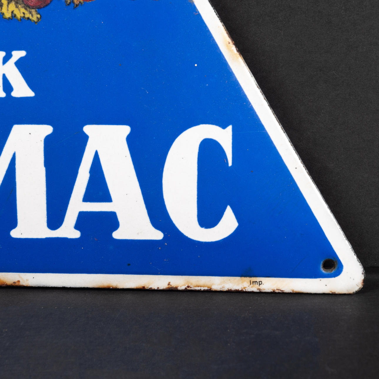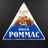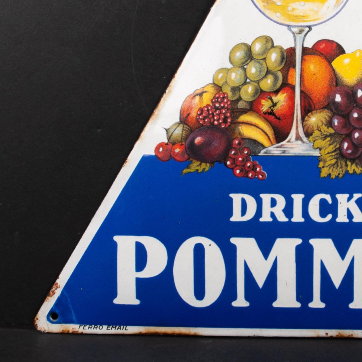 Covered and triangular sign in enamelled plate. The motif is fruits, a filled glass, as well as light blue text “Drink Pommac” against blue and light blue background. The sign was manufactured by Robert Dold, Offenburg during the 1930s. Marking “Ferro Email Imp.”.
