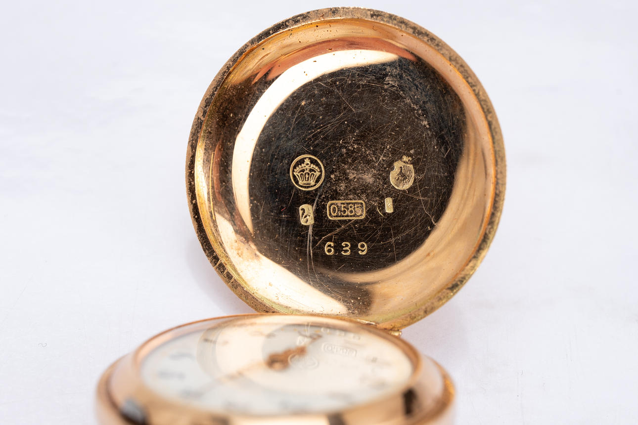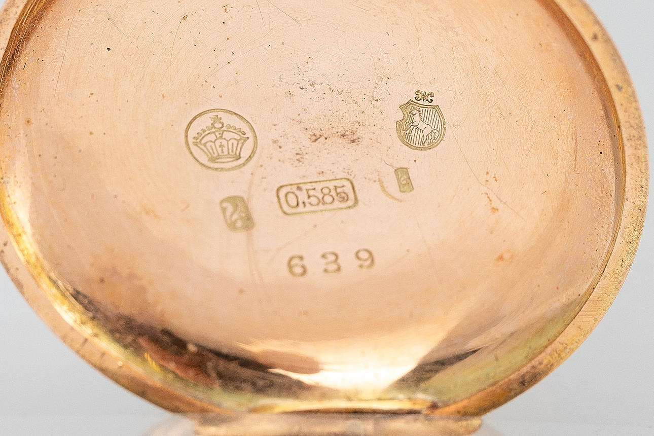 585 gold case, white dial with minute and hour hands. Dimensions approx. Diameter Ø 31 mm. Weight ca. 24 grams Gold plated chain The clock was running at the time of the review, Stockhoms Auktionsverk does not guarantee functionality.