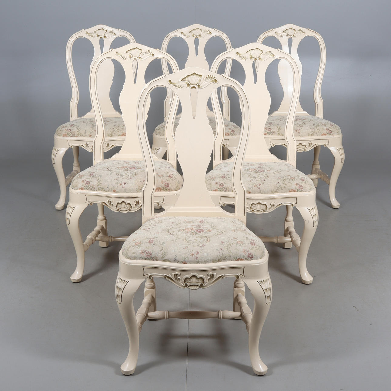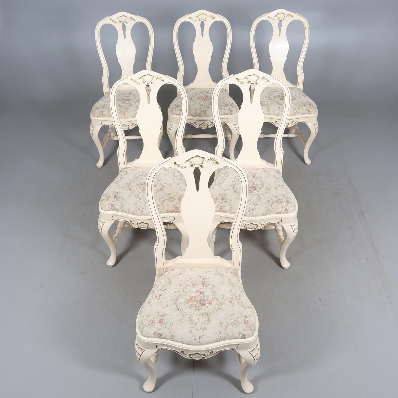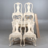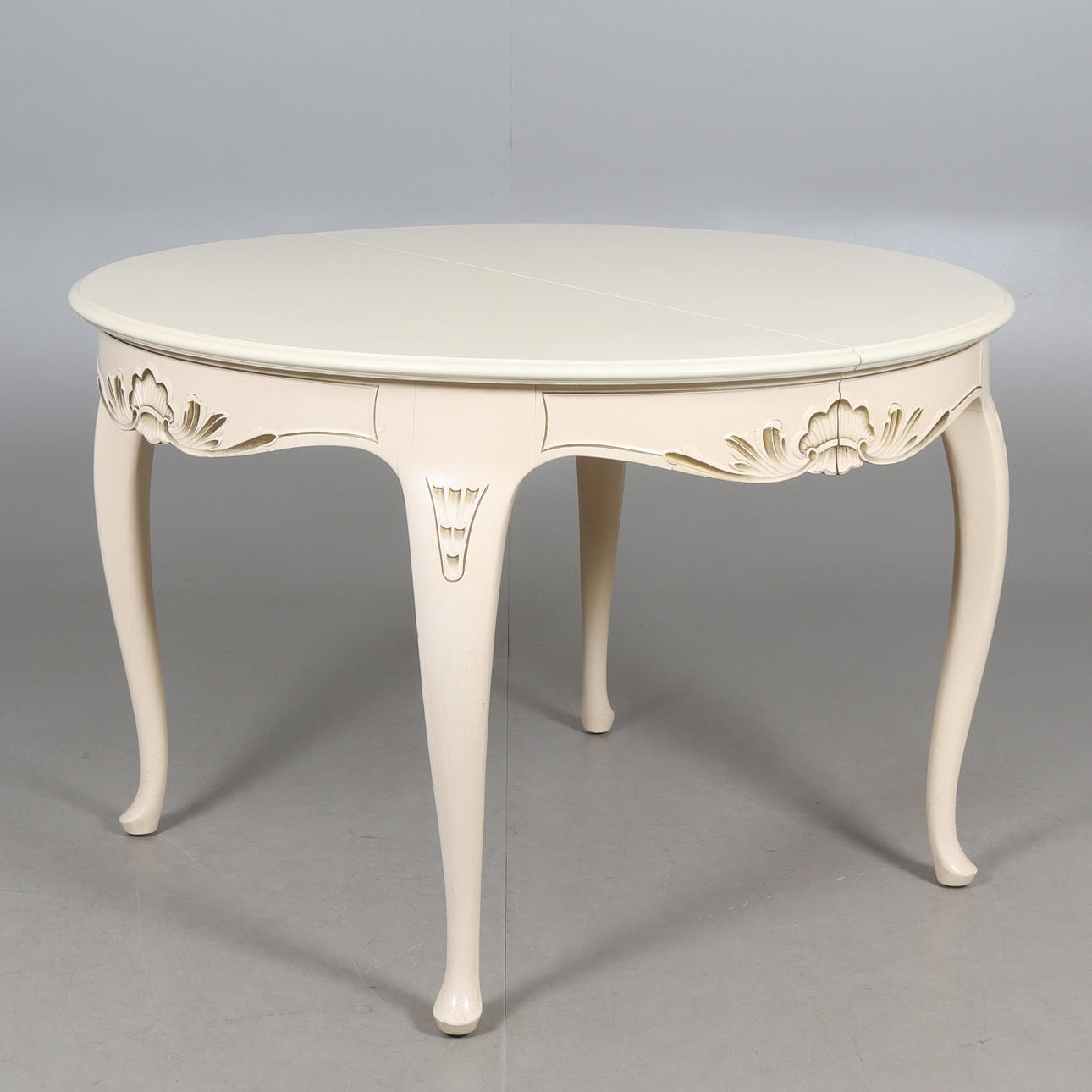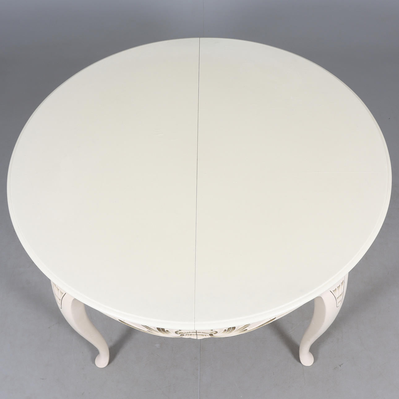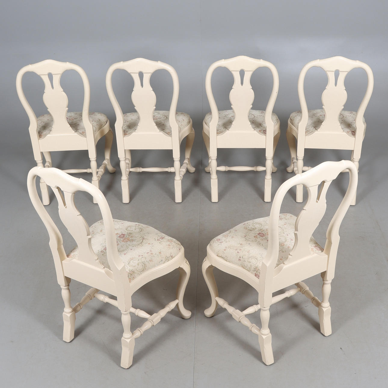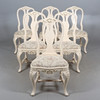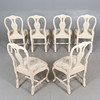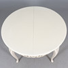 table round shape, diameter 115, height 77 cm. 6 chairs with removable seats, back height 94, seat height 44 cm. 4 insert plates width 51 cm.