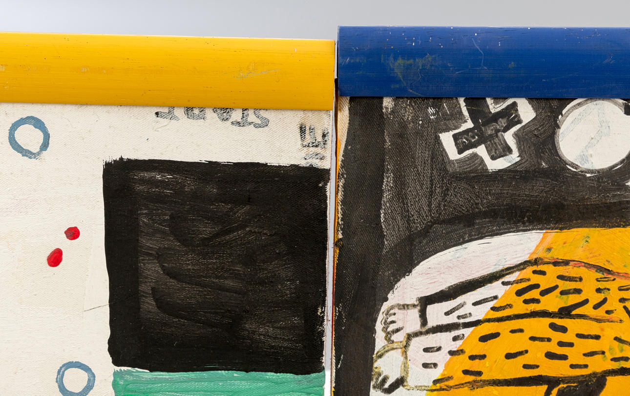 Andrzej Cisowski (1962-2020), diptych, mixed media with oil on canvas, two stretcher frames, each on three sides with blue and yellow frame strips, 1996, signed and dated on the back and inscribed with 'II' and 'VI', a total of ca. 65 x 123 cm (each painting approx. 65 x 61 cm)