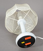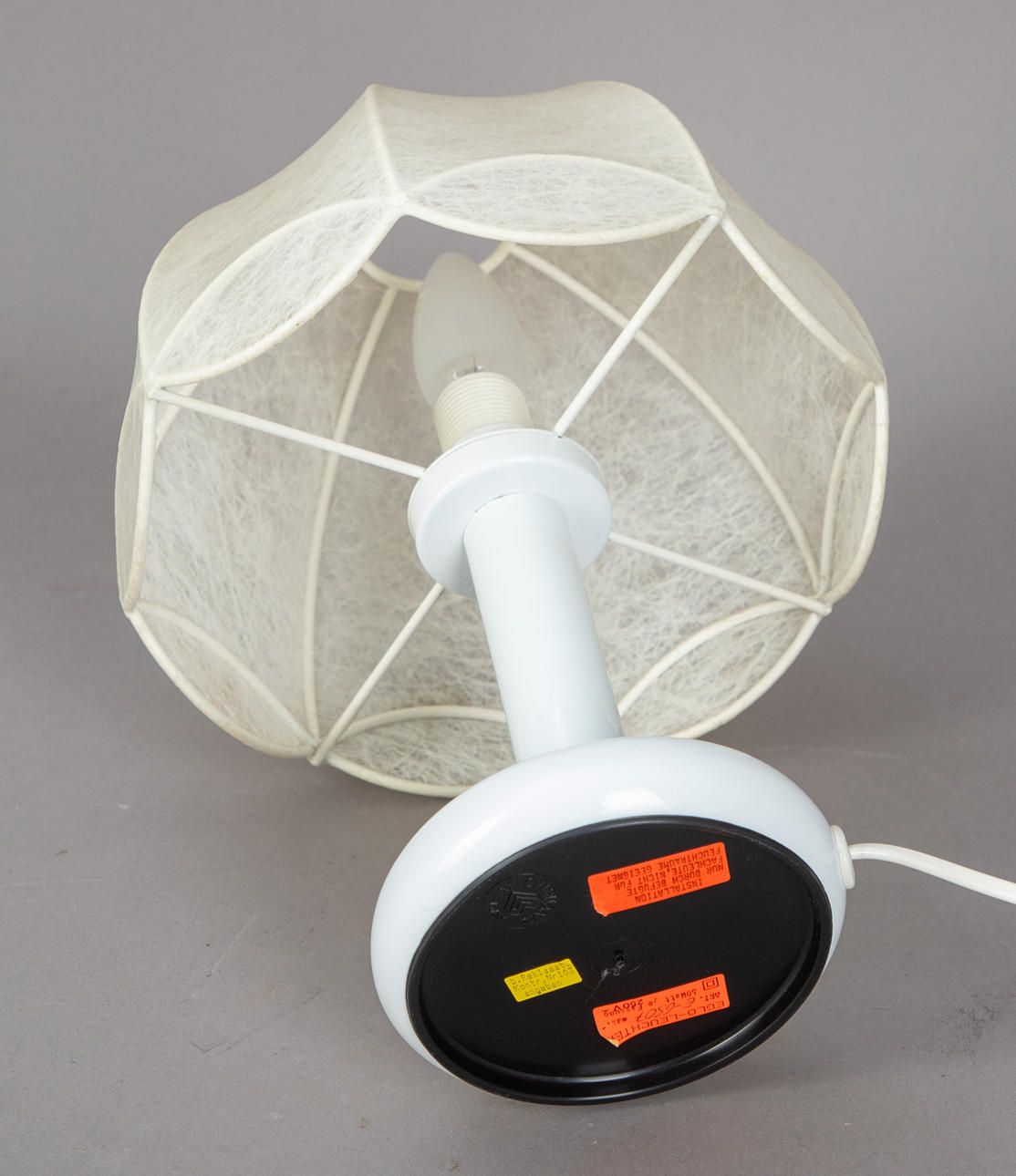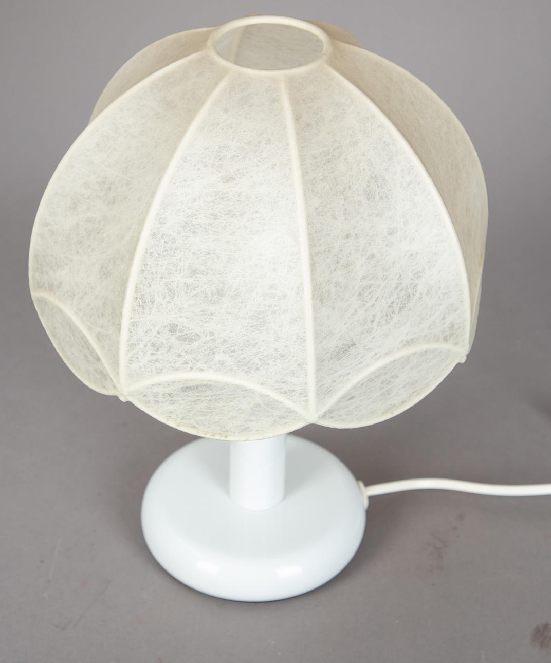 Metal lampshade frame covered in fibreglass fabric. White lacquered metal shaft and base.