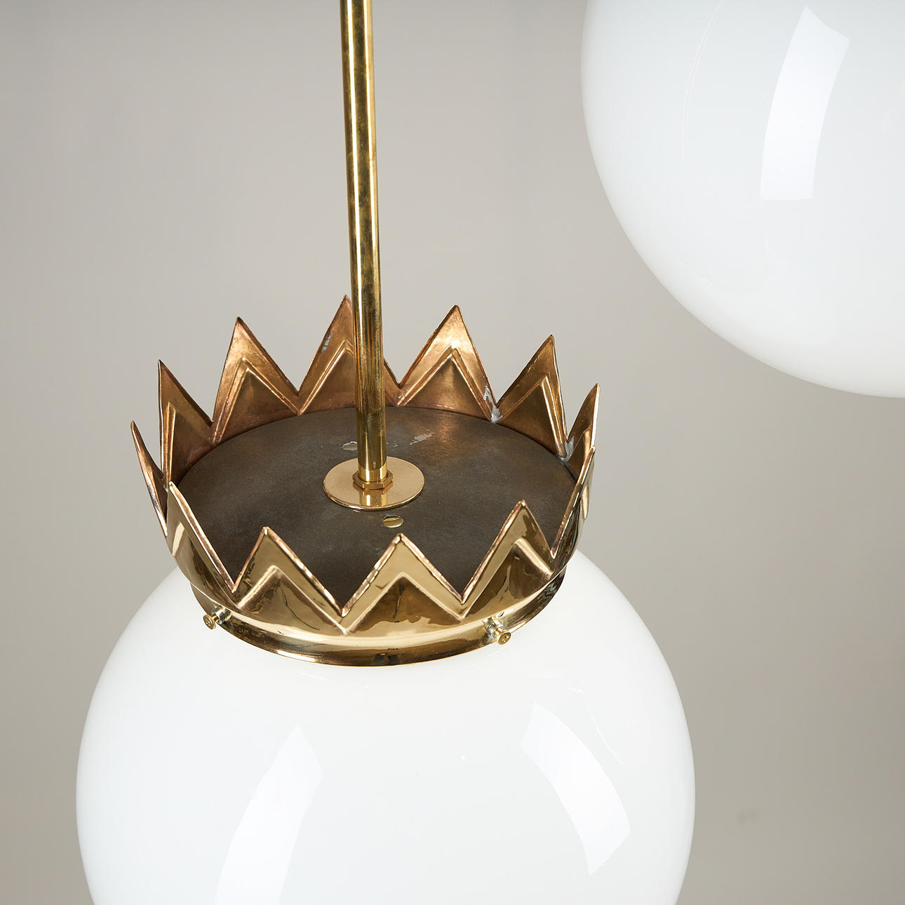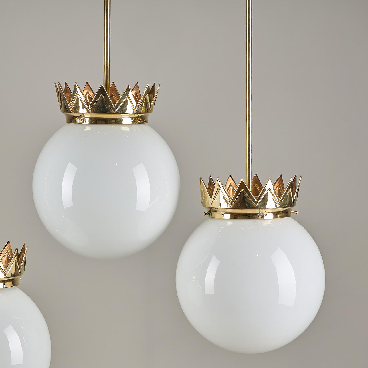 Polished brass and opal glass shades. Height 107 cm, diameter approx. 30 cm.