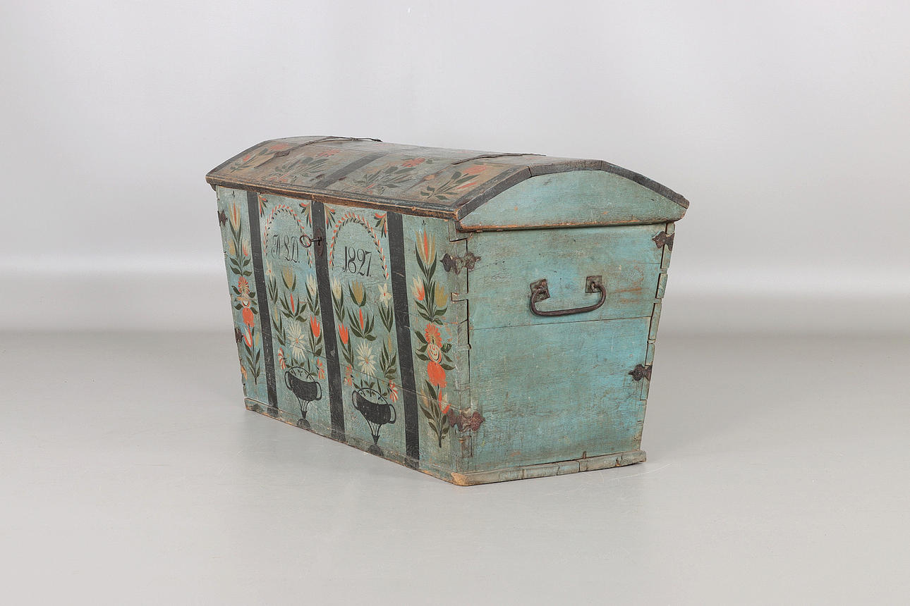 Coffin, painting in blue tones, empire urns, flowers. Skåne, Kristianstadsmålaren, dated 1827. Height 74 cm Length 138 cm Width 62 cm.