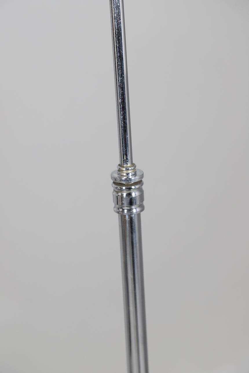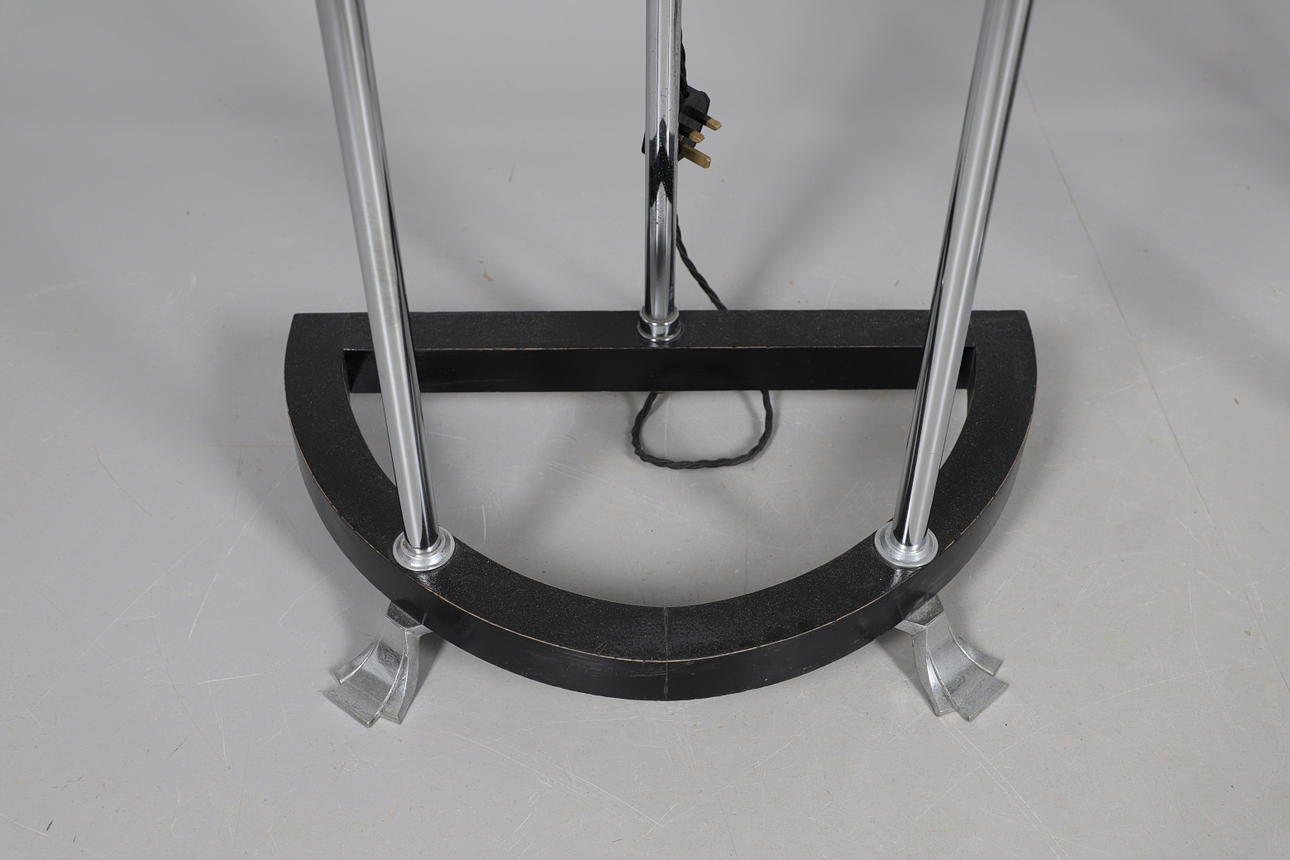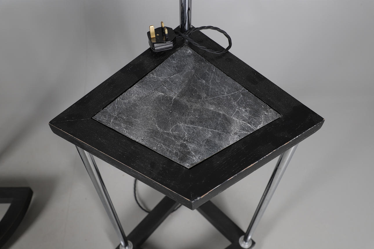 Two Art Deco floor standing lamps, both with chrome supports and a revolving light fitting, with a central wooden shelf and base and with shaped chrome feet. Both 154cms high