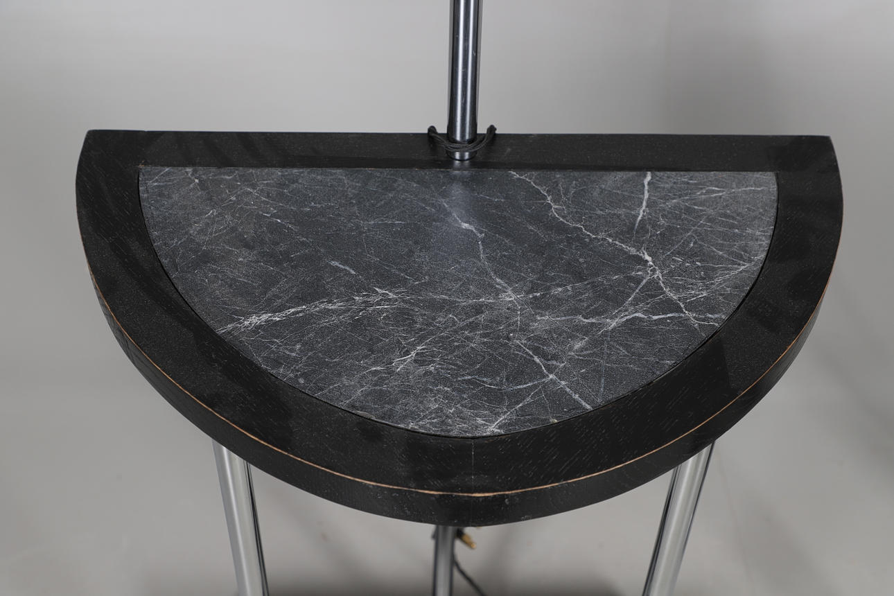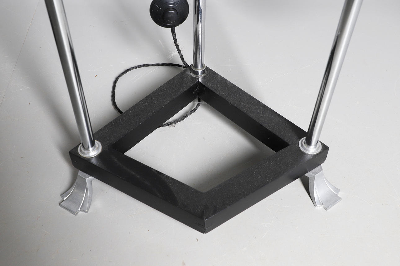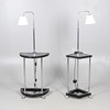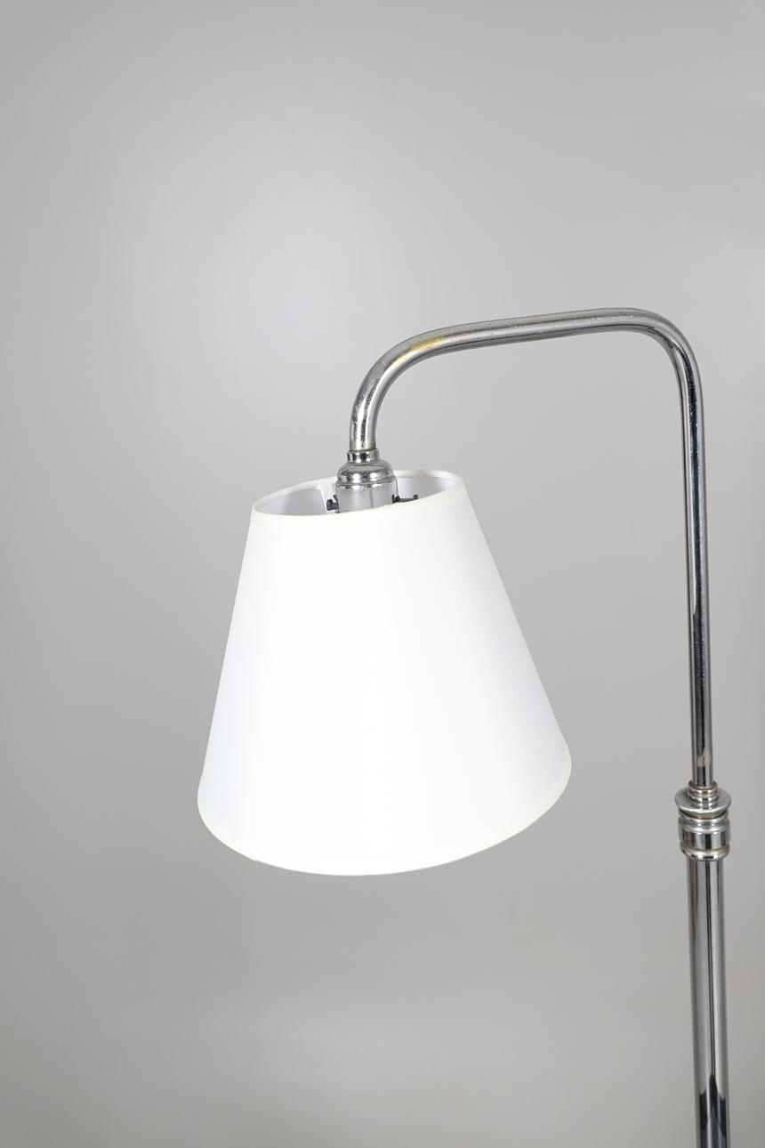 Two Art Deco floor standing lamps, both with chrome supports and a revolving light fitting, with a central wooden shelf and base and with shaped chrome feet. Both 154cms high