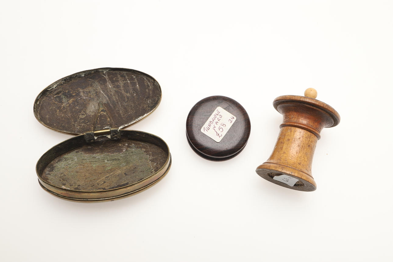 A mixed lot including a Russian lacquered box with pictorial scene (10cms by 8cms), tunbridge ware boxes, lacquered snuff box, and an inscribed brass snuff box (Tom Hall, 1810, Bedminster').