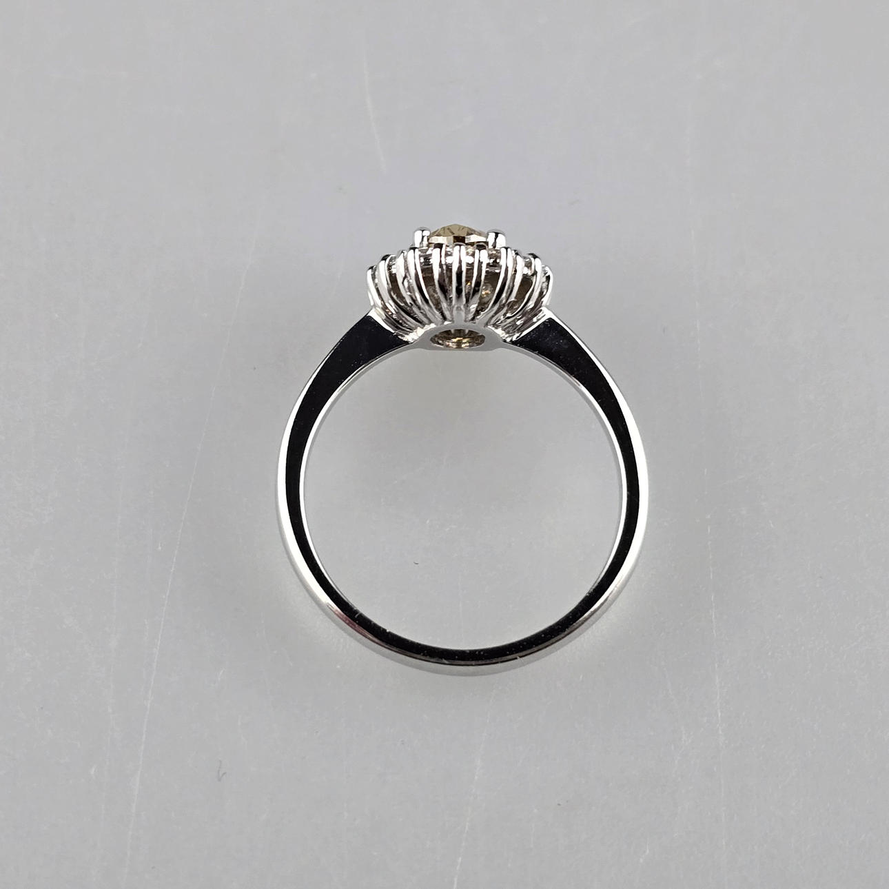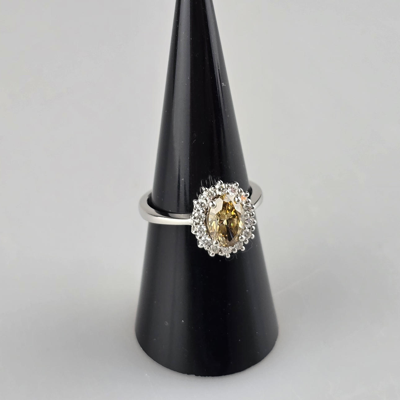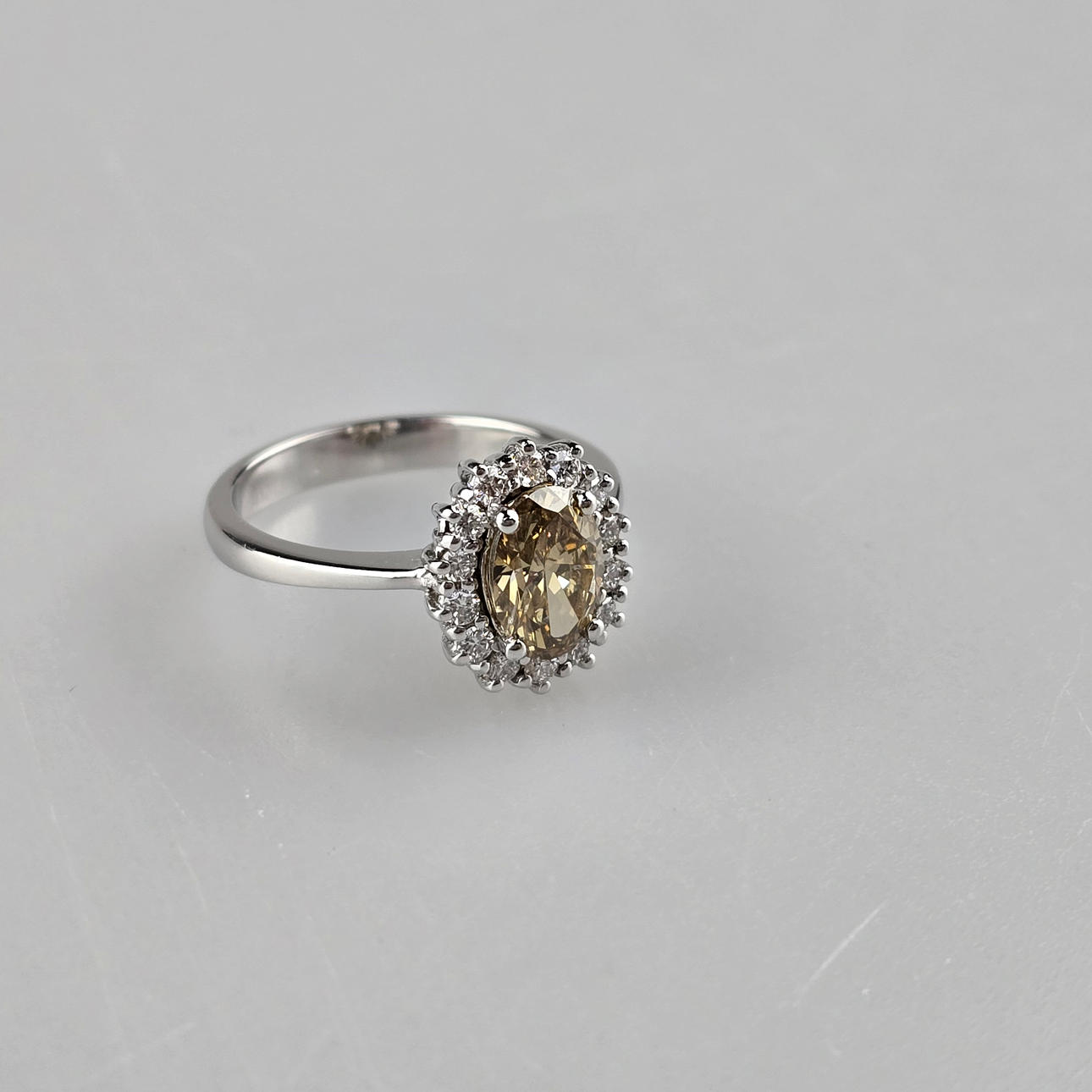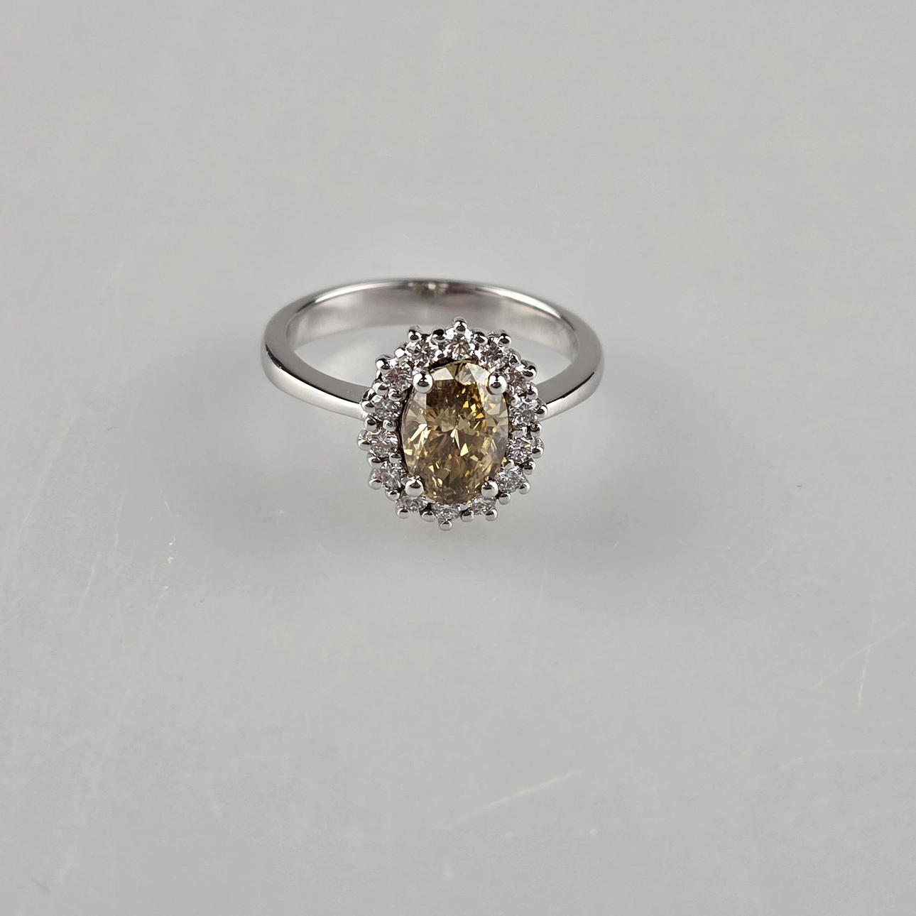 central diamond in oval brilliant cut of 1.09 carats. (natural color: “fancy” brown-yellow), oval ring head also set all around with 14 smaller faceted diamonds totalling 0.29 carats. (Color: H/Clarity: Vs1), weight: ca. 4.4 g, ring diameter cca 17.2 mm, attached GIA certificate no. 1132845832 (10/2011).