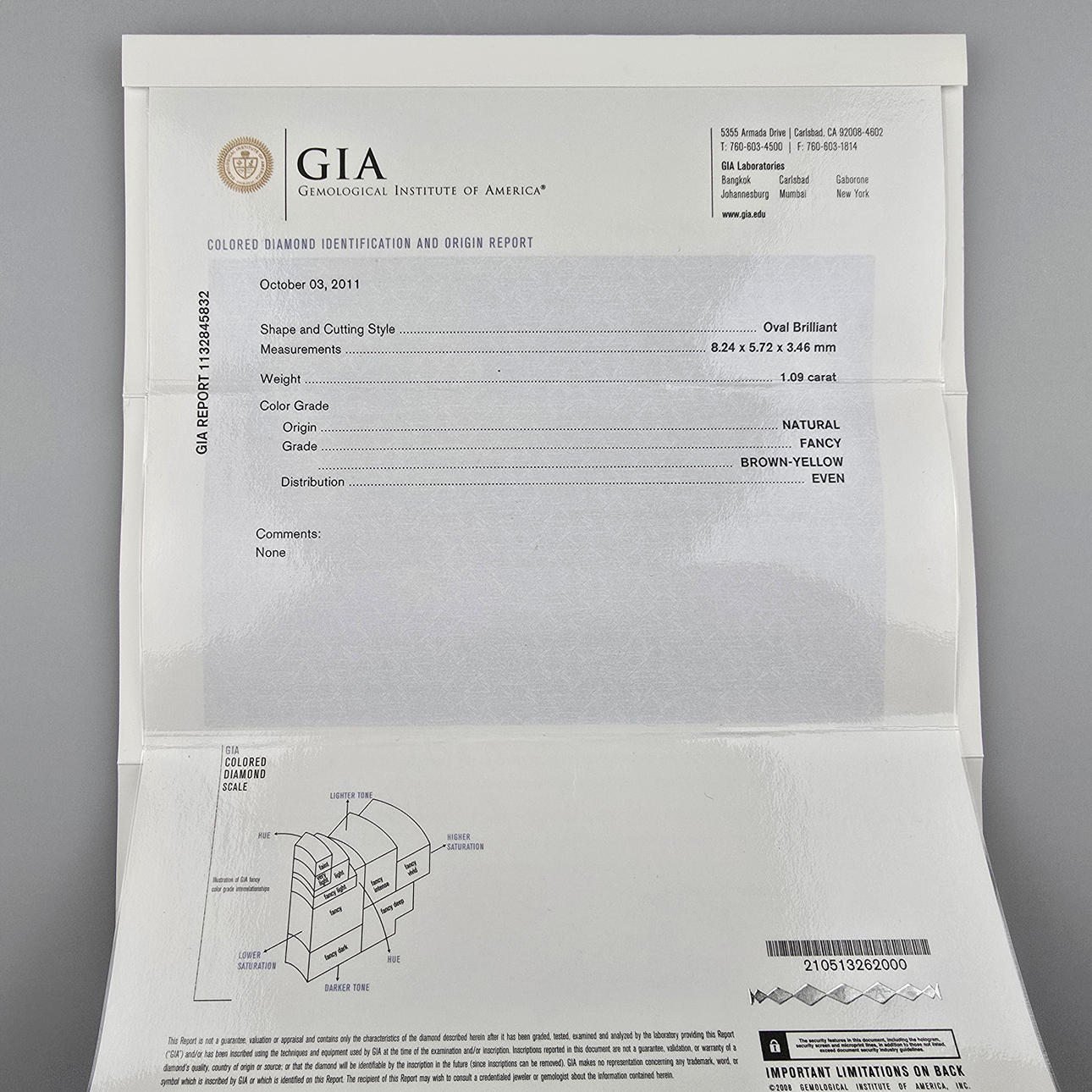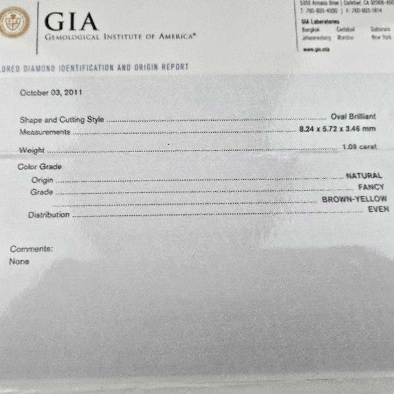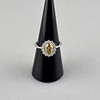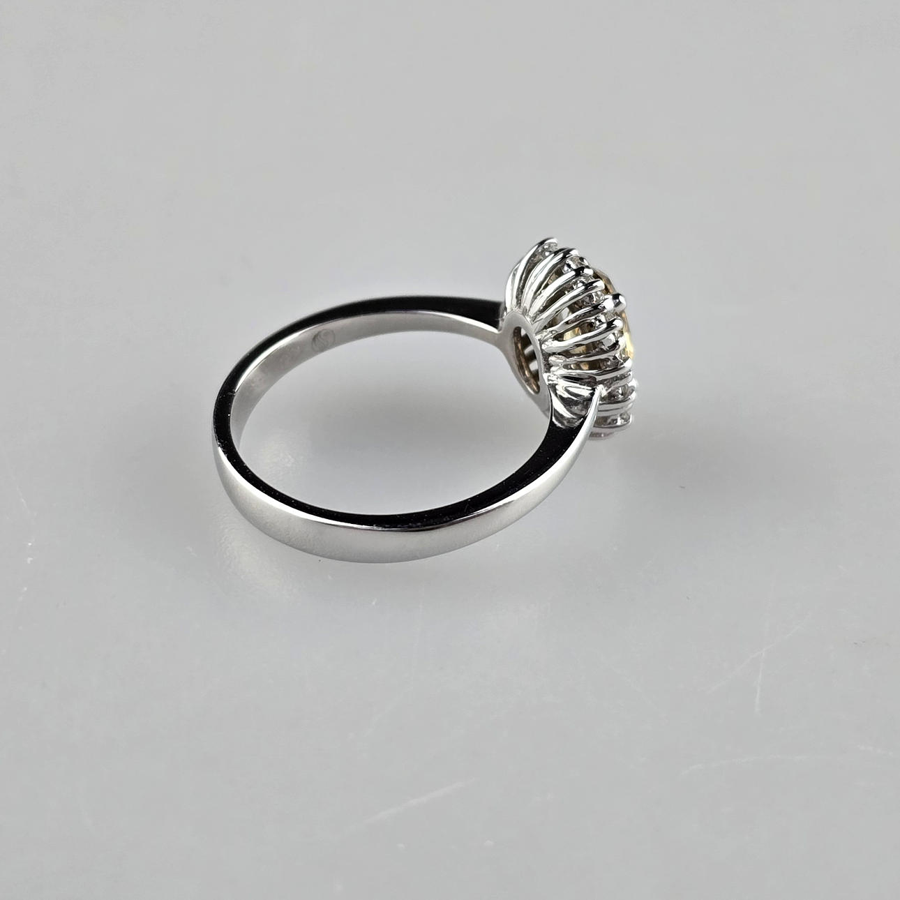 central diamond in oval brilliant cut of 1.09 carats. (natural color: “fancy” brown-yellow), oval ring head also set all around with 14 smaller faceted diamonds totalling 0.29 carats. (Color: H/Clarity: Vs1), weight: ca. 4.4 g, ring diameter cca 17.2 mm, attached GIA certificate no. 1132845832 (10/2011).