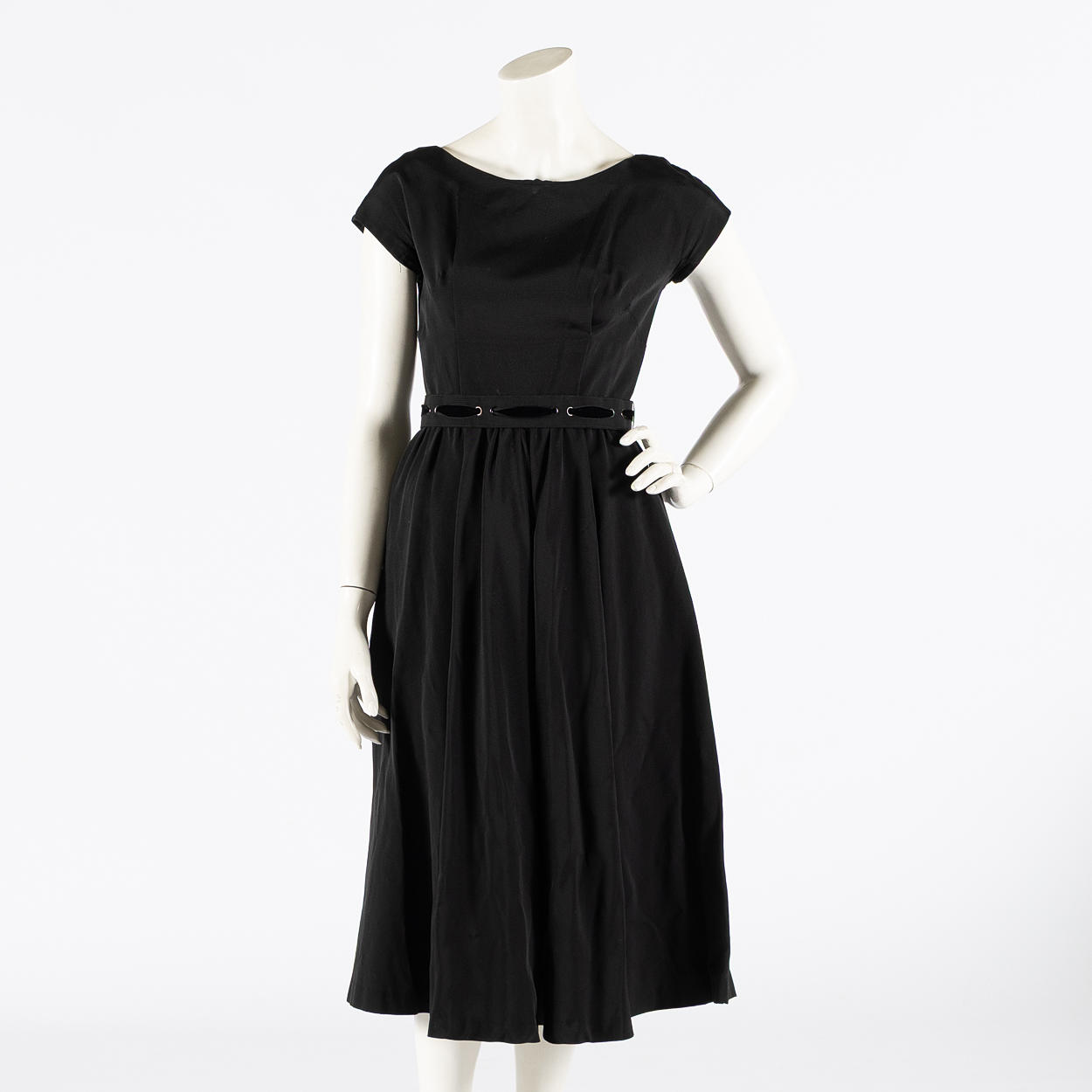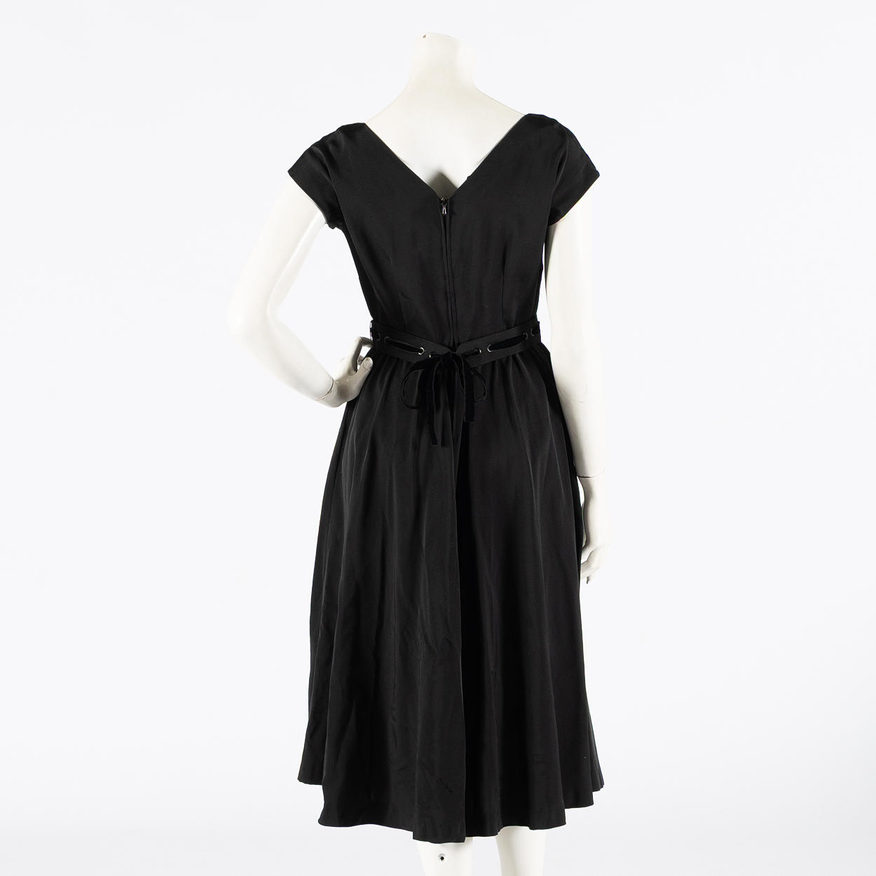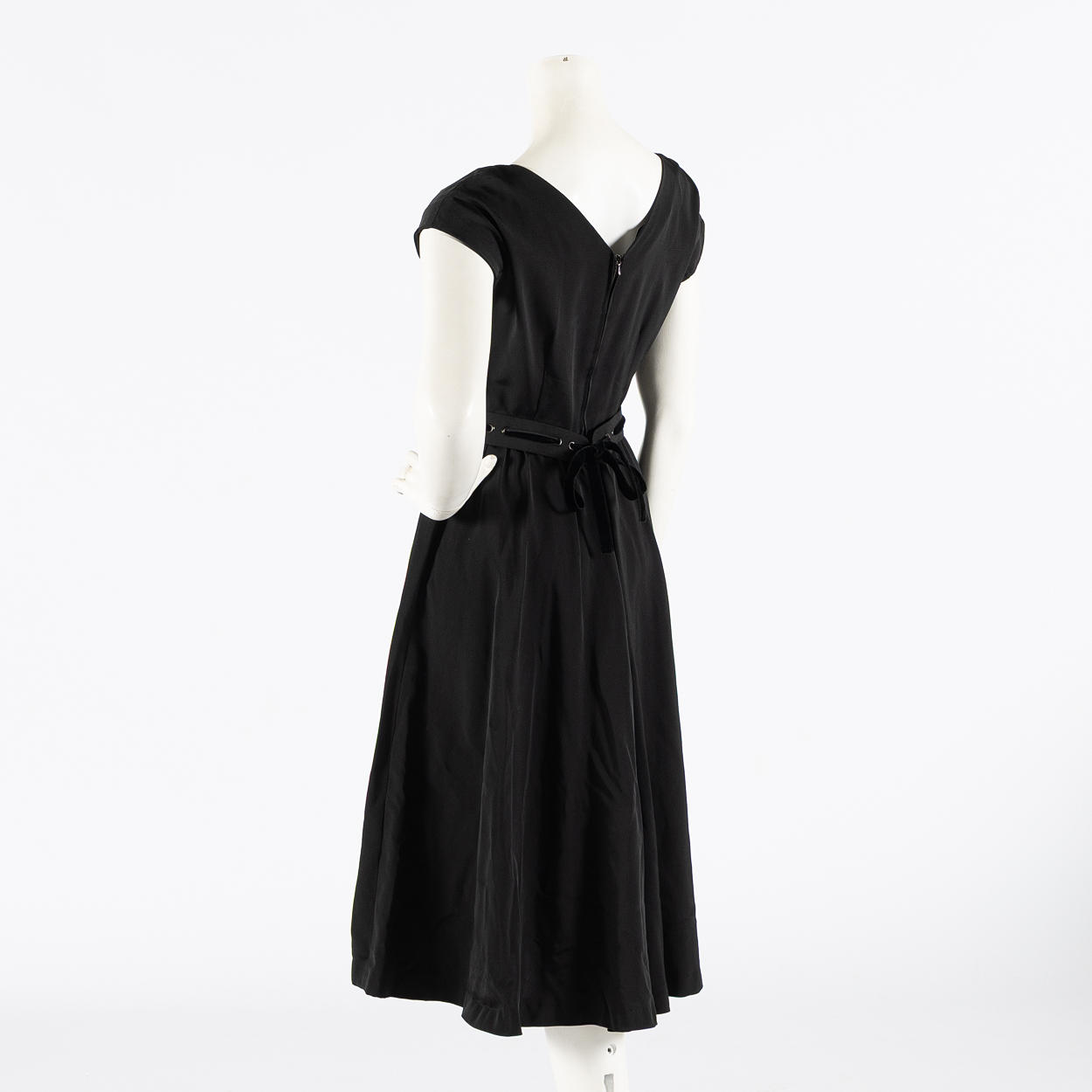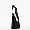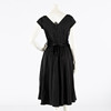 Dress in black currant with short sleeves and round neckline. Waist with detachable belt with velvet ribbon. Tagged Erling Richard 40.