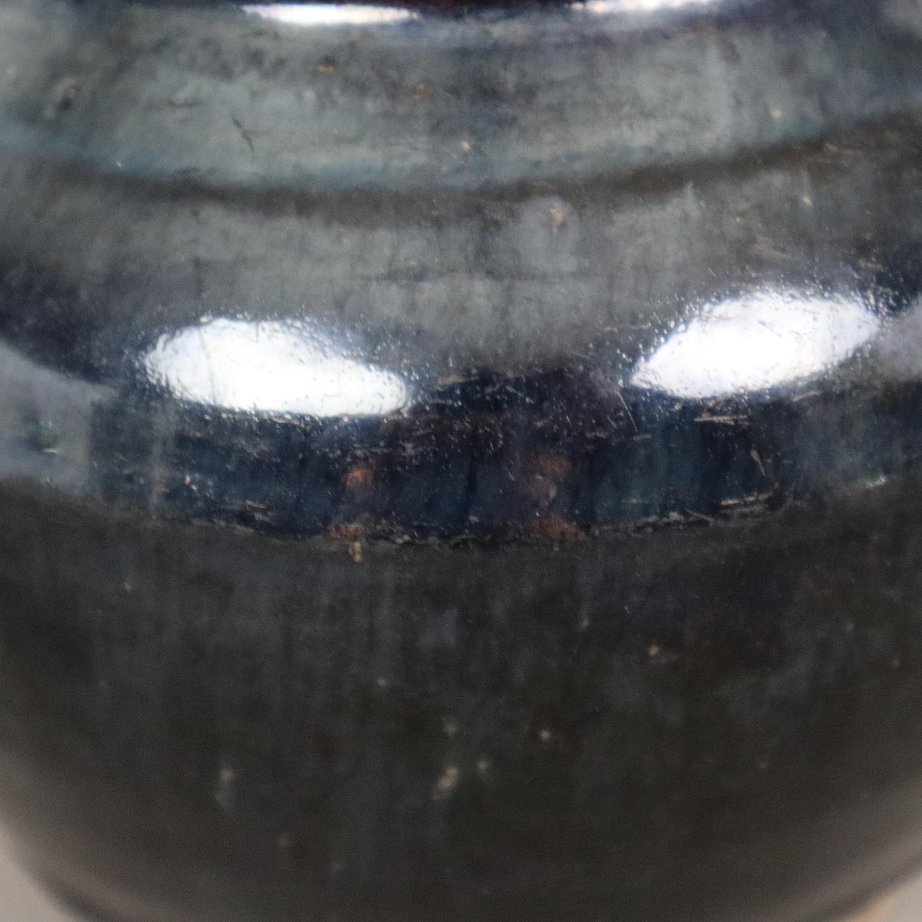 Shoulder pot - China, bulging wall with slightly constricted edge, sand-colored stoneware covered with shiny brown-black glaze shimmering into bluish, cutting out the stand, h. 13 cm, diameter mouth 11 cm, weight approx. 1200 g.