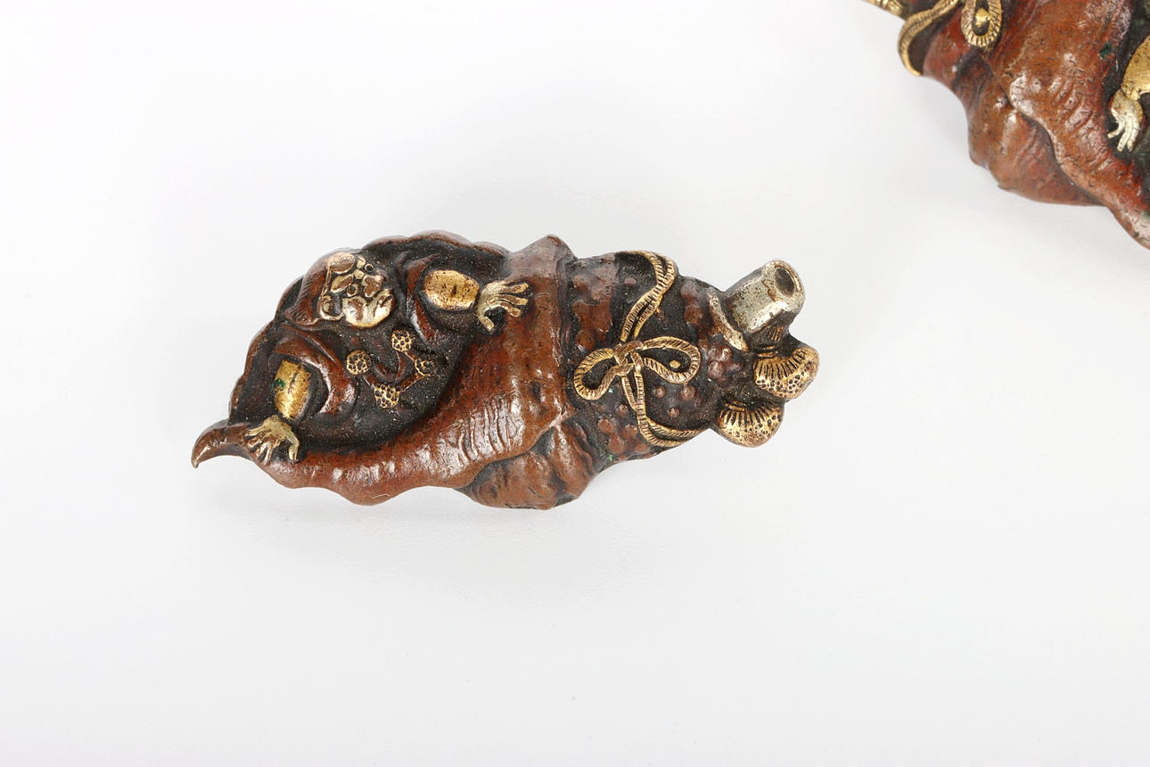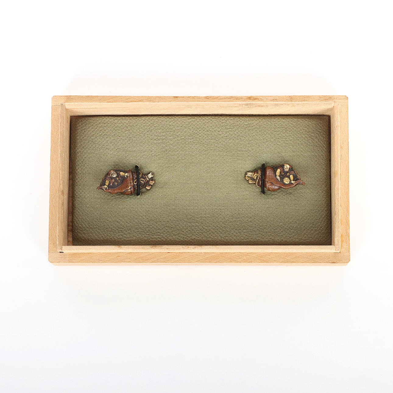 Menuki depicting the warrior monk Benke hiding in a seashell. Japan, signed, 19th century In wooden box.
