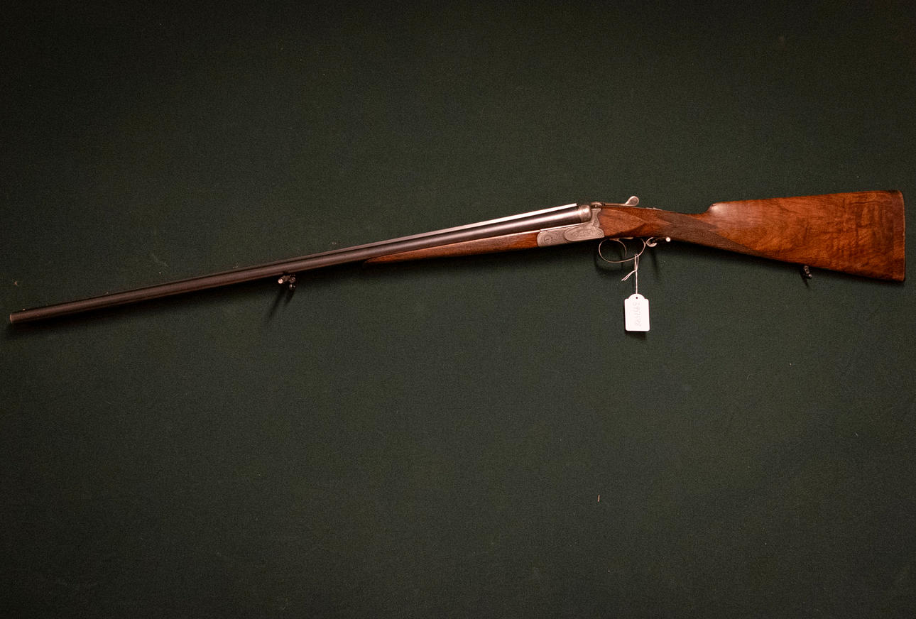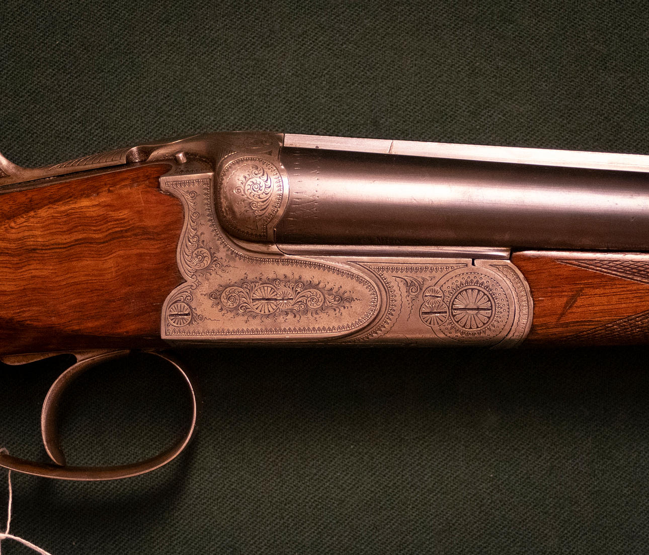 Shotgun German SVs Hammerless. Make W.Forester Berlin. Caliber 20/65. Additional No. 977. Spout length 75cm. Extended spindle with cross bolt. Top liver. Ejector. Lateral ears. Single print. Steel-colored base cooler with very abundant engraving. straight English plunger extended with wooden piece.