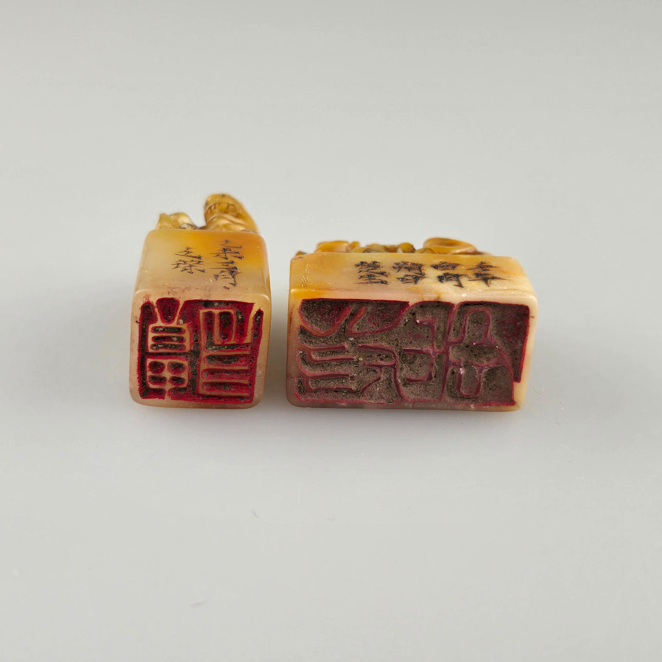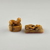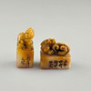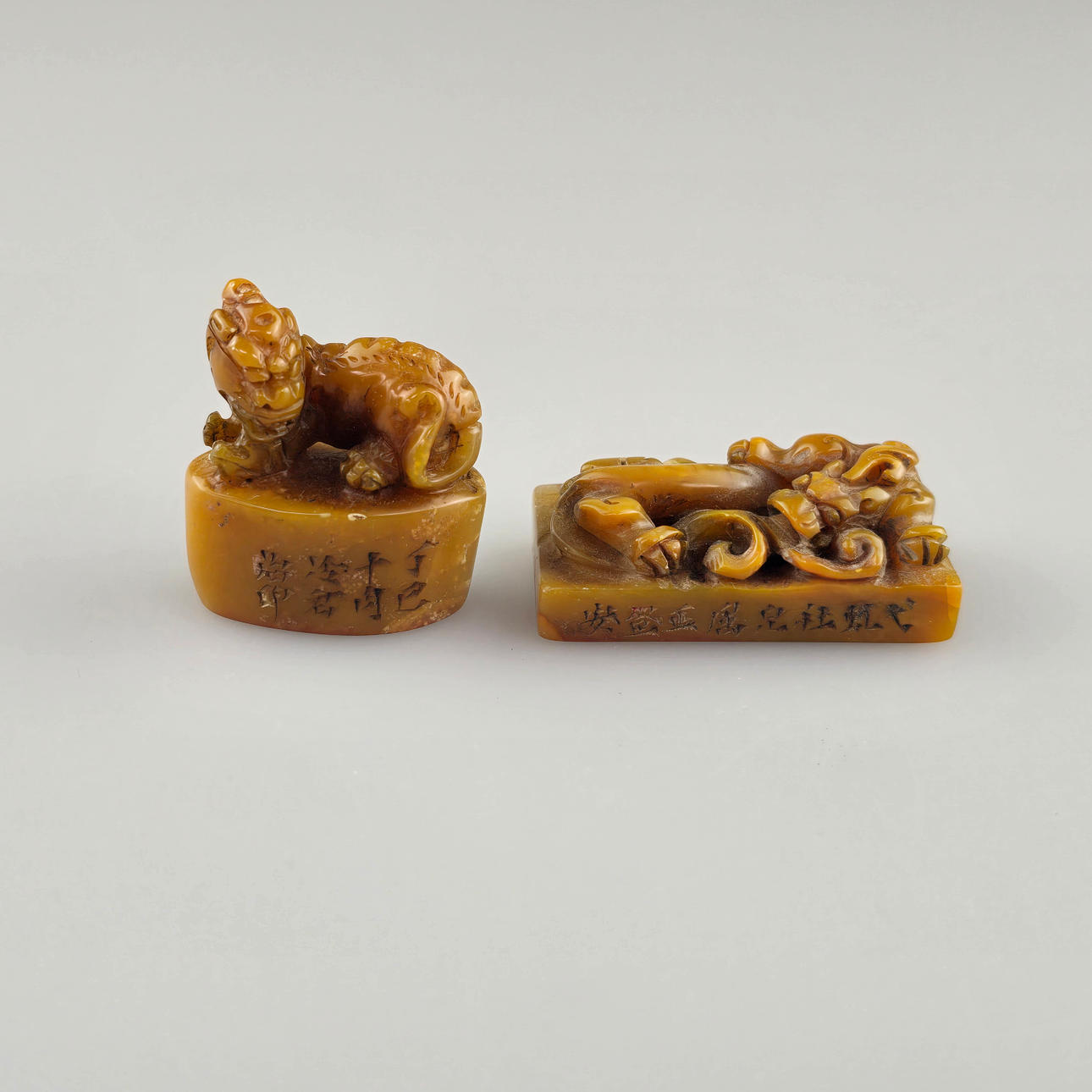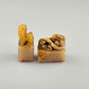 with fully rounded, seated mythical animal representations: Pixiu and dragon, incised inscriptions, characters carved on the underside, h. 1.6 - 4.4 cm, B. 1.8 - 4.6 cm, total weight approx. 118 g.