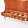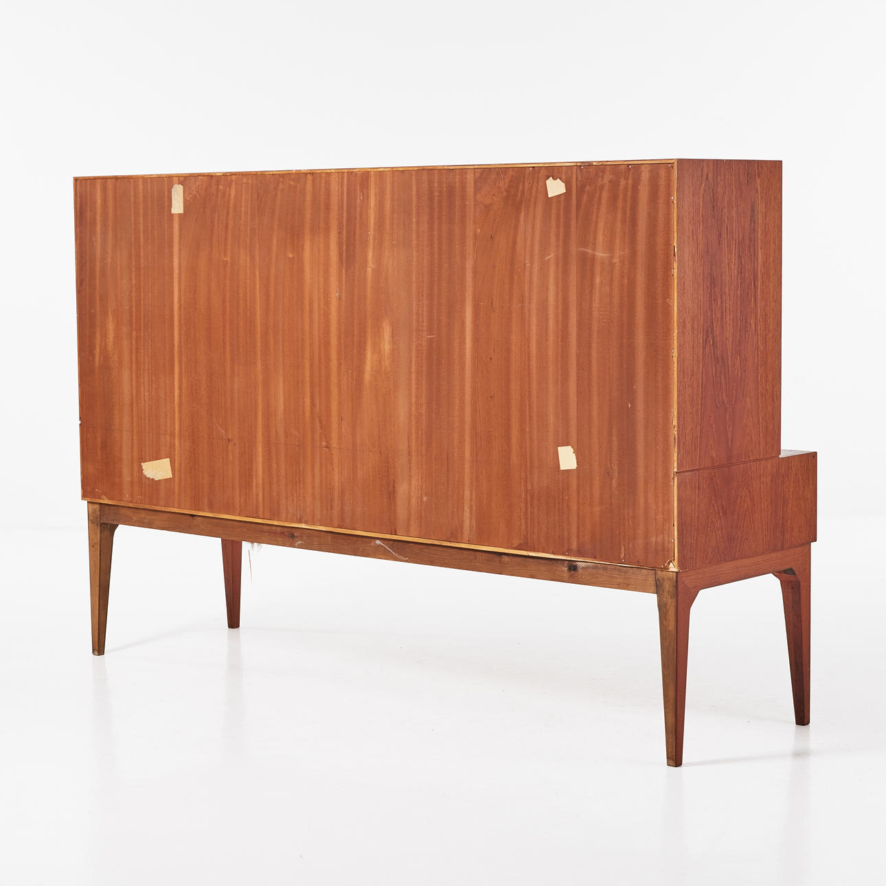 Veneered with teak. Top with two sliding doors with rear shelf interior. Bottom with four drawers. Length 190 cm, width 53 cm, height 124 cm.