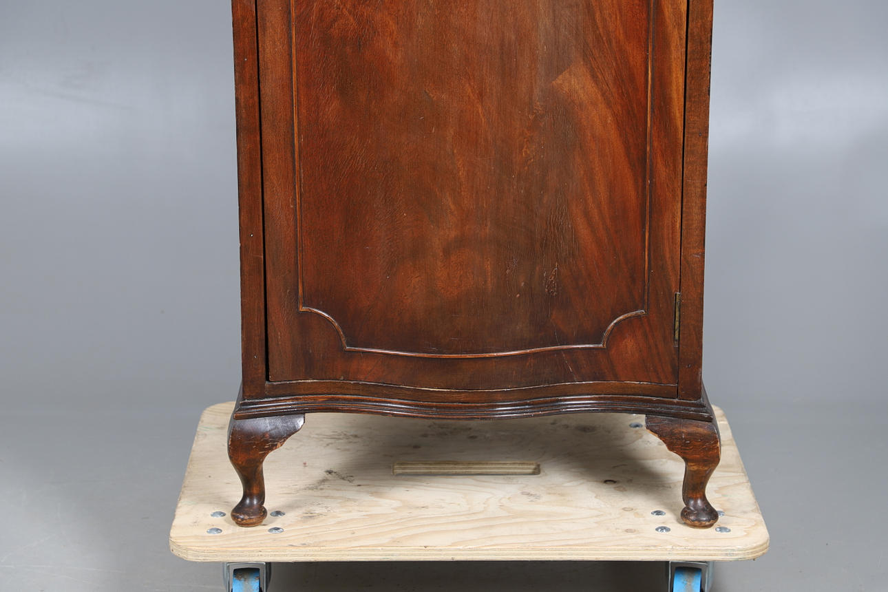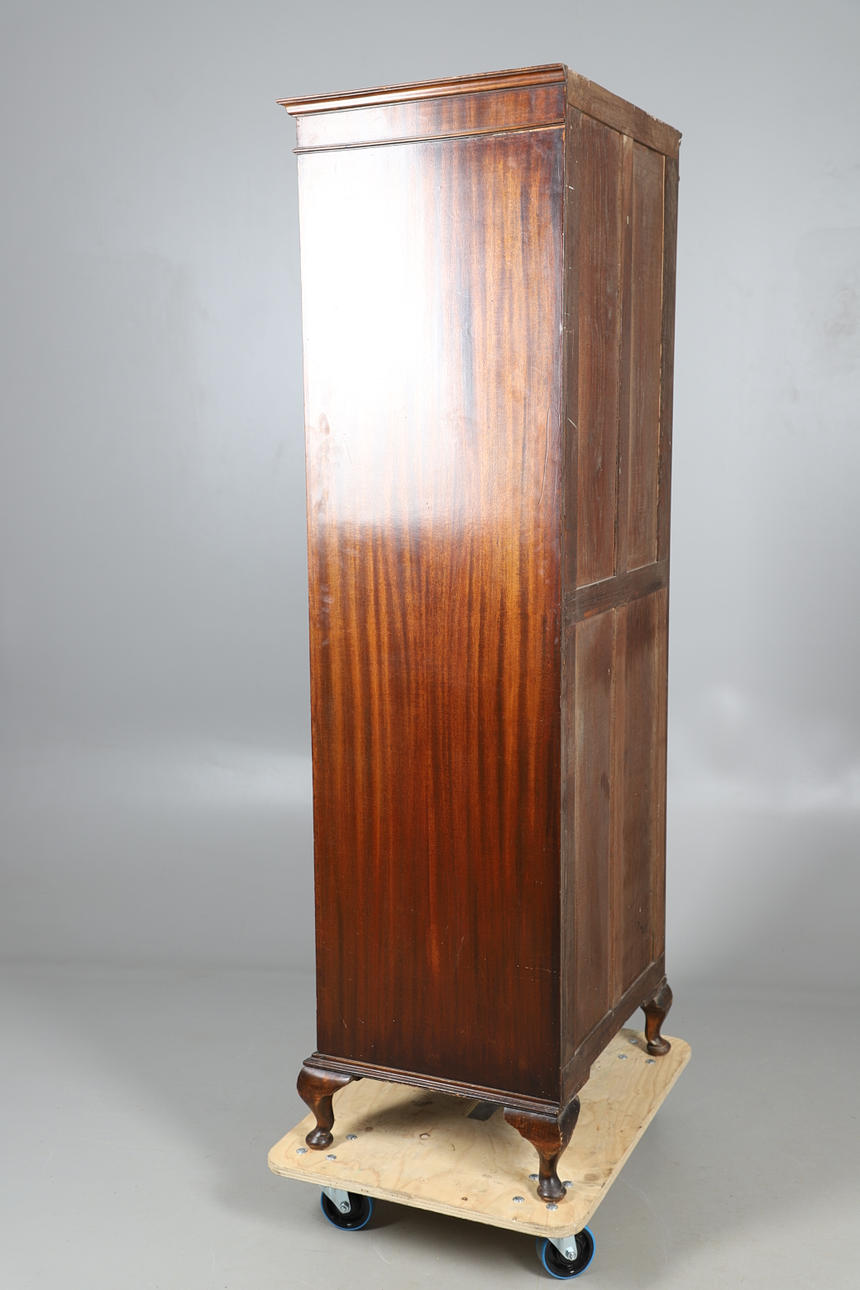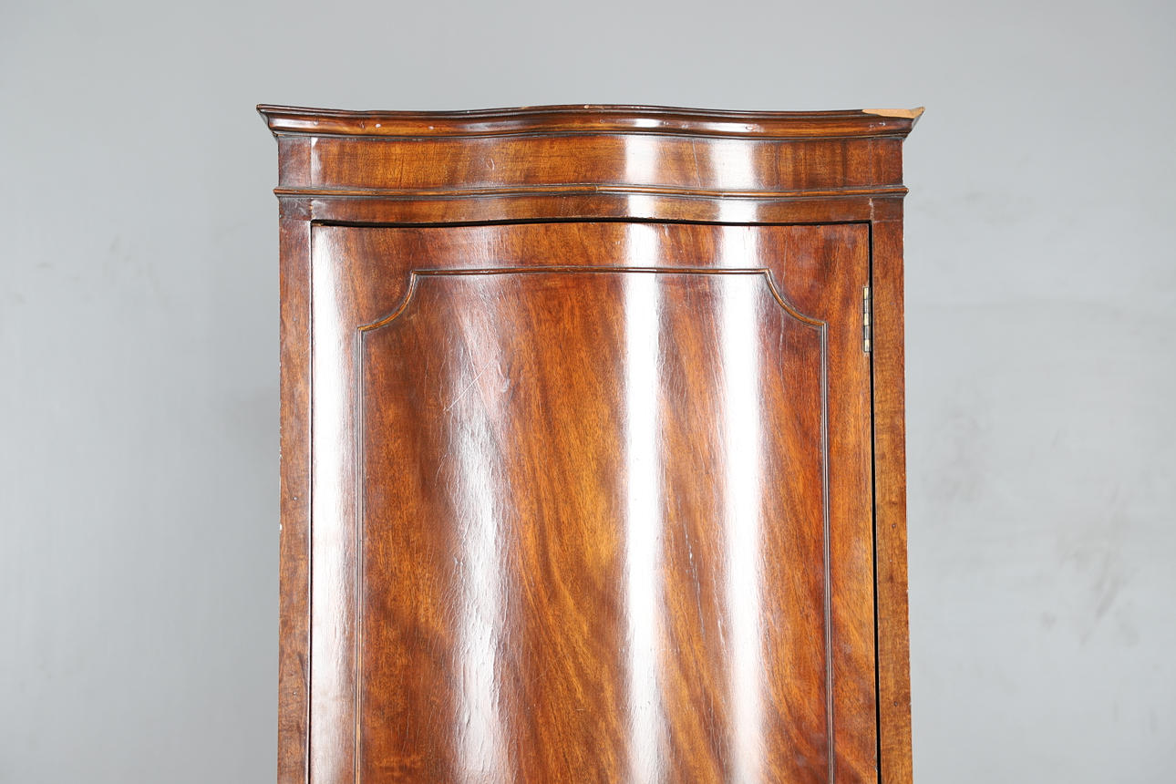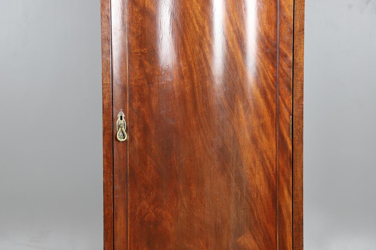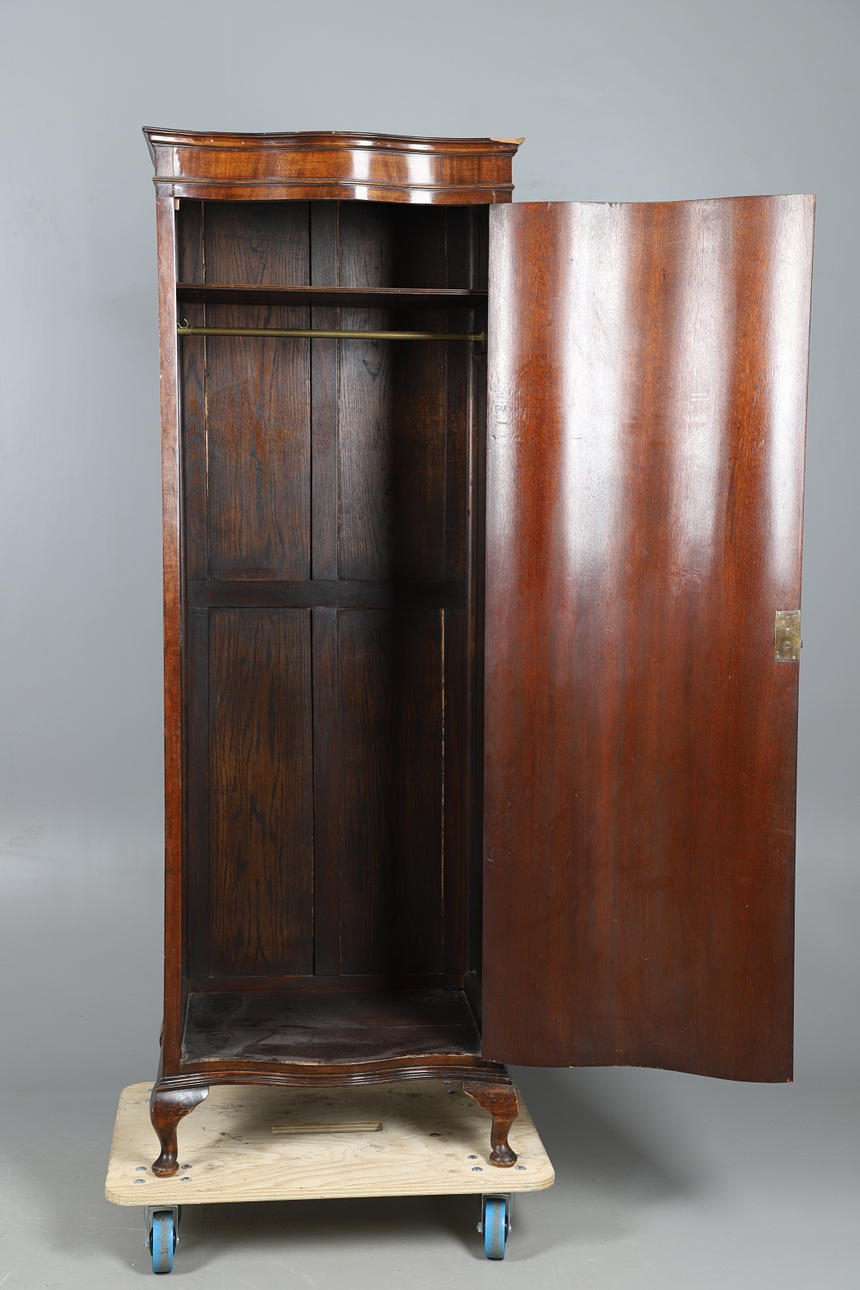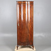 With a singular door opening to reveal a shelf to the top and a metal rail underneath. Height 183cm, width 65cm, depth 50cm.