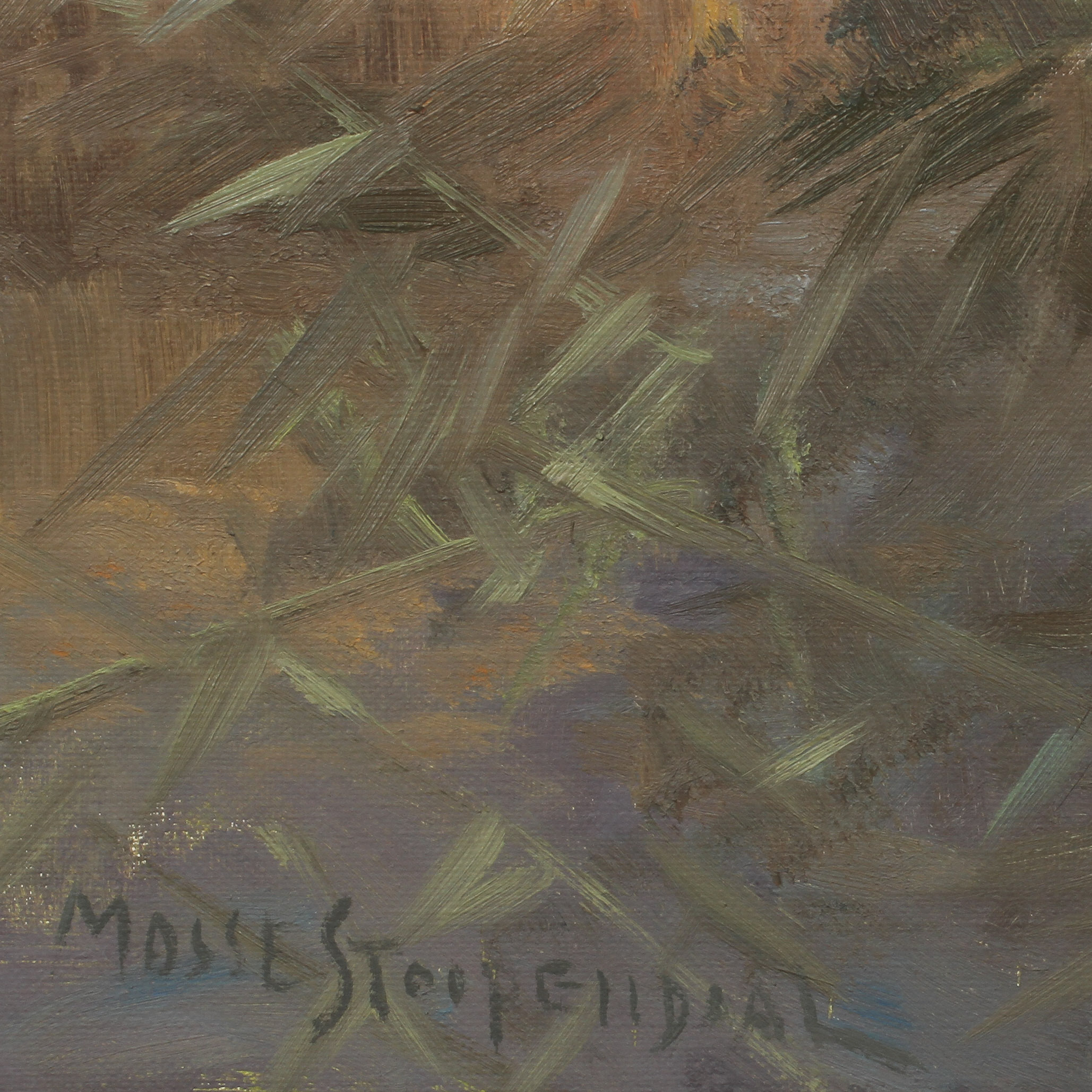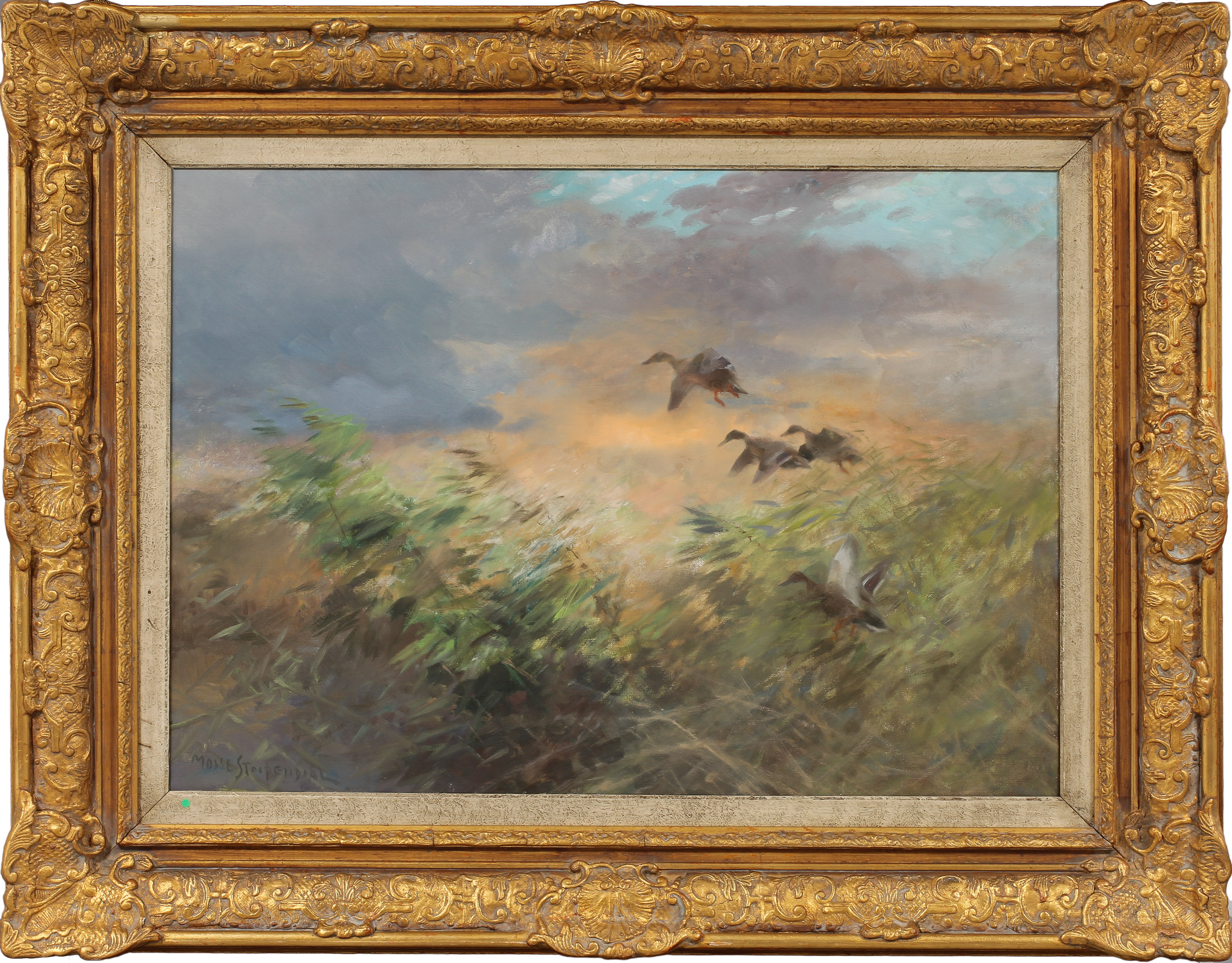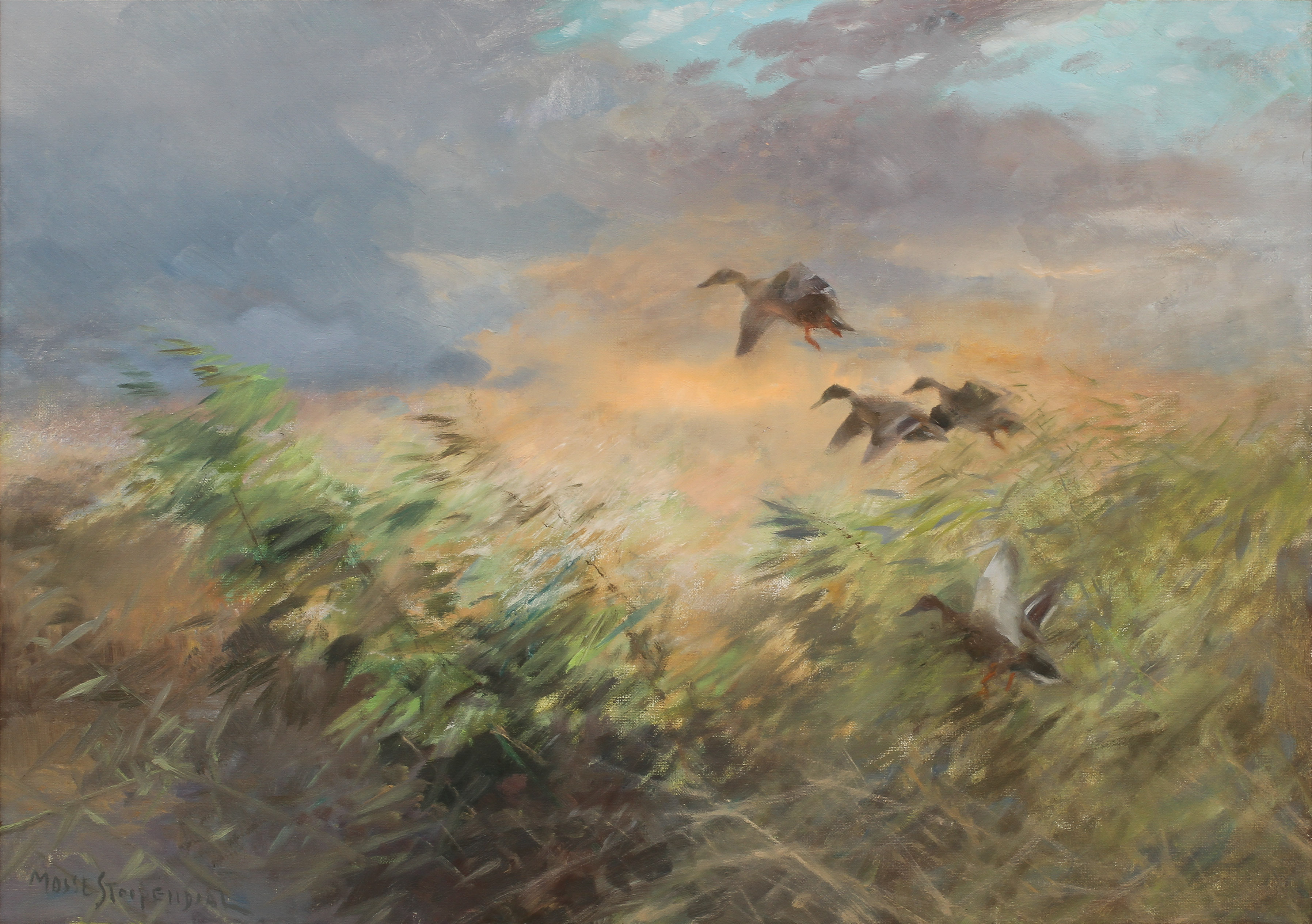 395540. MOSSE STOOPENDAAL. "Ducks in the reeds", oil on canvas, signed and dated 1944.