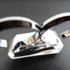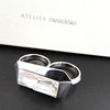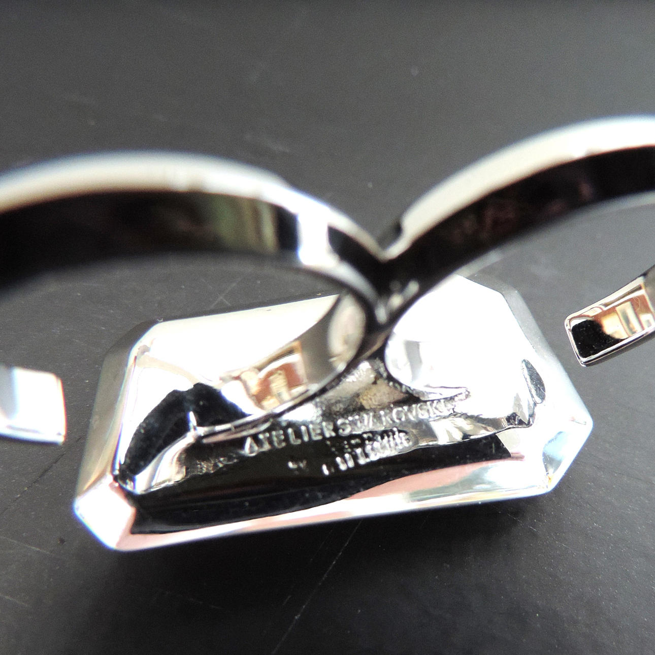 An Atelier Swarovski Jean Paul Gaultier, the reverse double ring features the designer’s Kaputt crystal cut. The dramatic clear stone centerpiece is encased in sculptured rhodium-plated metal. Ring sizes are O1/2 & R1/2.