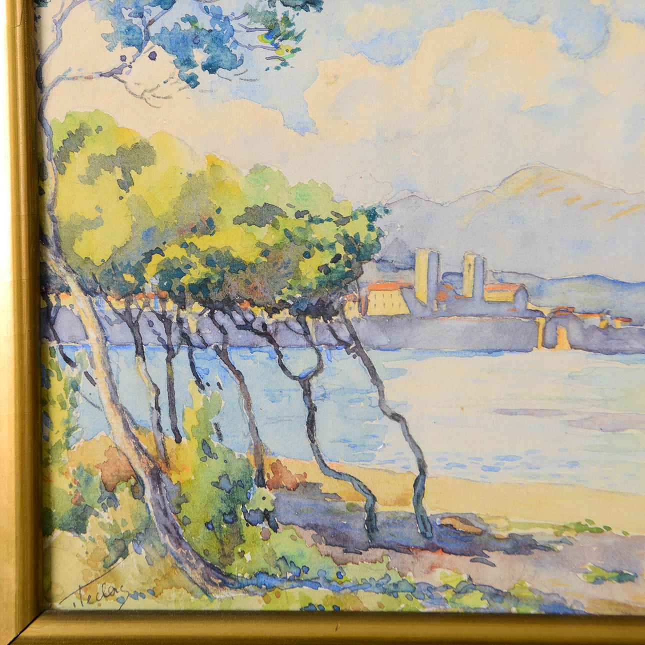 3957282. OIDENTIFIERAD KONSTNÄR. Landscape with city, watercolour, signed, probably 19th century.