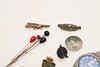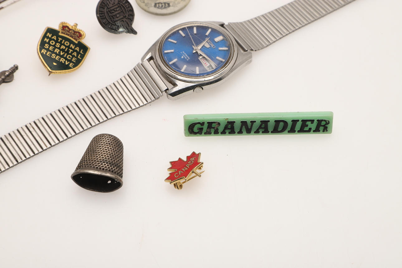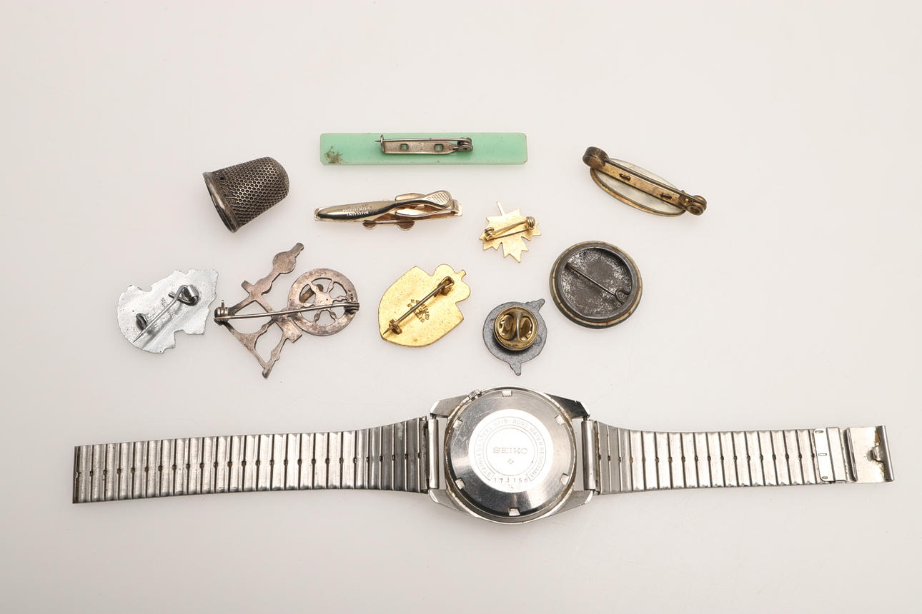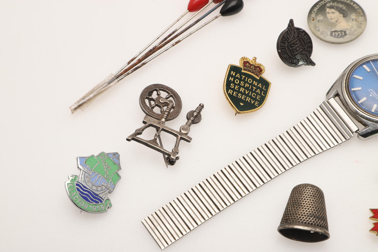 Including a miniature carriage clock with a blue enamel case and black numerals, stamped to the base 'Made in Germany' (4.5cms high), a silver brooch in the shape of a spinning wheel, Seiko watch, badges etc.