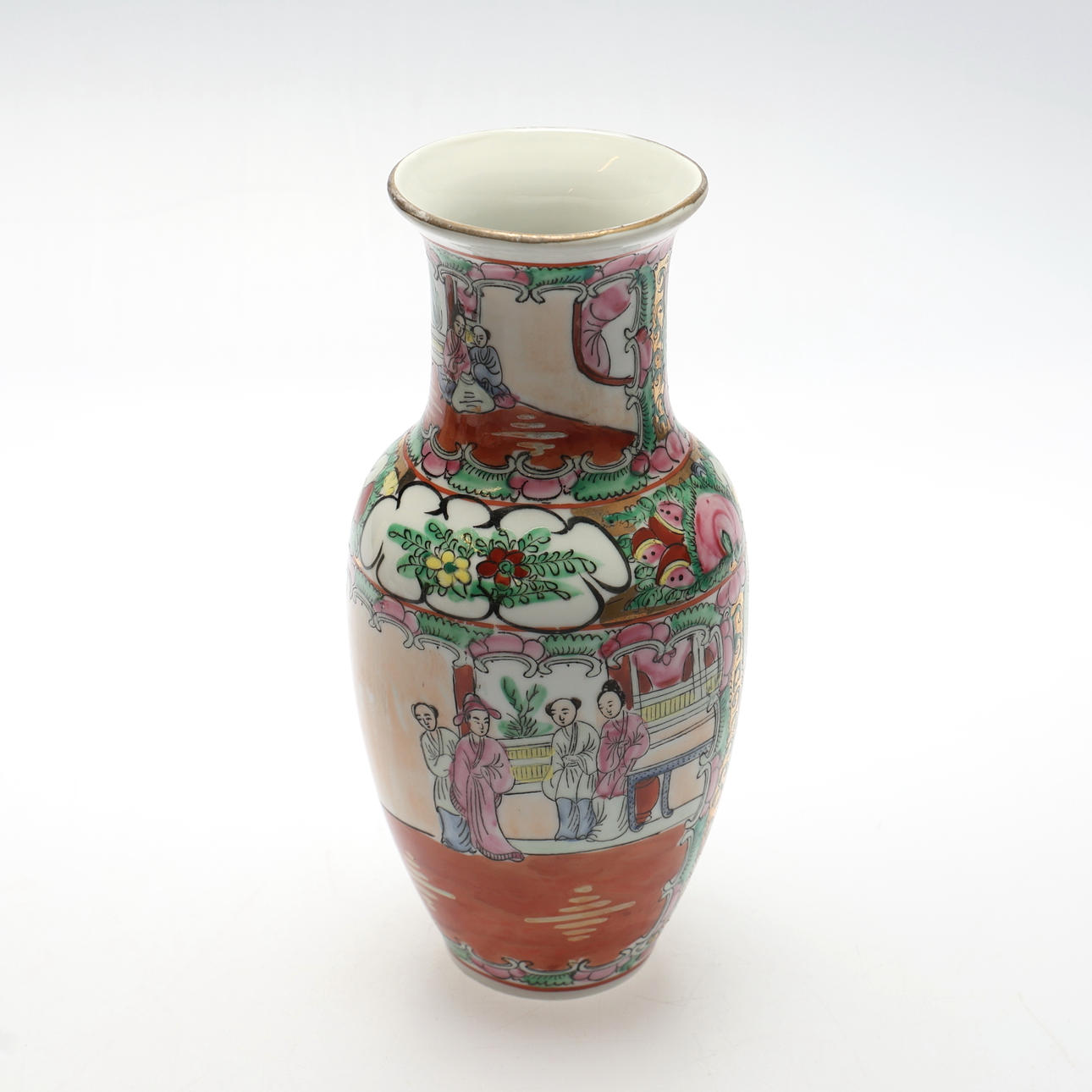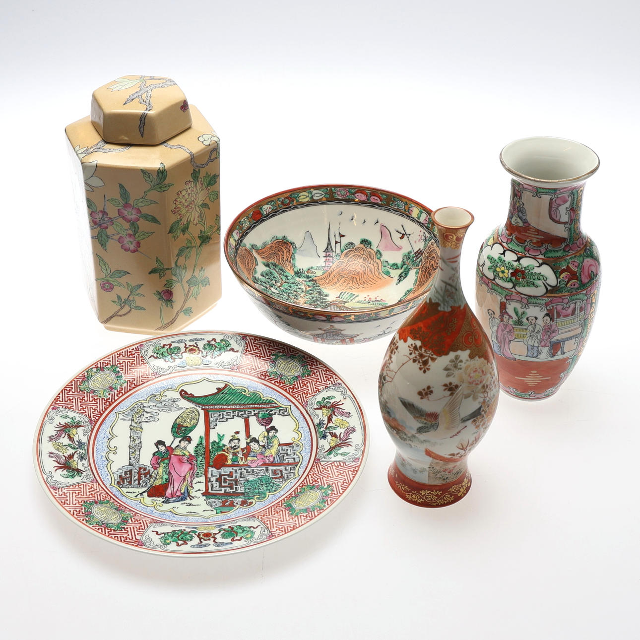 2 vases, height about 22-24 cm. 1 plate, diameter approx. 26 cm. 1 bowl, diameter approx. 20.5 cm. 1 urn with lid, height approx. 22 cm.