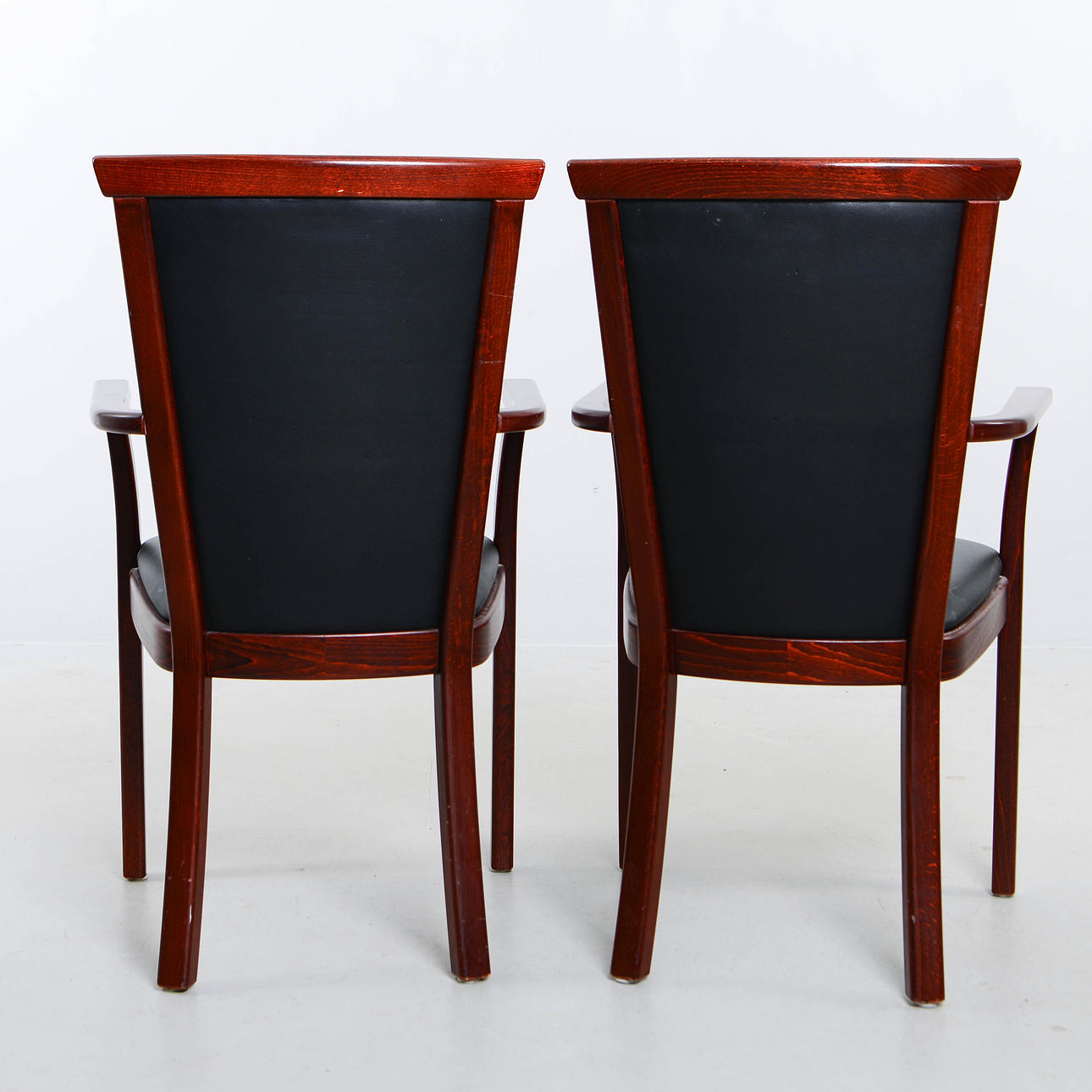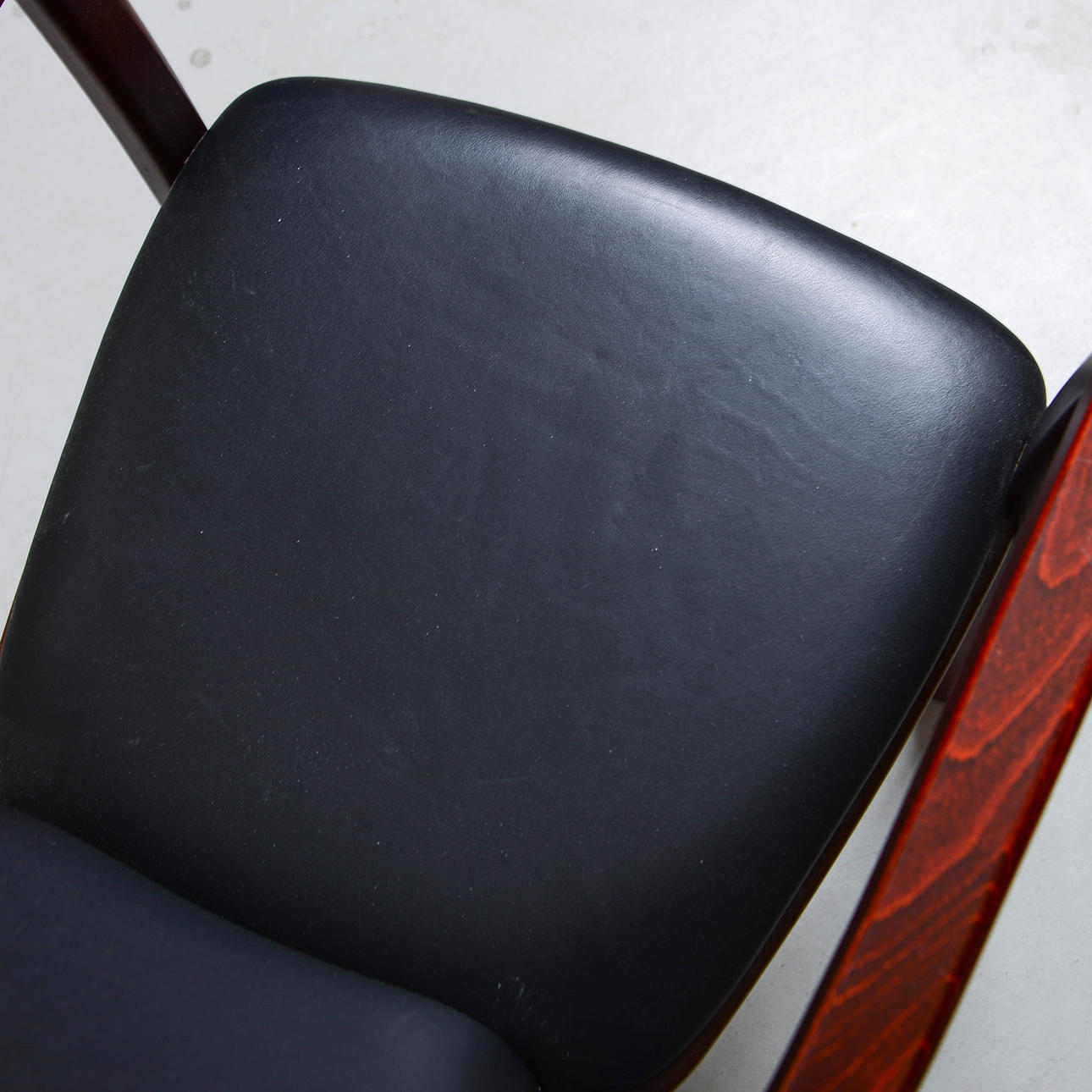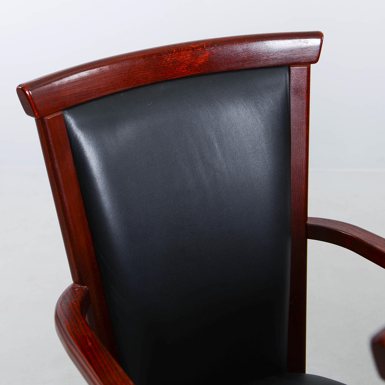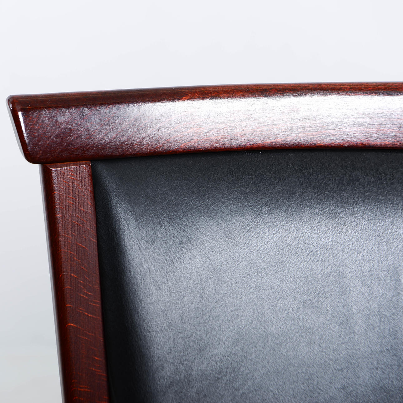 Stained wooden frame with seat and back upholstered in black artificial leather.