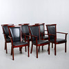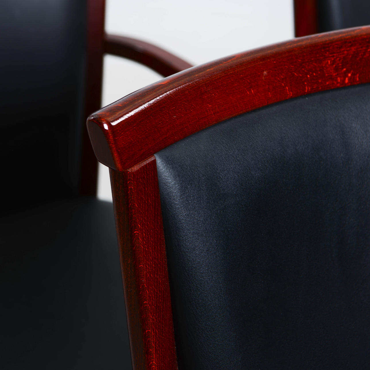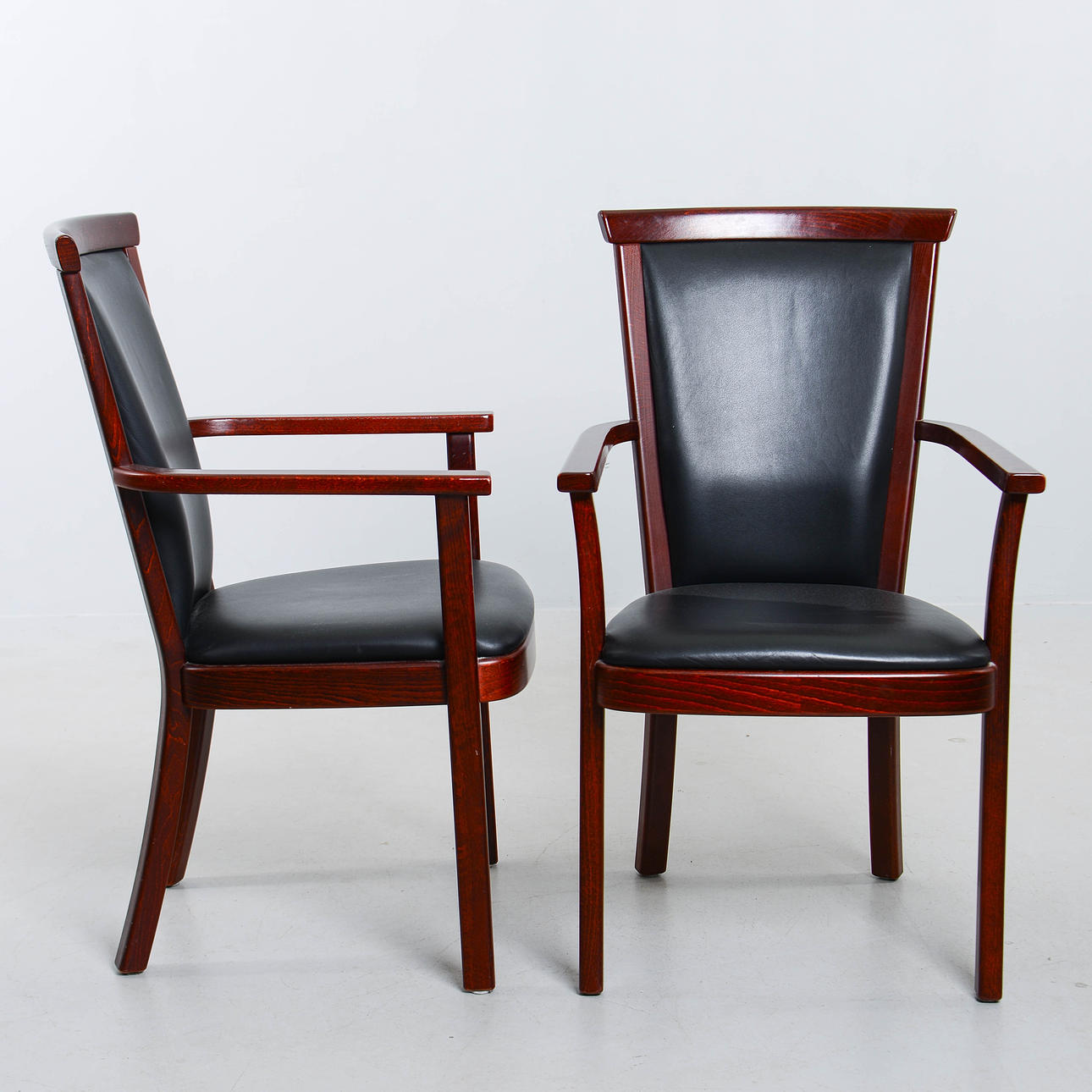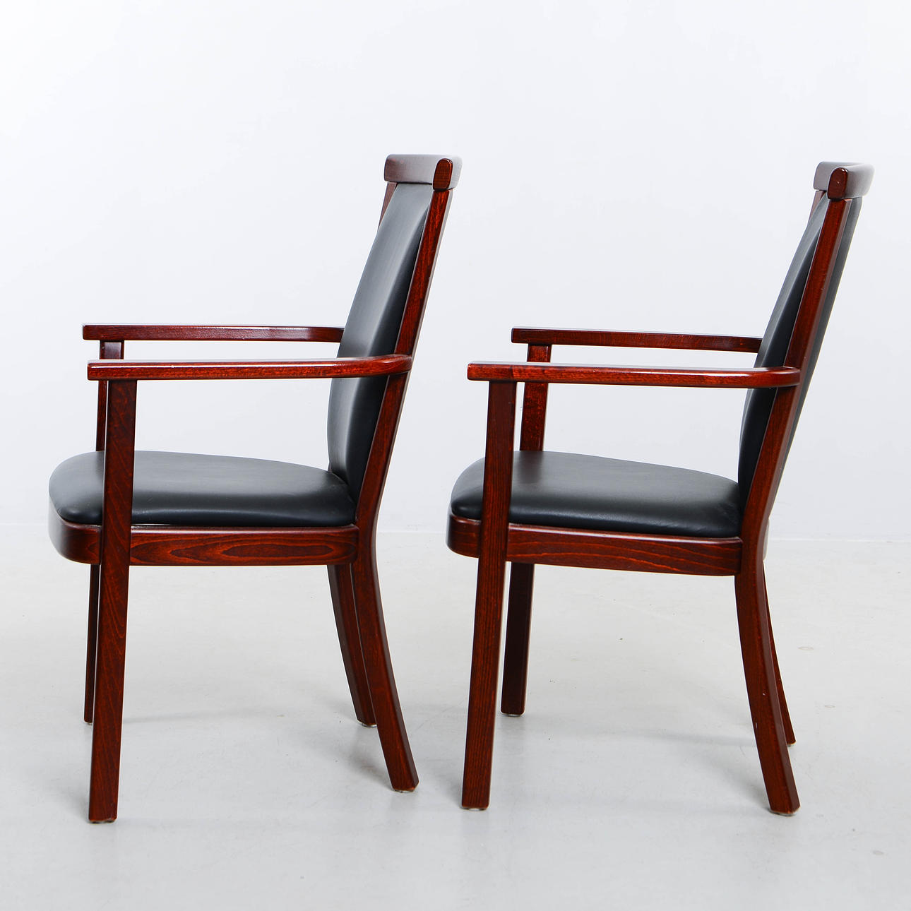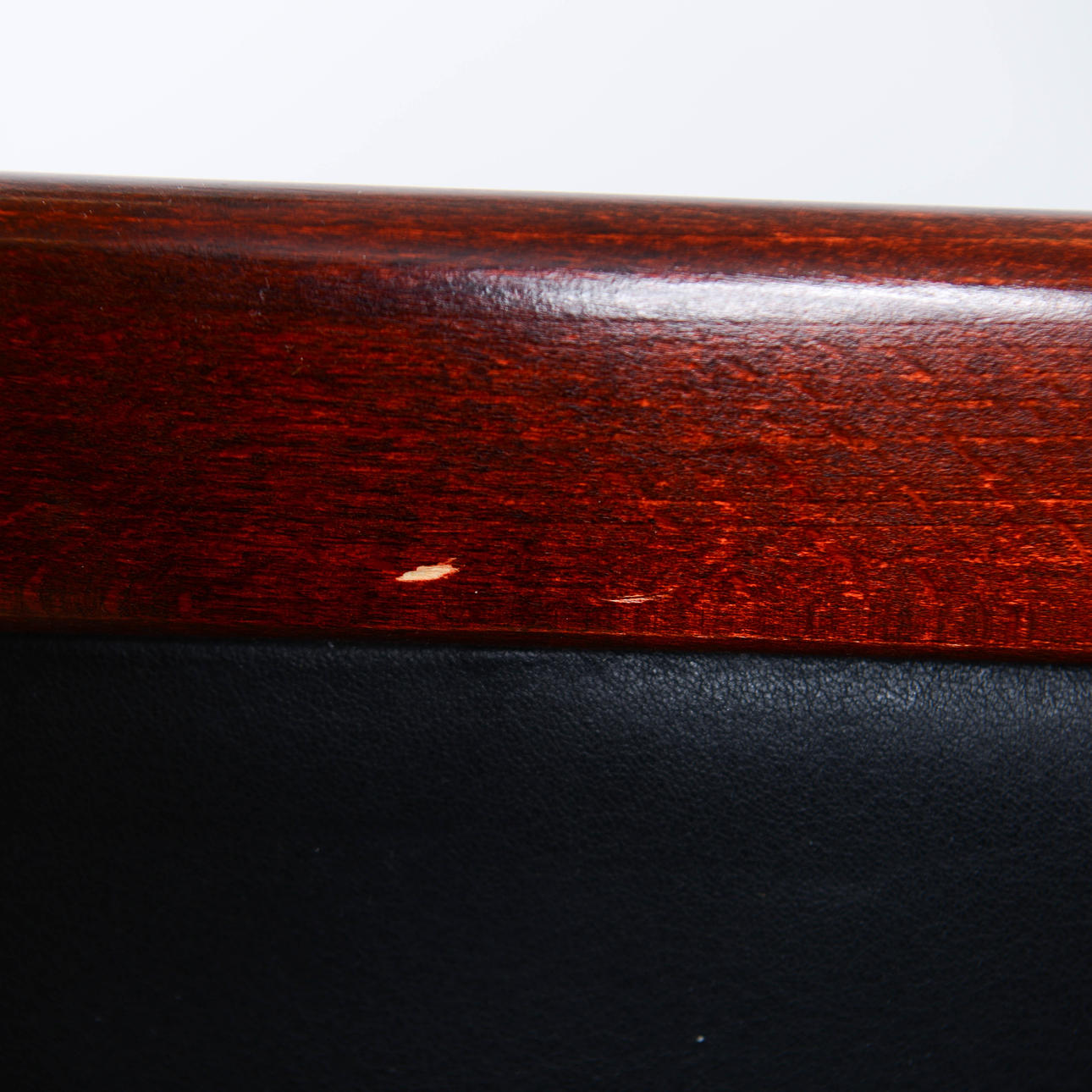 Stained wooden frame with seat and back upholstered in black artificial leather.