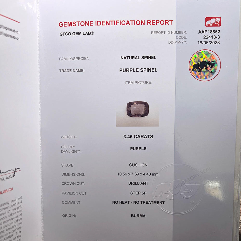 3.45ct Natural Untreated Purple Spinel. Cushion Cut Burma origin. GFCO certified.