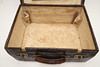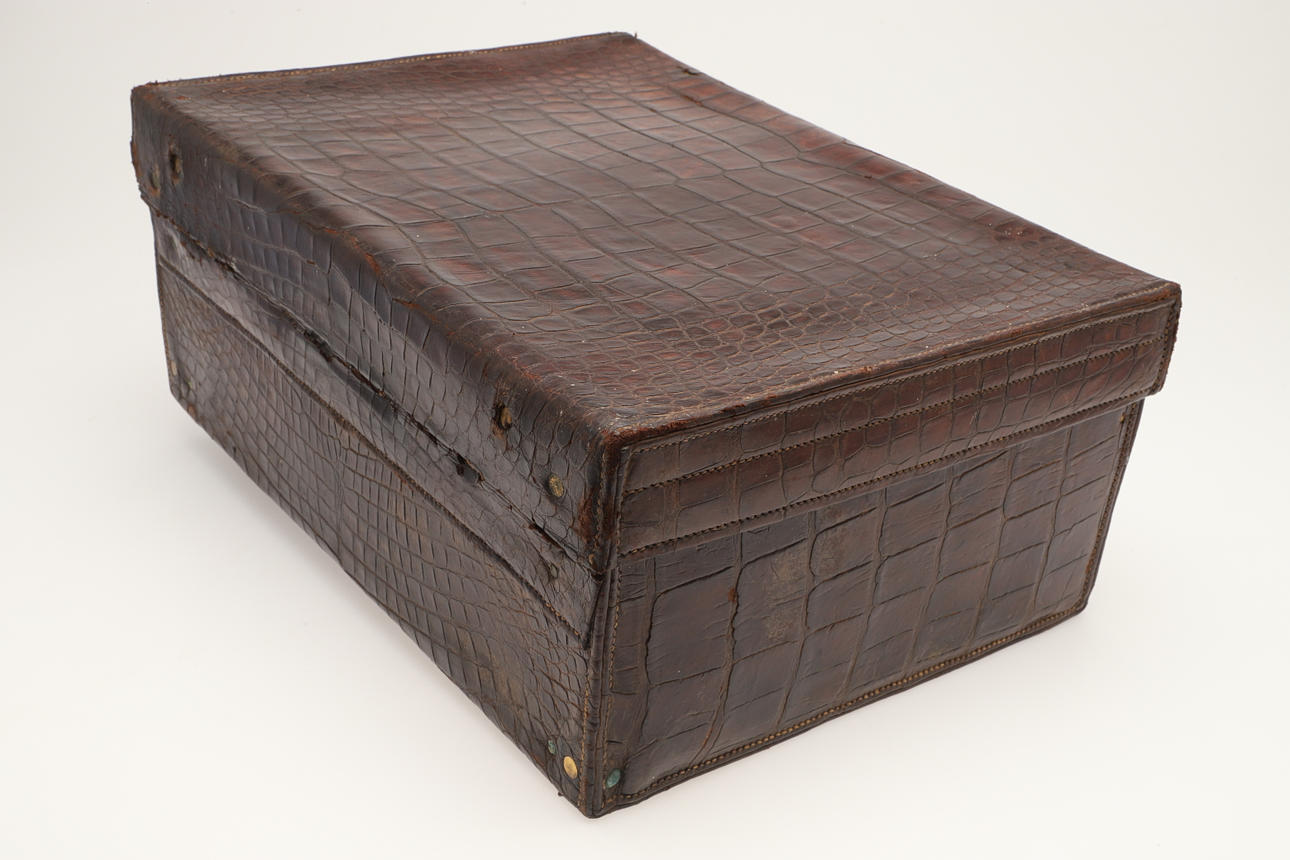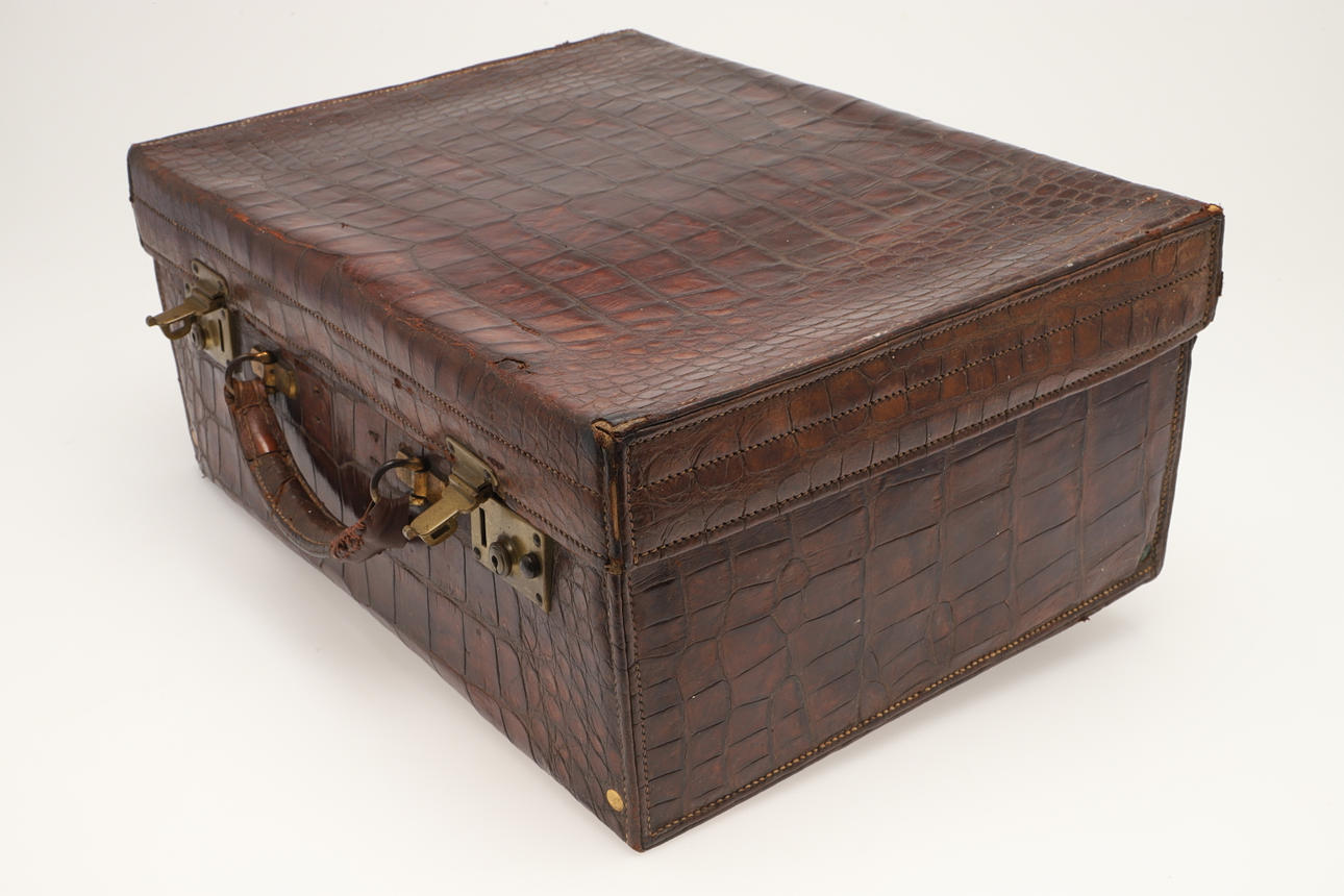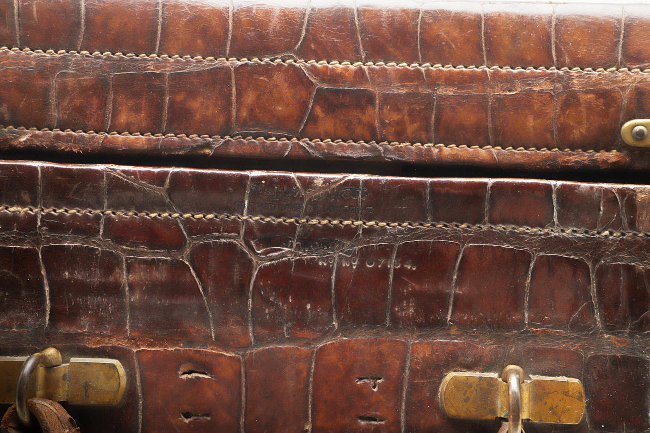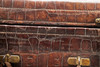 A vintage crocodile skin suitcase with brass lock plates and catches, with an internal pocket and carrying handle. Stamped with a makers name and registration number. 51cms by 38cms, 22cms high.