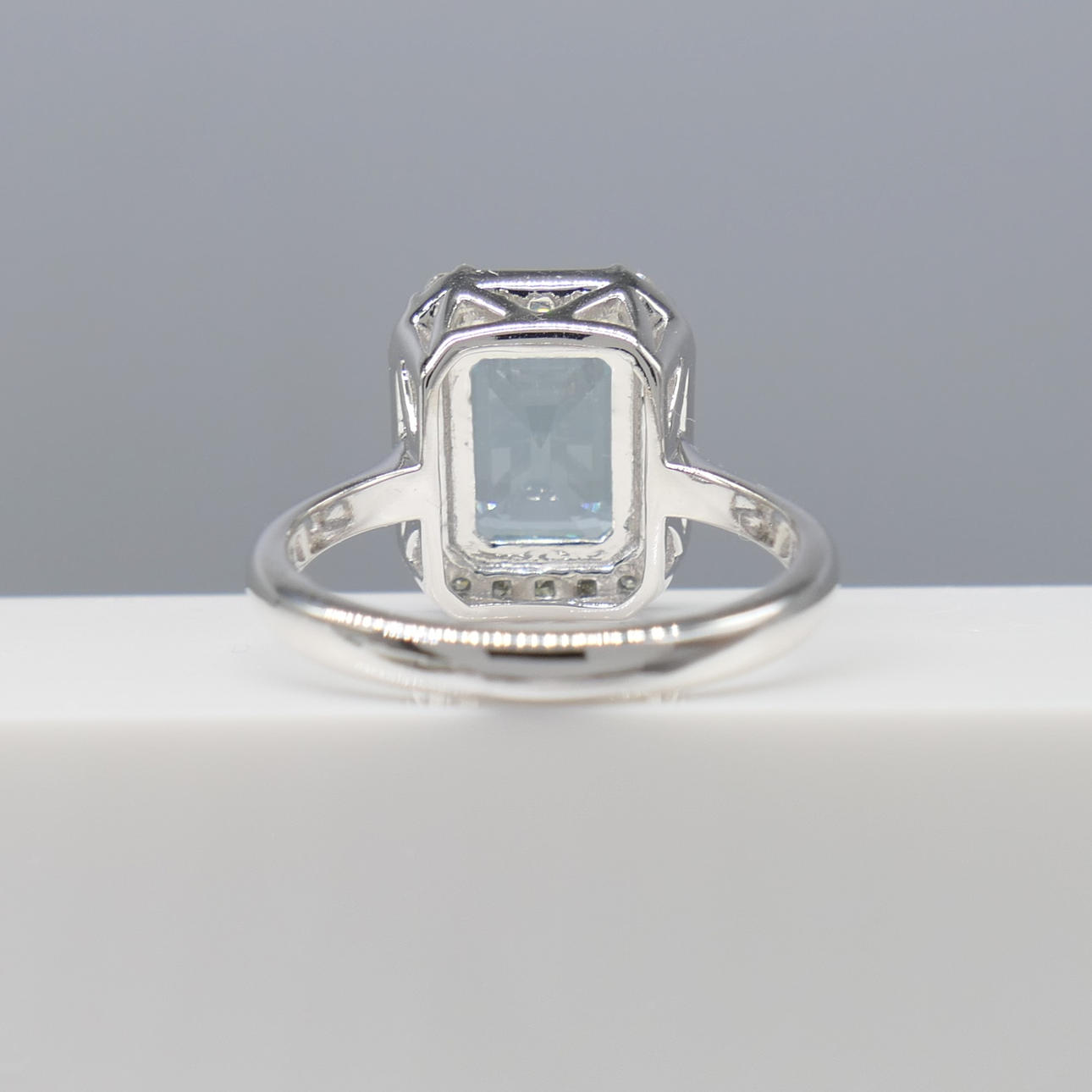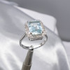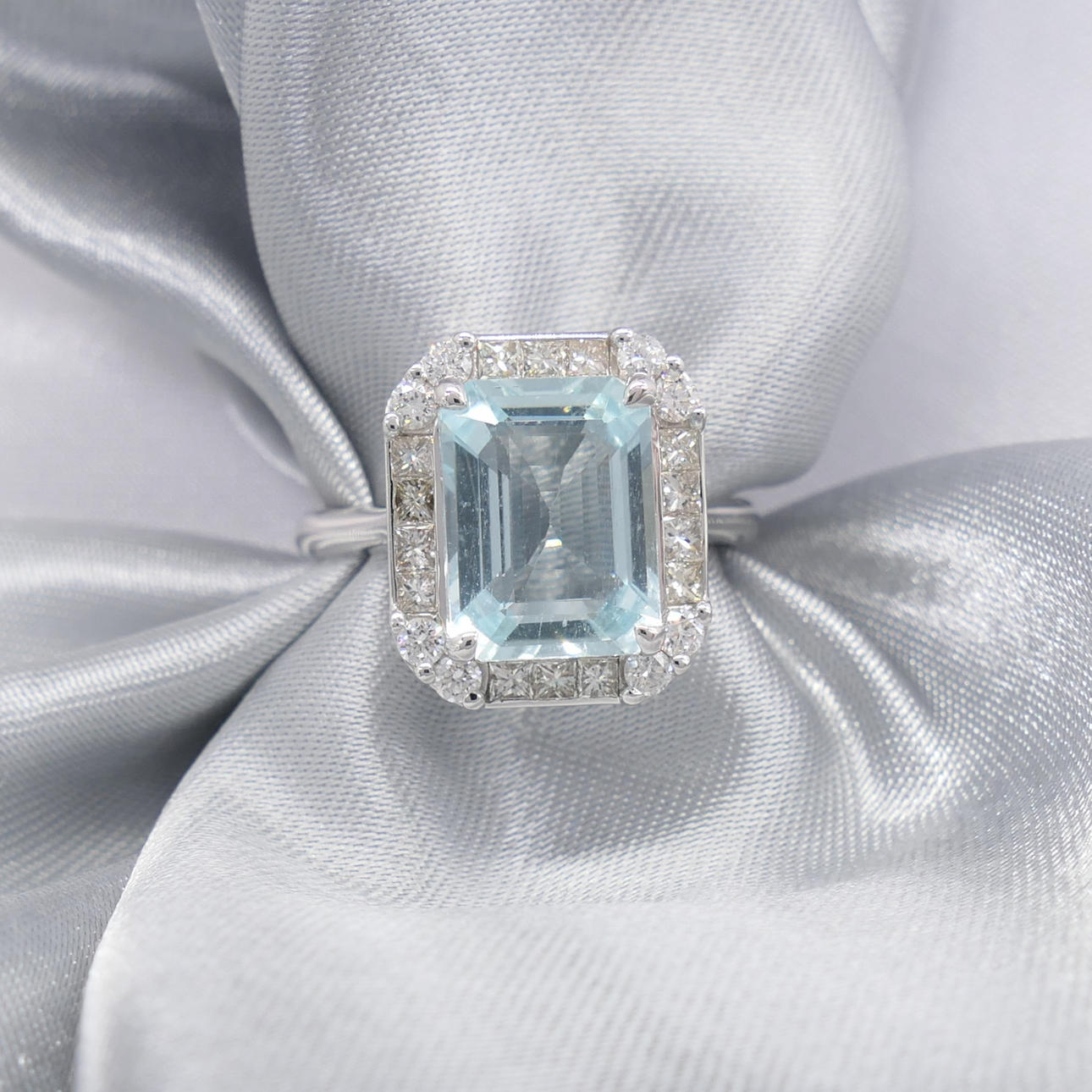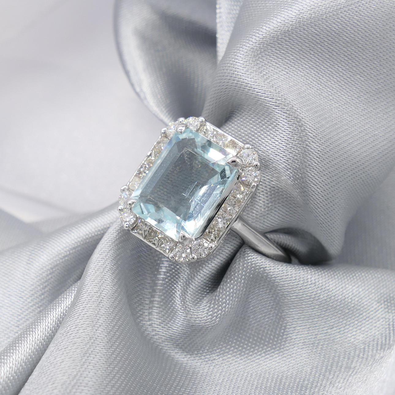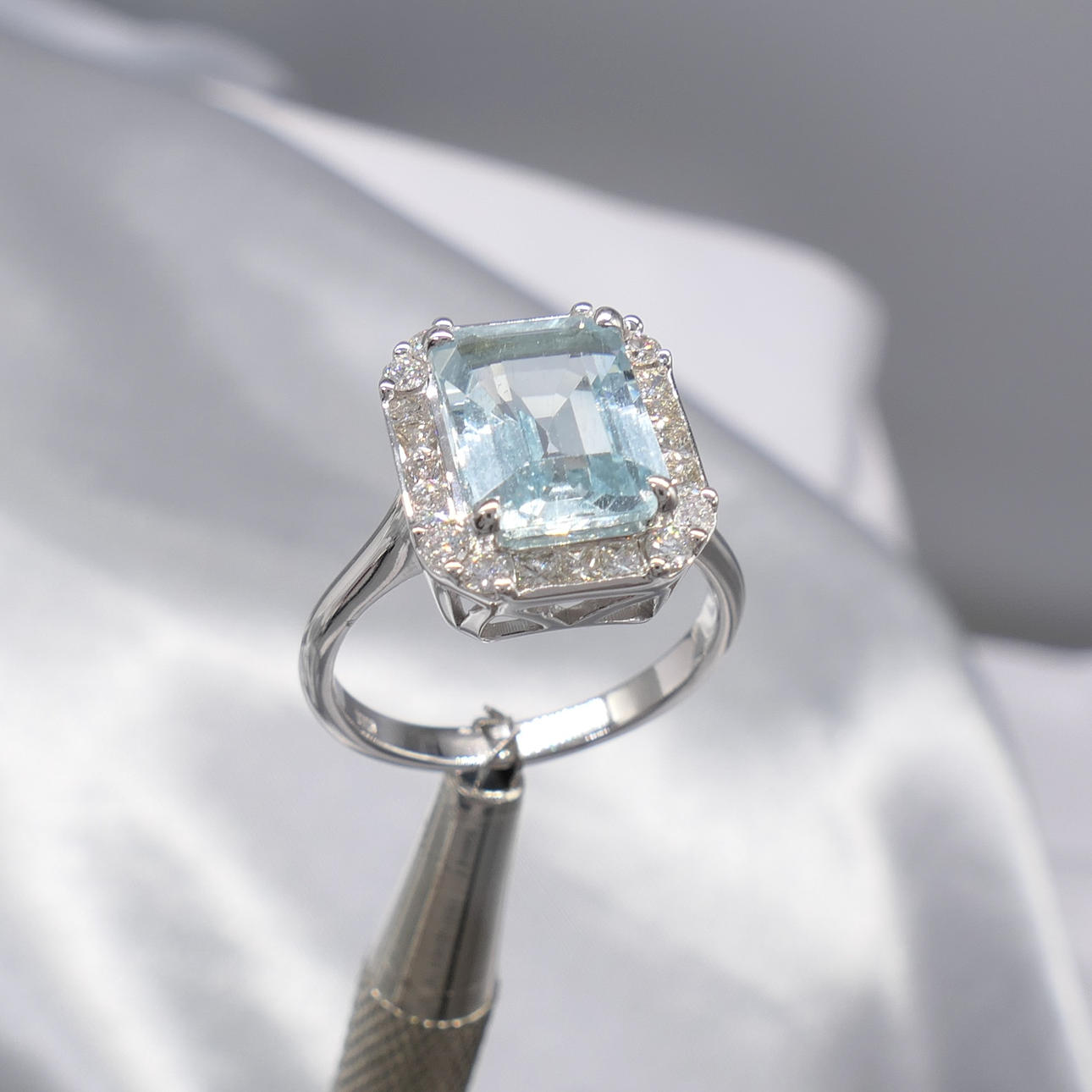 A stunning 18k white gold ring set with a central aquamarine and surrounding diamonds
